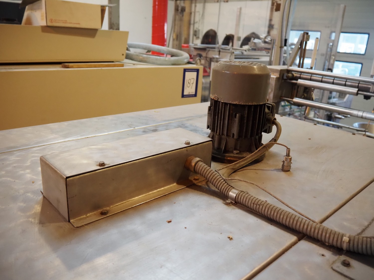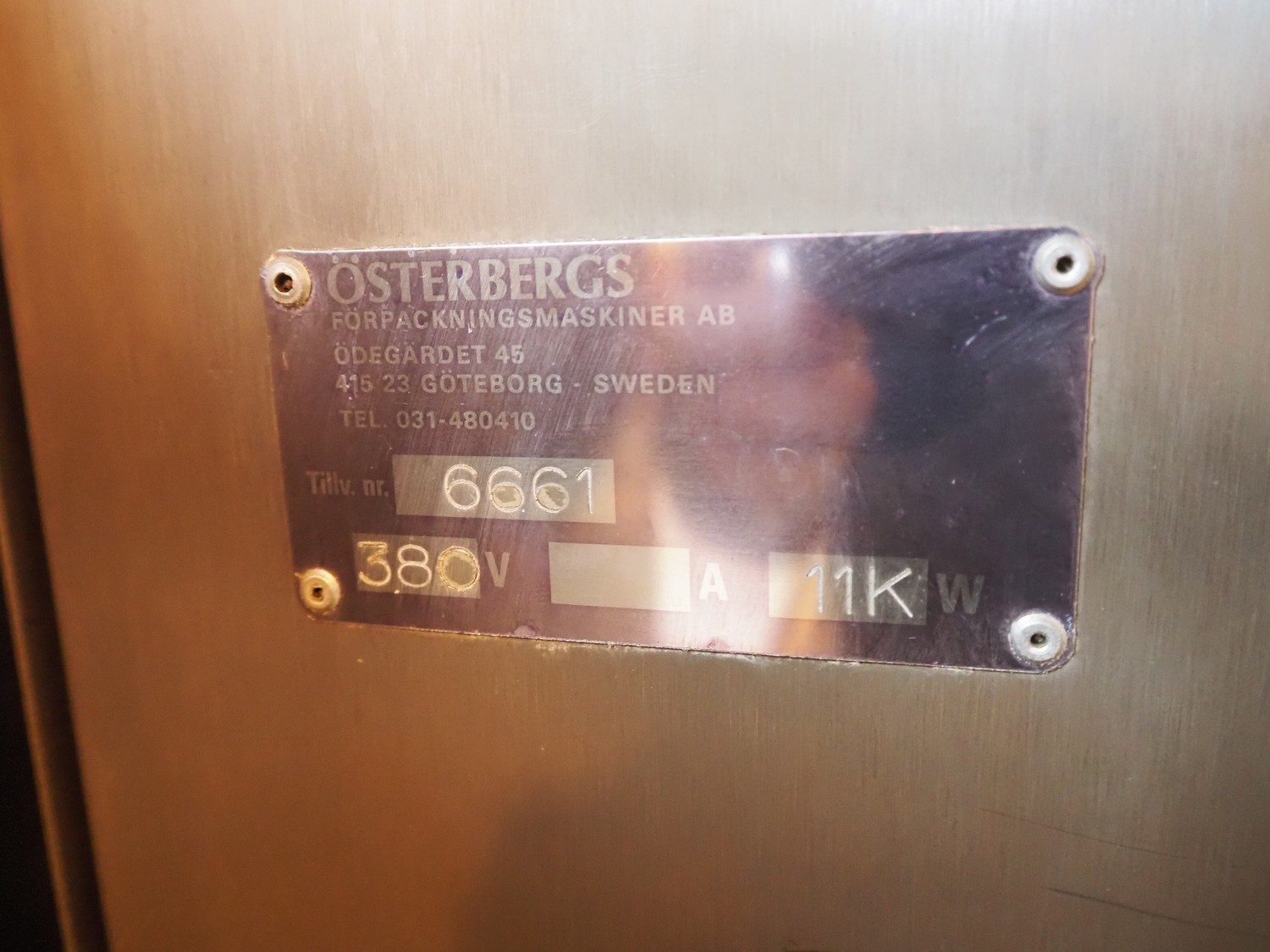 Österbergs shrink packaging machine, number: 6661, 380 V, 11 kW, Teflon belt, belt width: 700 mm, clearance: 670 mm x 320 mm, total dimensions: 3450 mm x 1400 mm x 1800 mm.