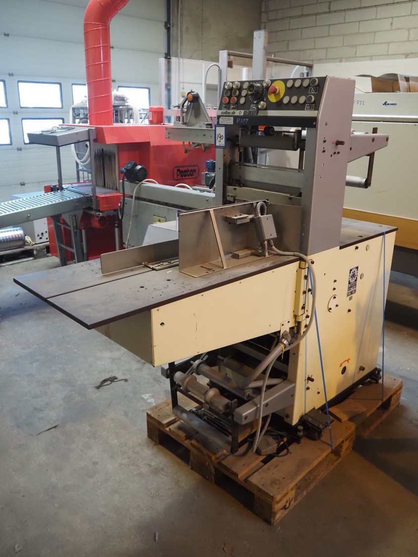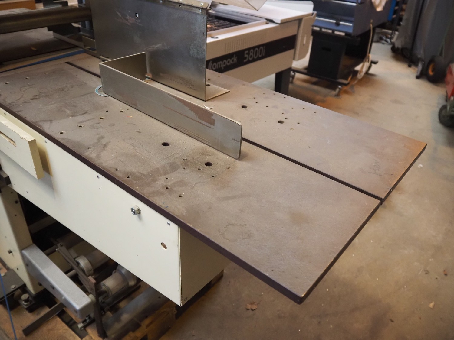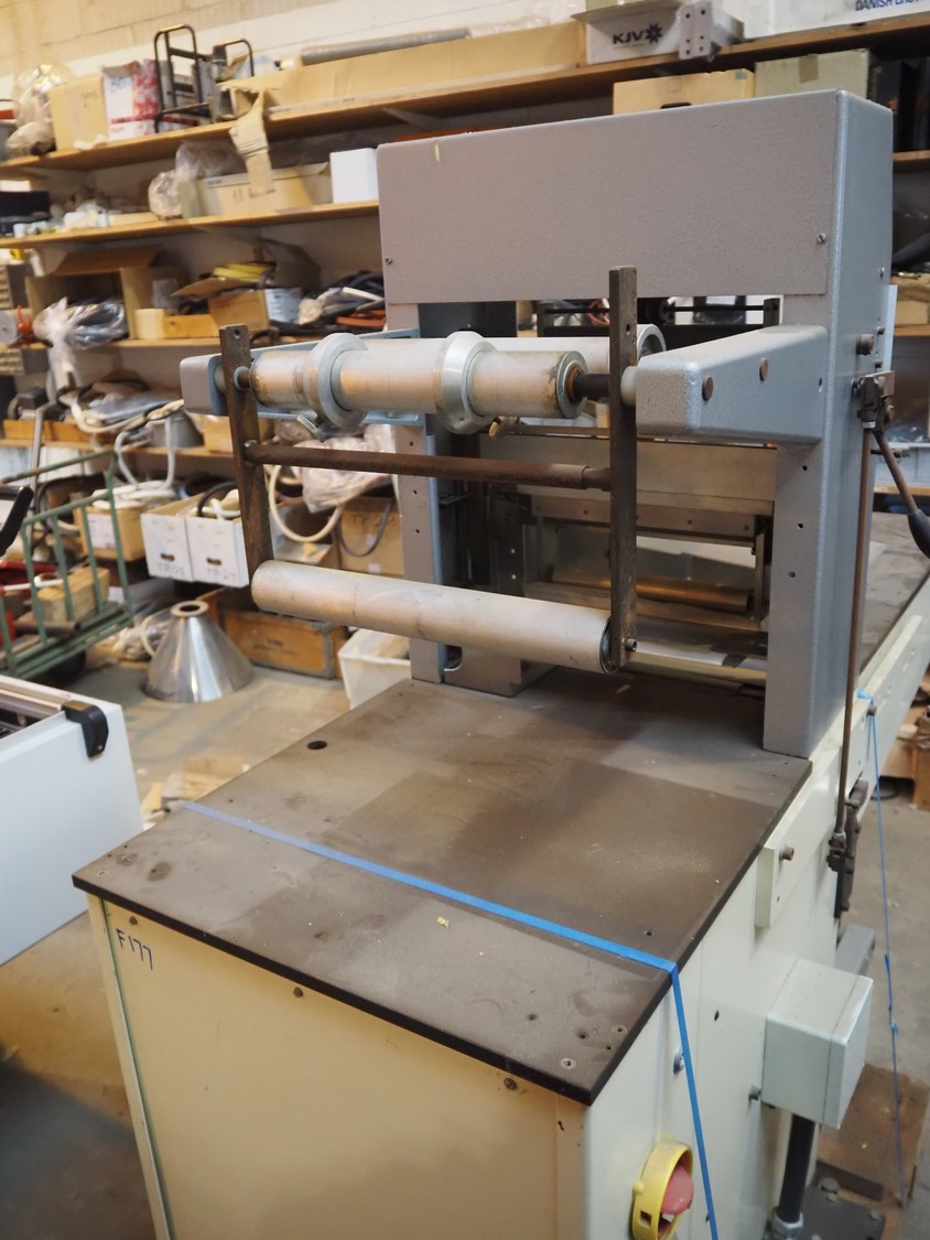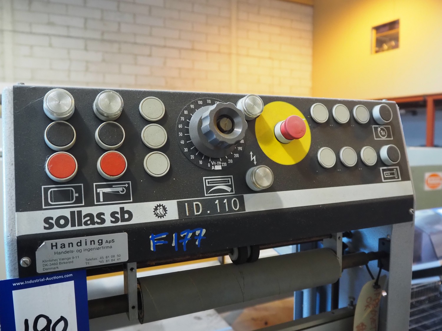 Sollas SB stretch film packaging machine, type: SB 250, serial number: 21-7, 220-380 V, 600 W, foot control, working width: 270 mm, total dimensions: 1700 mm x 650 mm x 1550 mm.