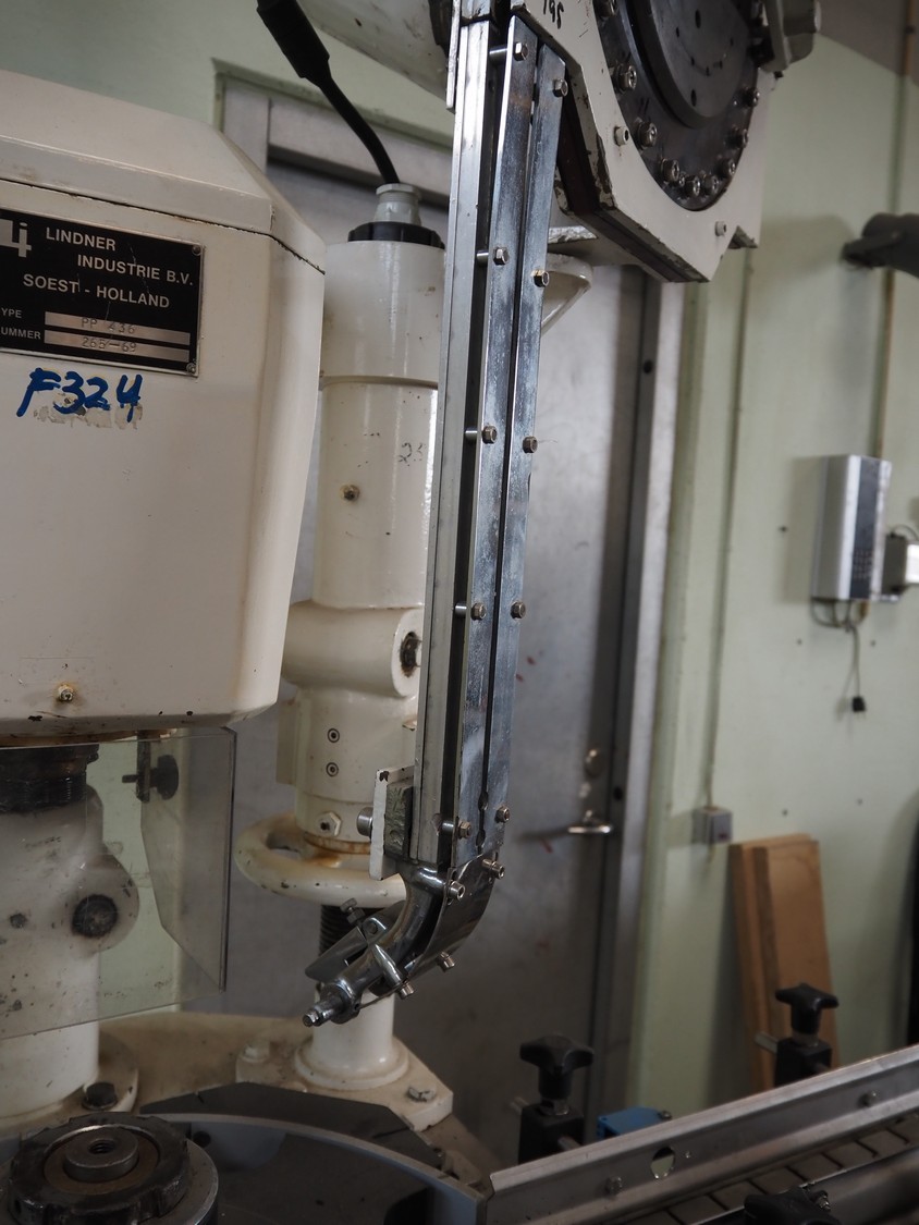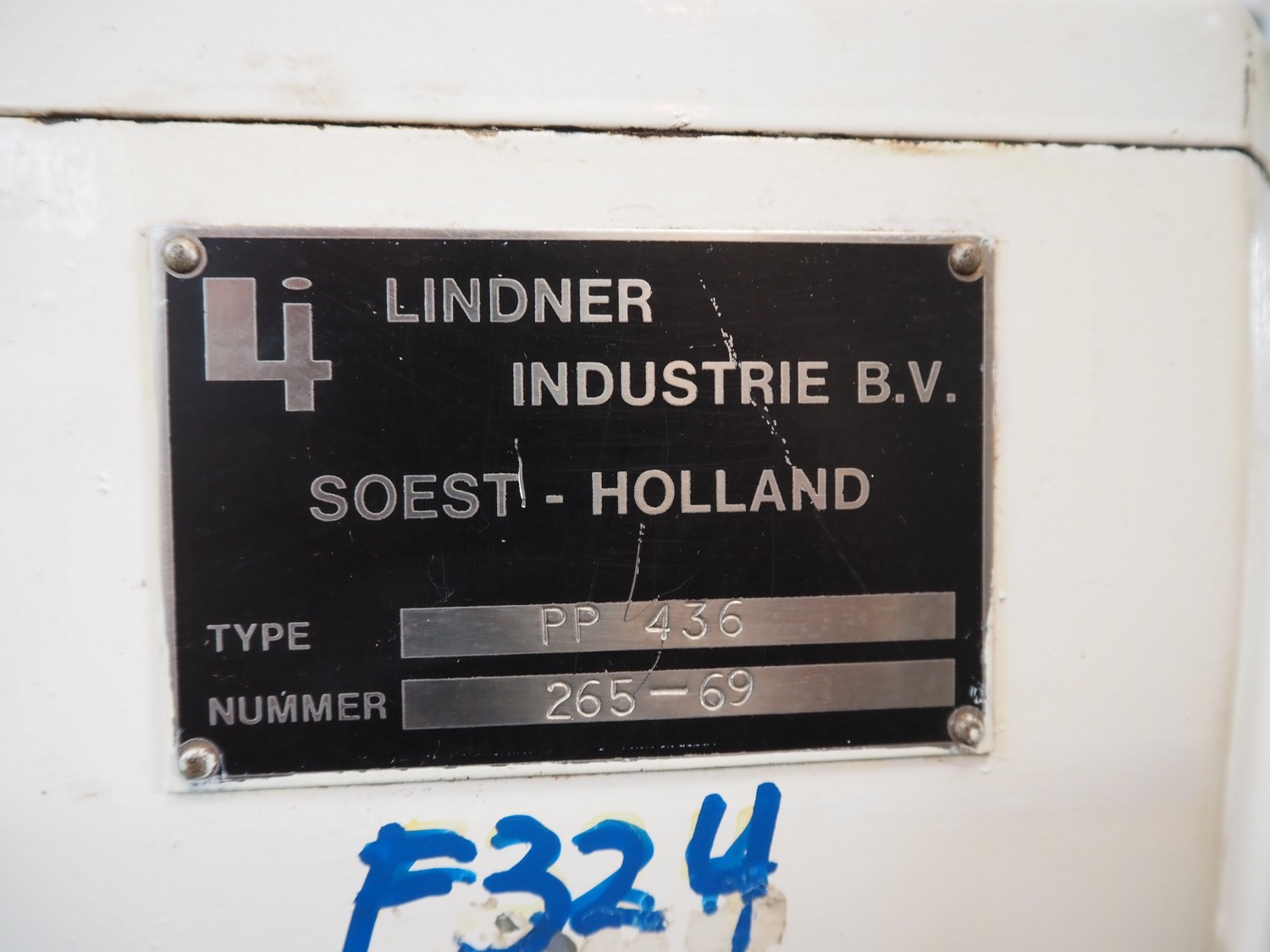 Lindner Industrie B.V. capsule machine, type: PP 436, number: 265-69, plastic belt, belt width: 80 mm, total dimensions: 1600 mm x 1100 mm x 2650 mm.