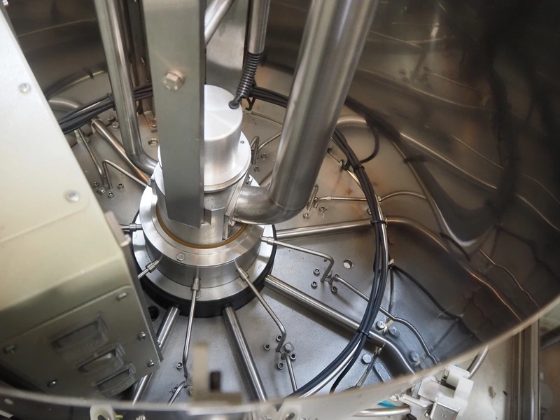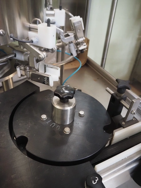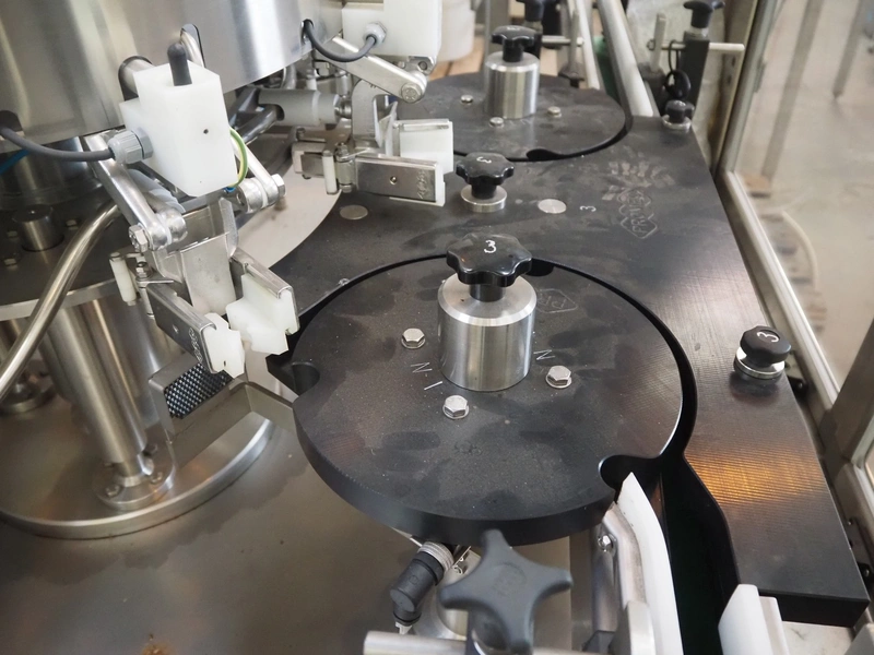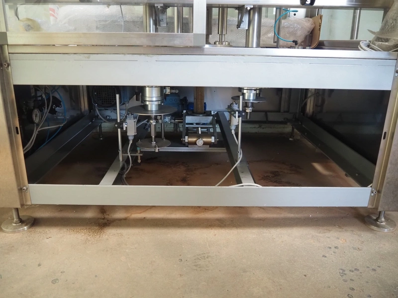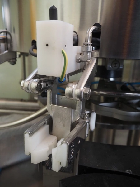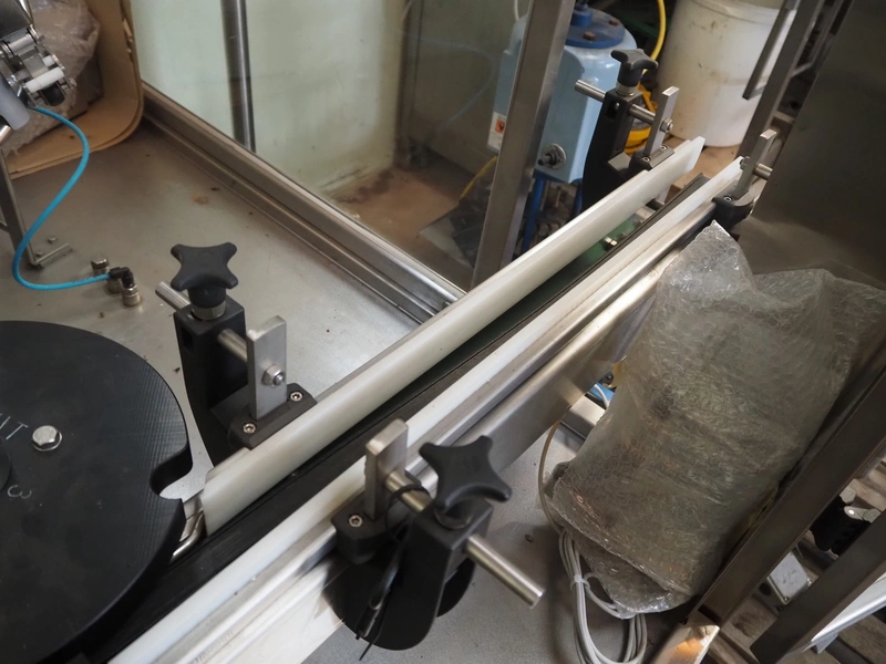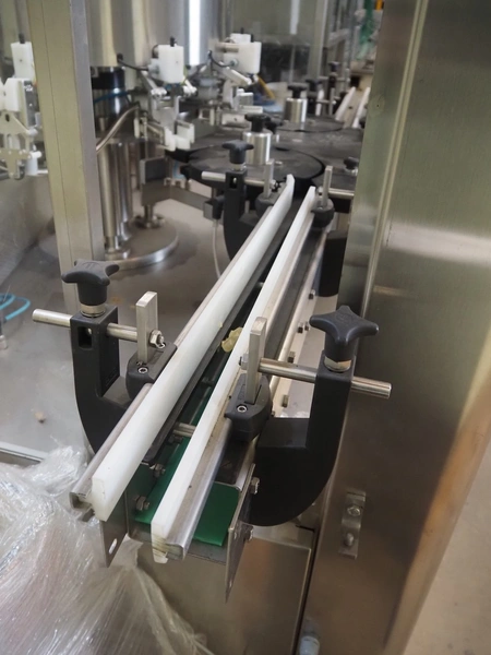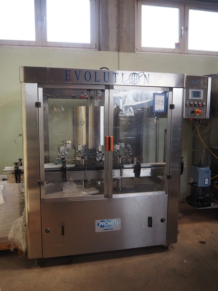 Promec rotary bottle rinser, type: Evolution 1S+1A.3.9.251, serial number: M1113/009, year of construction: 2007, 230 V, 50 Hz, 4.5 hp, belt width: 50 mm, capacity: 3600 bottles/hour, 9 stations, total dimensions: 2300 mm x 1450 mm x 2200 mm. Belt missing.