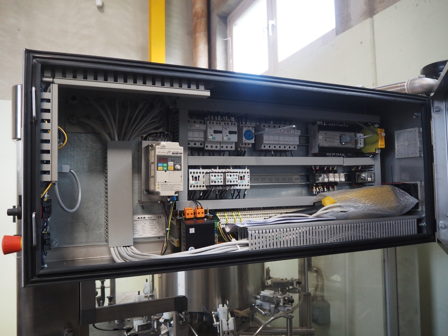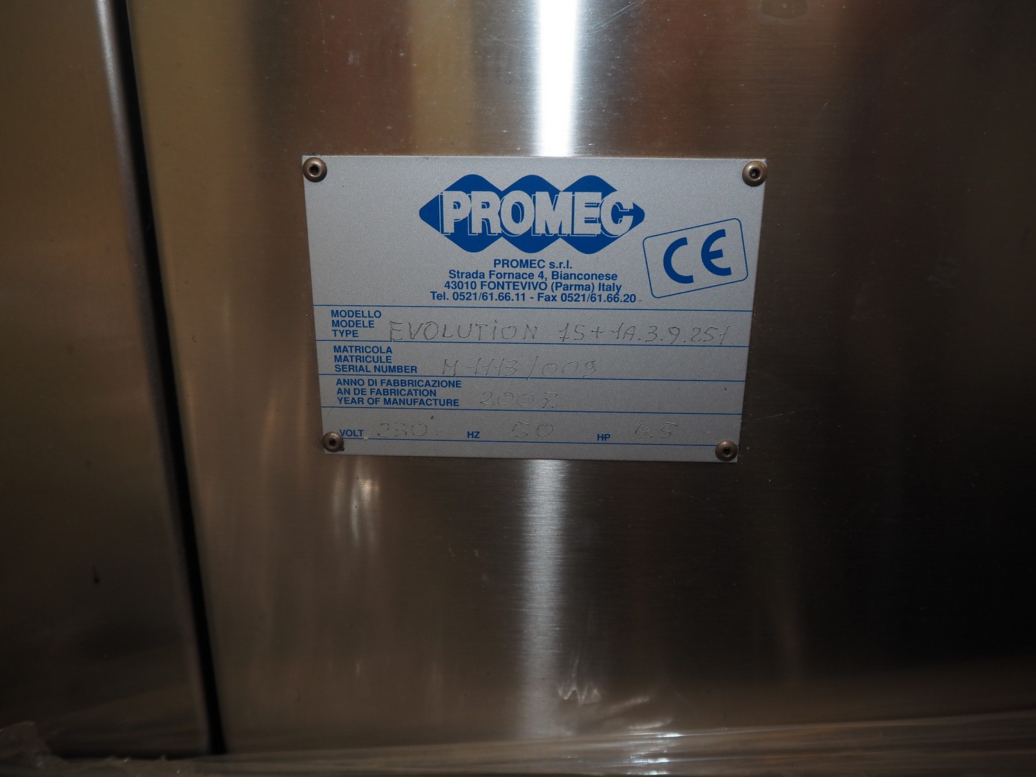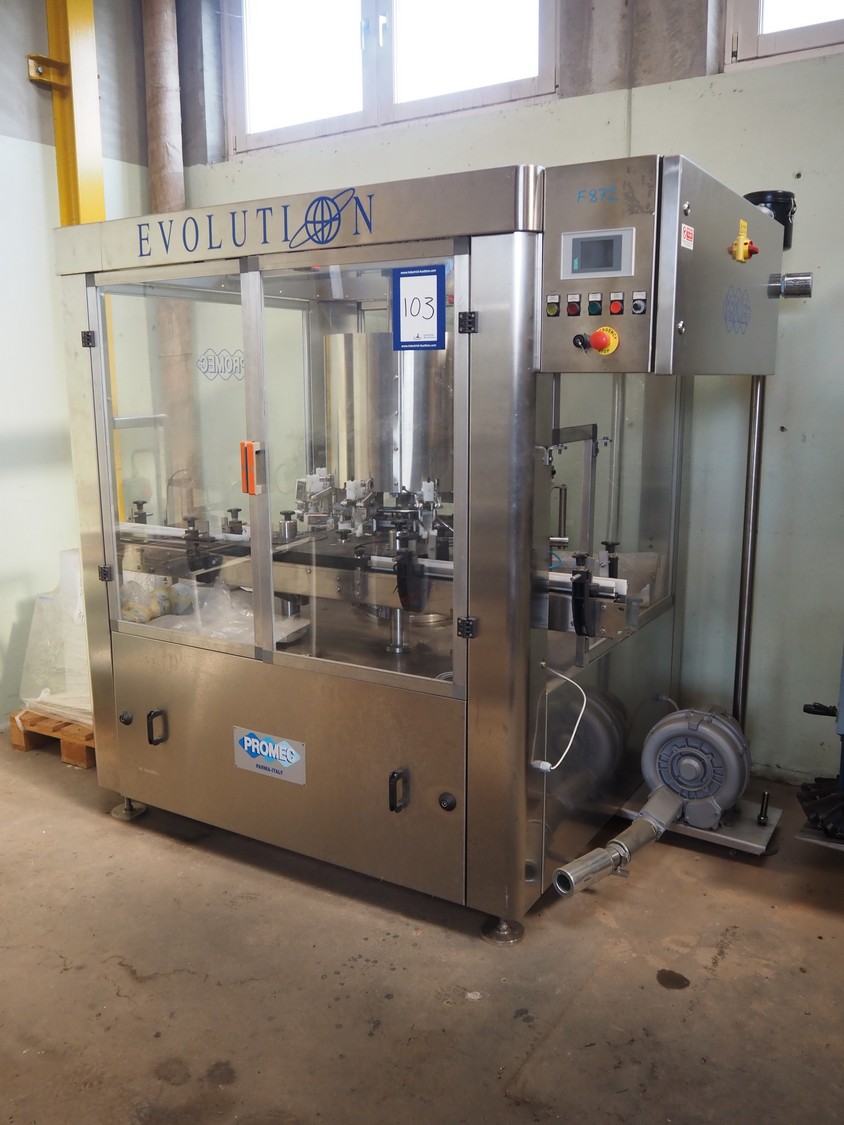 Promec rotary bottle rinser, type: Evolution 1S+1A.3.9.251, serial number: M1113/009, year of construction: 2007, 230 V, 50 Hz, 4.5 hp, belt width: 50 mm, capacity: 3600 bottles/hour, 9 stations, total dimensions: 2300 mm x 1450 mm x 2200 mm. Belt missing.