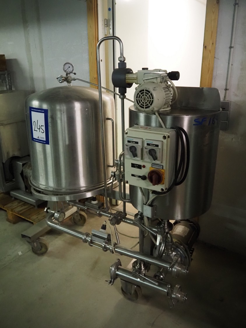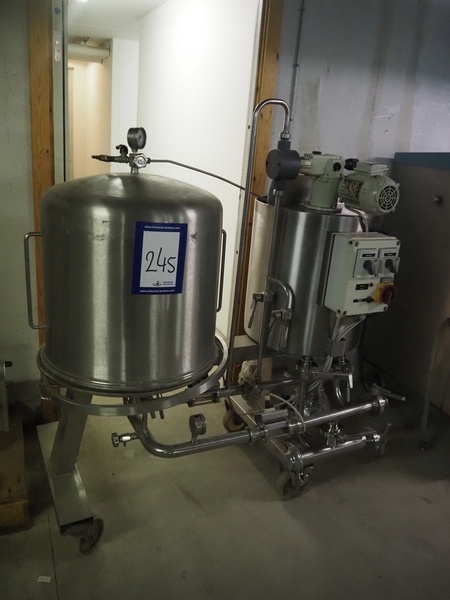 Kieselgur mobile filtration pump, 380 V, consisting of: Elutriane tank with agitator, Product pump, Elutriate filter and coarse filter, total dimensions: 1300 mm x 650 mm x 1450 mm.