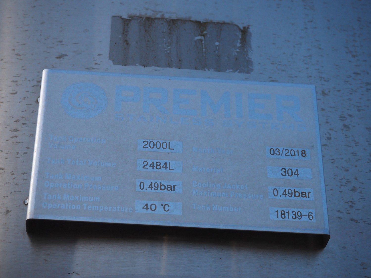 Premier s/s double jacketed tank, serial number: 18139-6, year of construction: 03/2018, capacity: 2000 liter, maximum pressure: 0.49 bar, maximum working temperature: 40°C, tank: Ø 1400 mm, total dimensions: 1500 mm x 1500 mm x 2875 mm.
