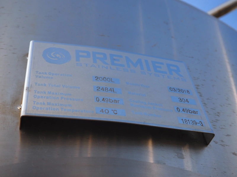 Premier s/s double jacketed tank, serial number: 18139-3, year of construction: 03/2018, capacity: 2000 liter, maximum pressure: 0.49 bar, maximum working temperature: 40°C, tank: Ø 1400 mm, total dimensions: 1500 mm x 1500 mm x 2875 mm.