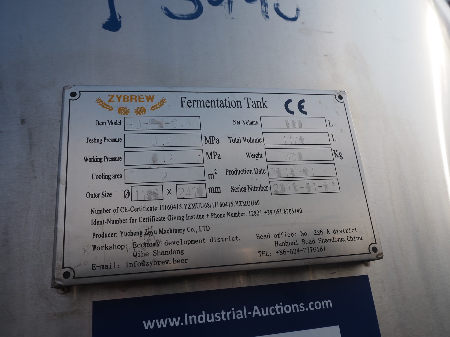 Zybrew double jacketed fermentation tank, model: HD-FJ-0.8, serial number: 2018-01-02, year of construction: 2018-01, netto volume: 800 liter, total volume: 1170 liter, weight: 340 Kg, dimensions: Ø 1160 mm x 2350 mm.