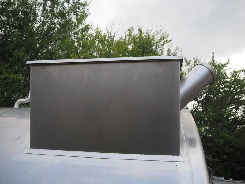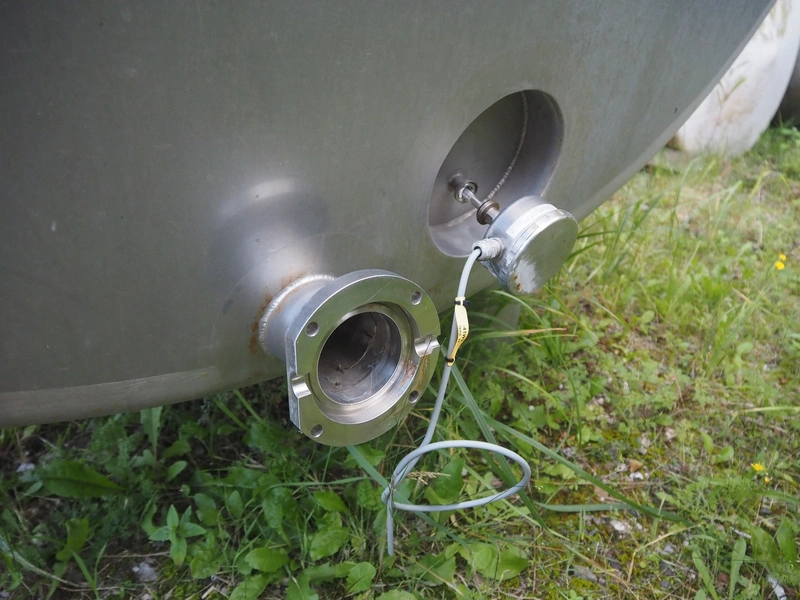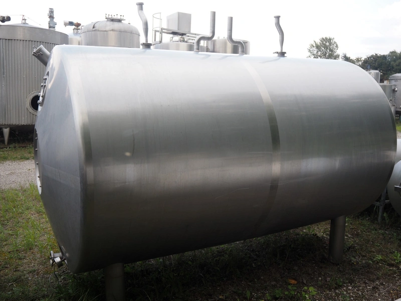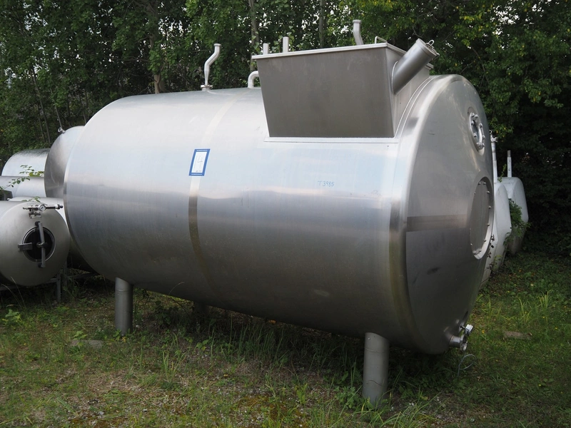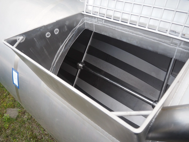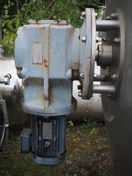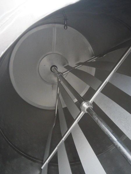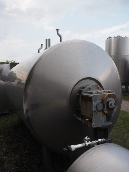 S/s tank with frame agitator, insulated and double jacket, capacity: 6500 liter, inside diameter: Ø 1700 mm, output: 70 mm / 2.5 inch, total dimensions: 3800 mm x 1850 mm x 2170 mm.