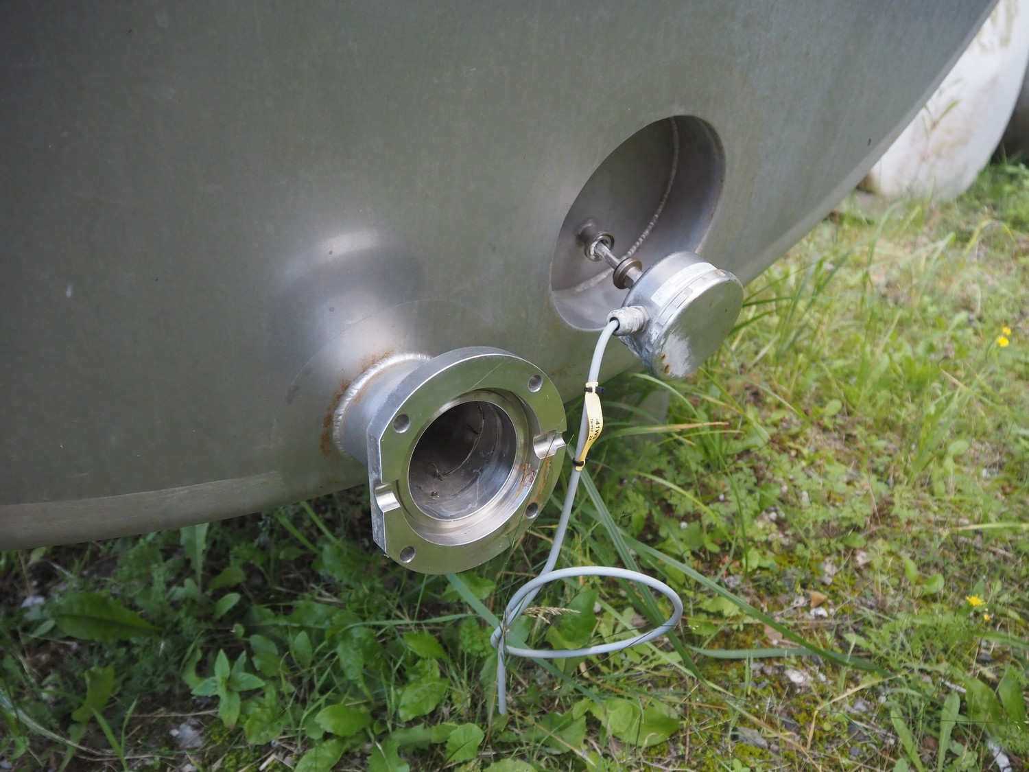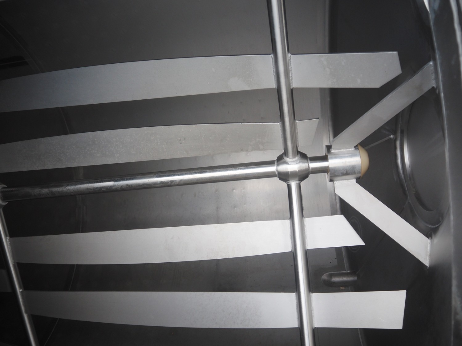 S/s tank with frame agitator, insulated and double jacket, capacity: 6500 liter, inside diameter: Ø 1700 mm, output: 70 mm / 2.5 inch, total dimensions: 3800 mm x 1850 mm x 2170 mm.