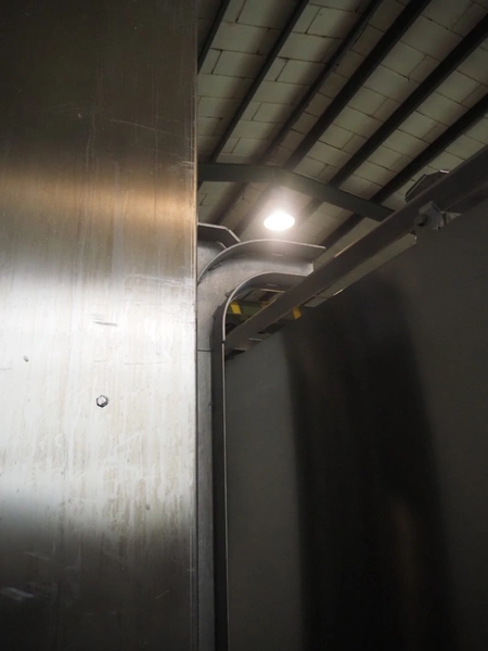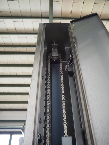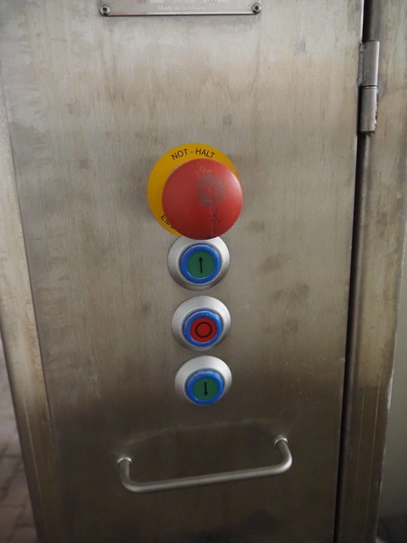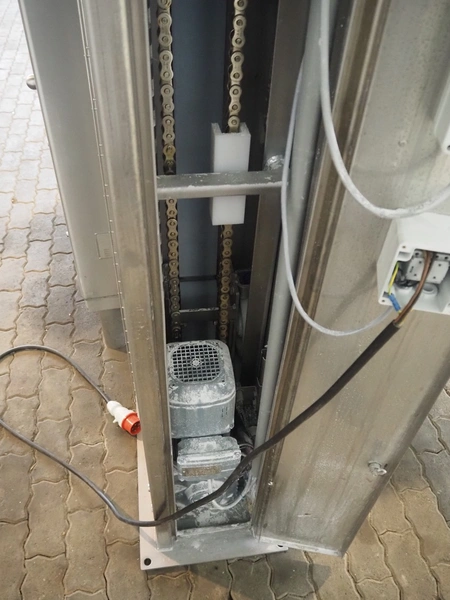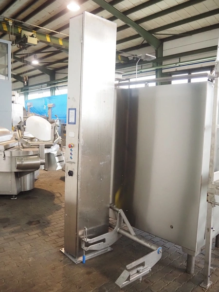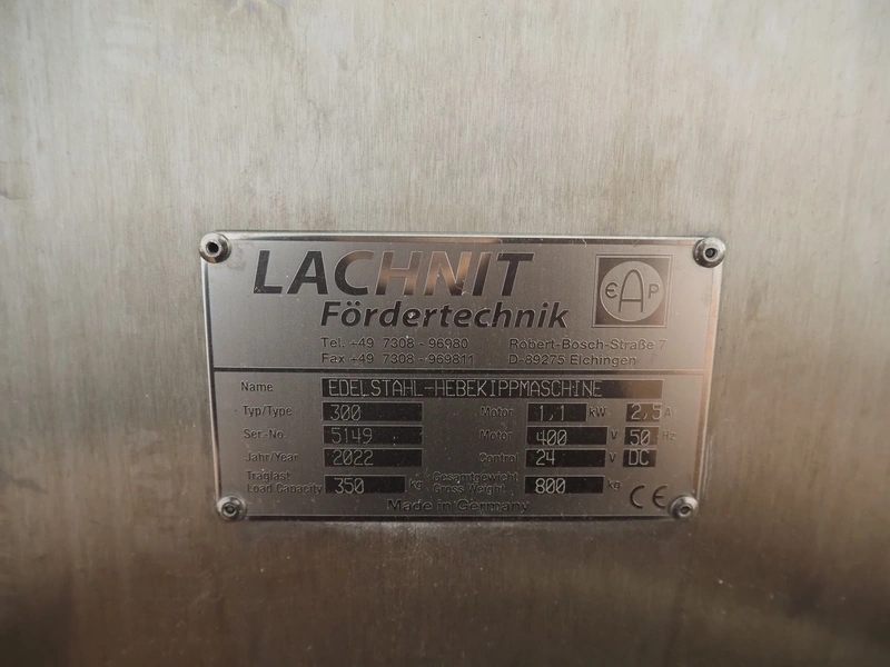 Lachnit s/s lifter for meat bins, type: 300, serial number: 5149, year of construction: 2022, 400 V, 50 Hz, 2.5 A, 1.1 kW, weight: 800 kg, loading capacity: 350 kg, maximum lifting height: 2400 mm, total dimensions: 1200 mm x 900 mm x 3000 mm.