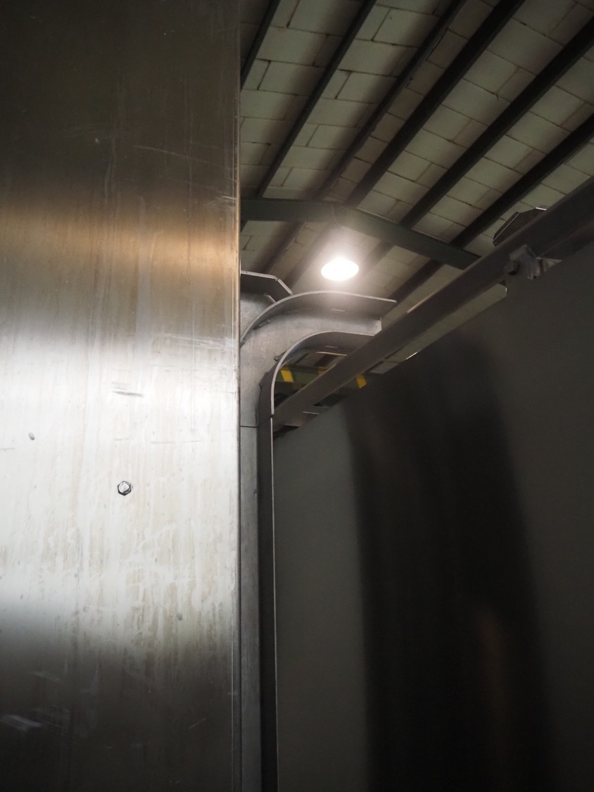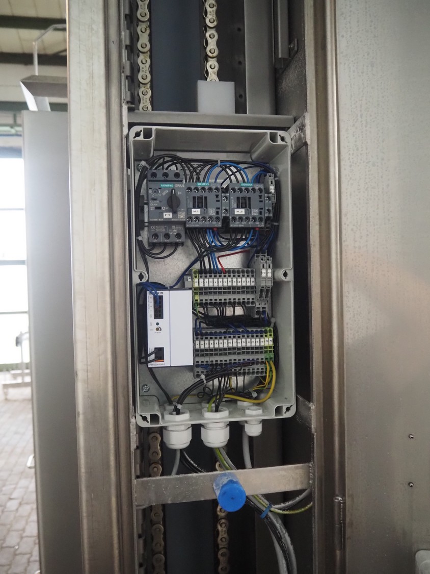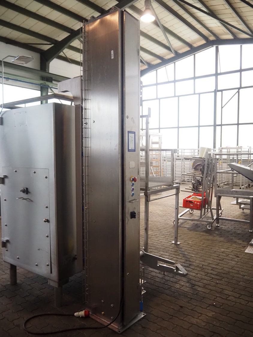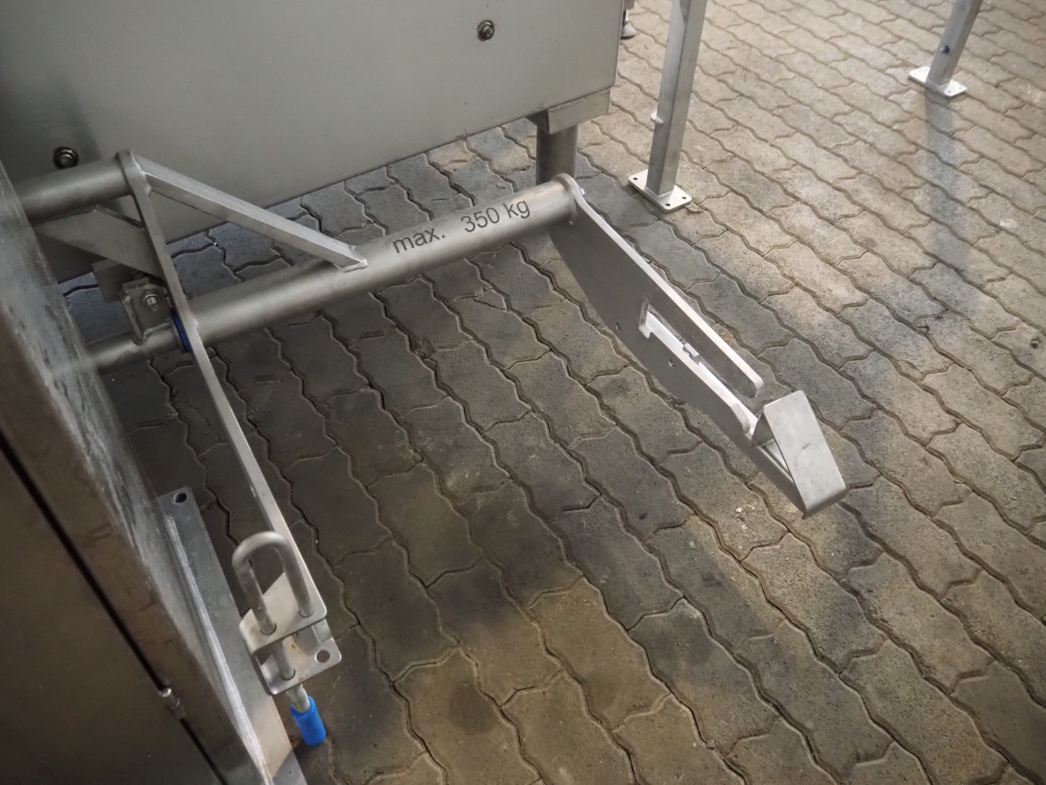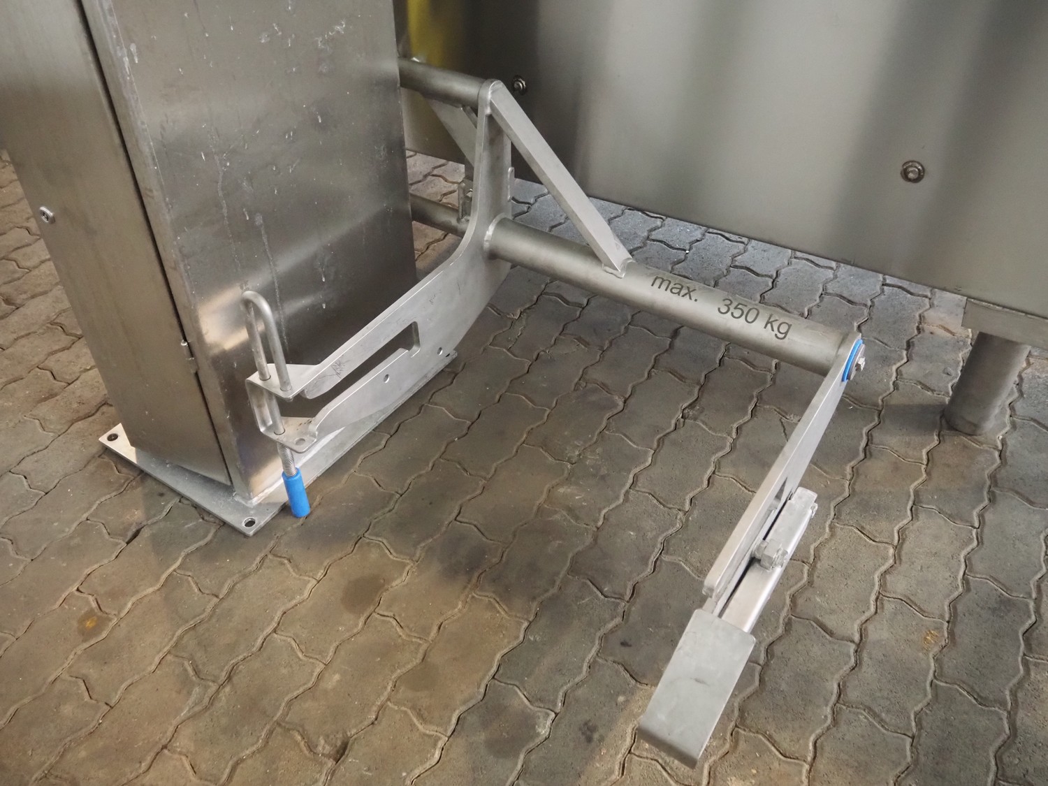 Lachnit s/s lifter for meat bins, type: 300, serial number: 5149, year of construction: 2022, 400 V, 50 Hz, 2.5 A, 1.1 kW, weight: 800 kg, loading capacity: 350 kg, maximum lifting height: 2400 mm, total dimensions: 1200 mm x 900 mm x 3000 mm.