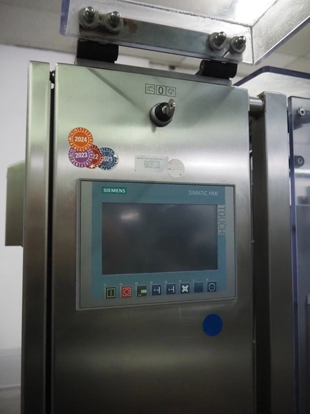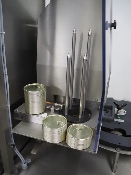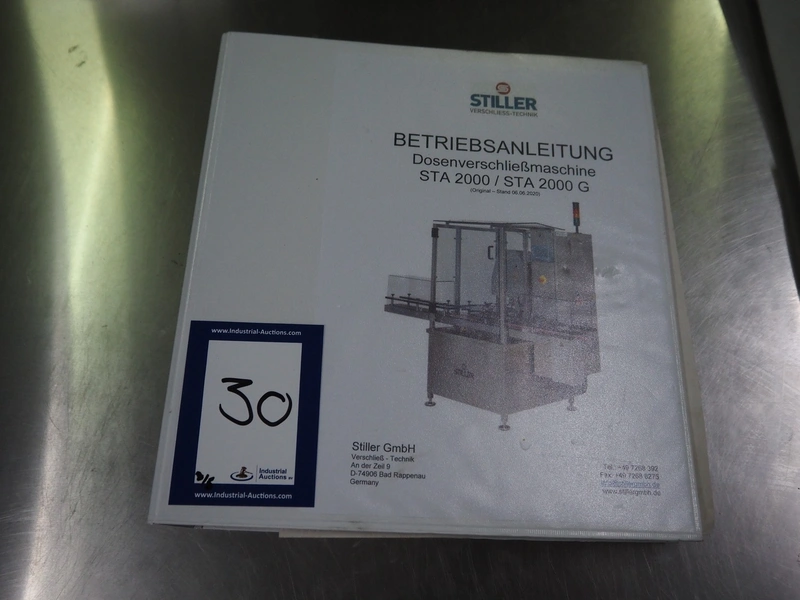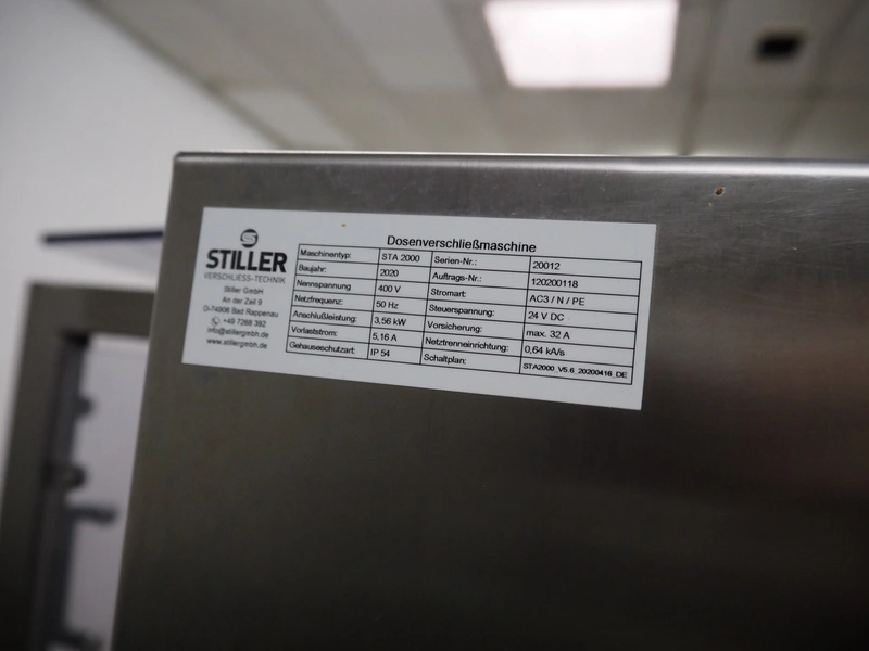 Stiller can sealer, type: STA 2000, serial number: 2012, year of construction: 2020, 400 V, 3 Ph, 50 Hz, 5.16/32 A, 3.56 kW, capacity: 2000/h plastic mesh belt, belt width: 150 mm, clearance: 310 mm x 105 mm, Ø cans: 52 - 99 mm, height cans: 30 - 300 mm, total dimensions: 2600 mm x 1050 mm x 2000 mm.