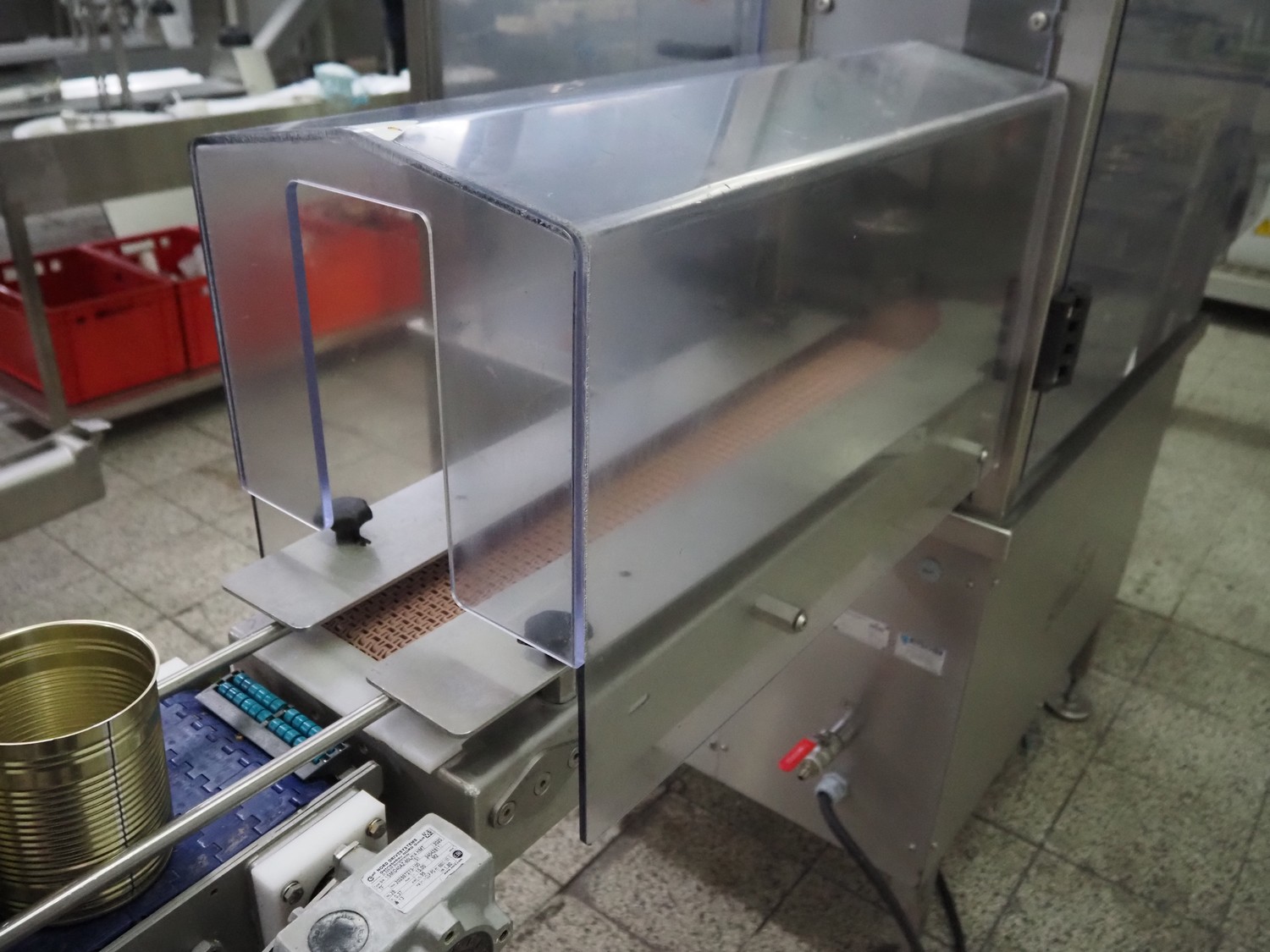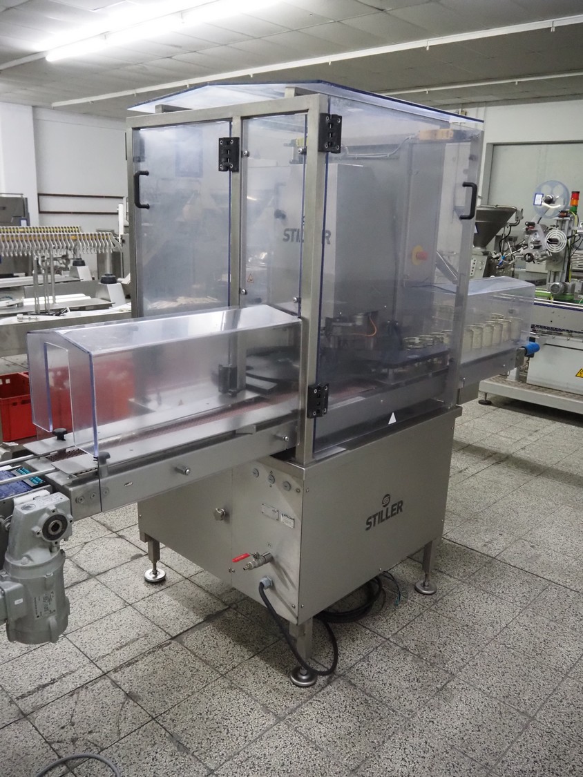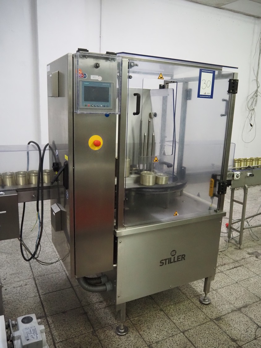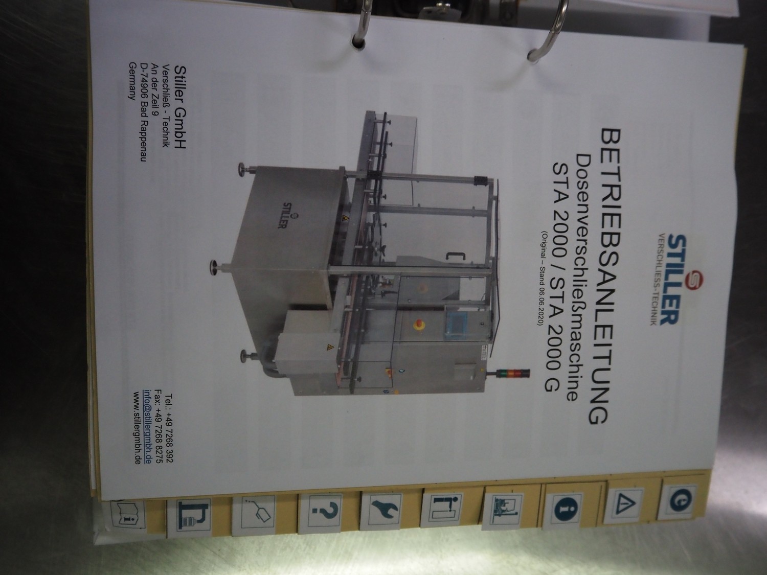 Stiller can sealer, type: STA 2000, serial number: 2012, year of construction: 2020, 400 V, 3 Ph, 50 Hz, 5.16/32 A, 3.56 kW, capacity: 2000/h plastic mesh belt, belt width: 150 mm, clearance: 310 mm x 105 mm, Ø cans: 52 - 99 mm, height cans: 30 - 300 mm, total dimensions: 2600 mm x 1050 mm x 2000 mm.