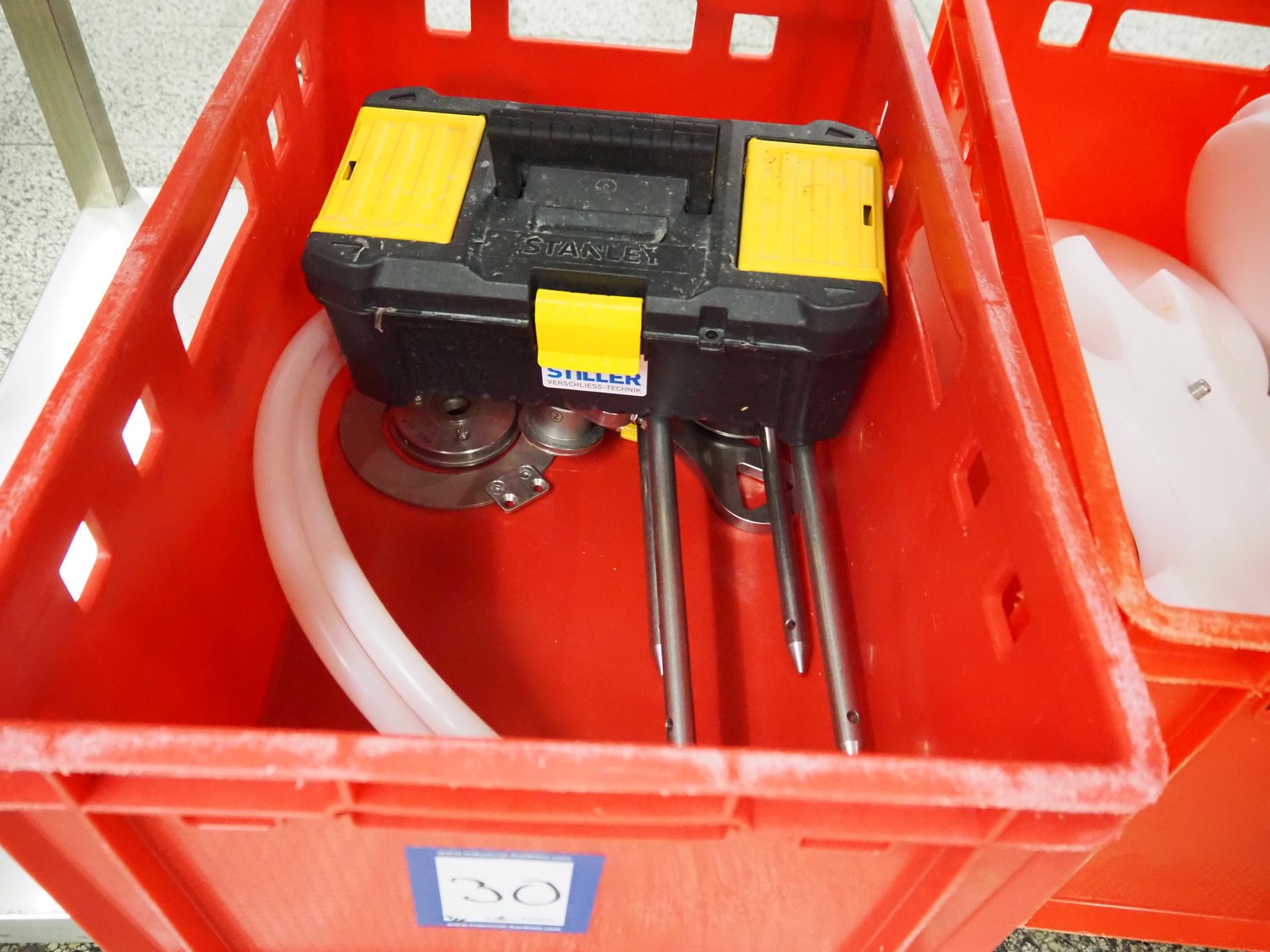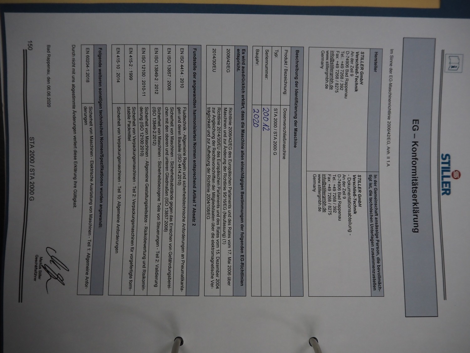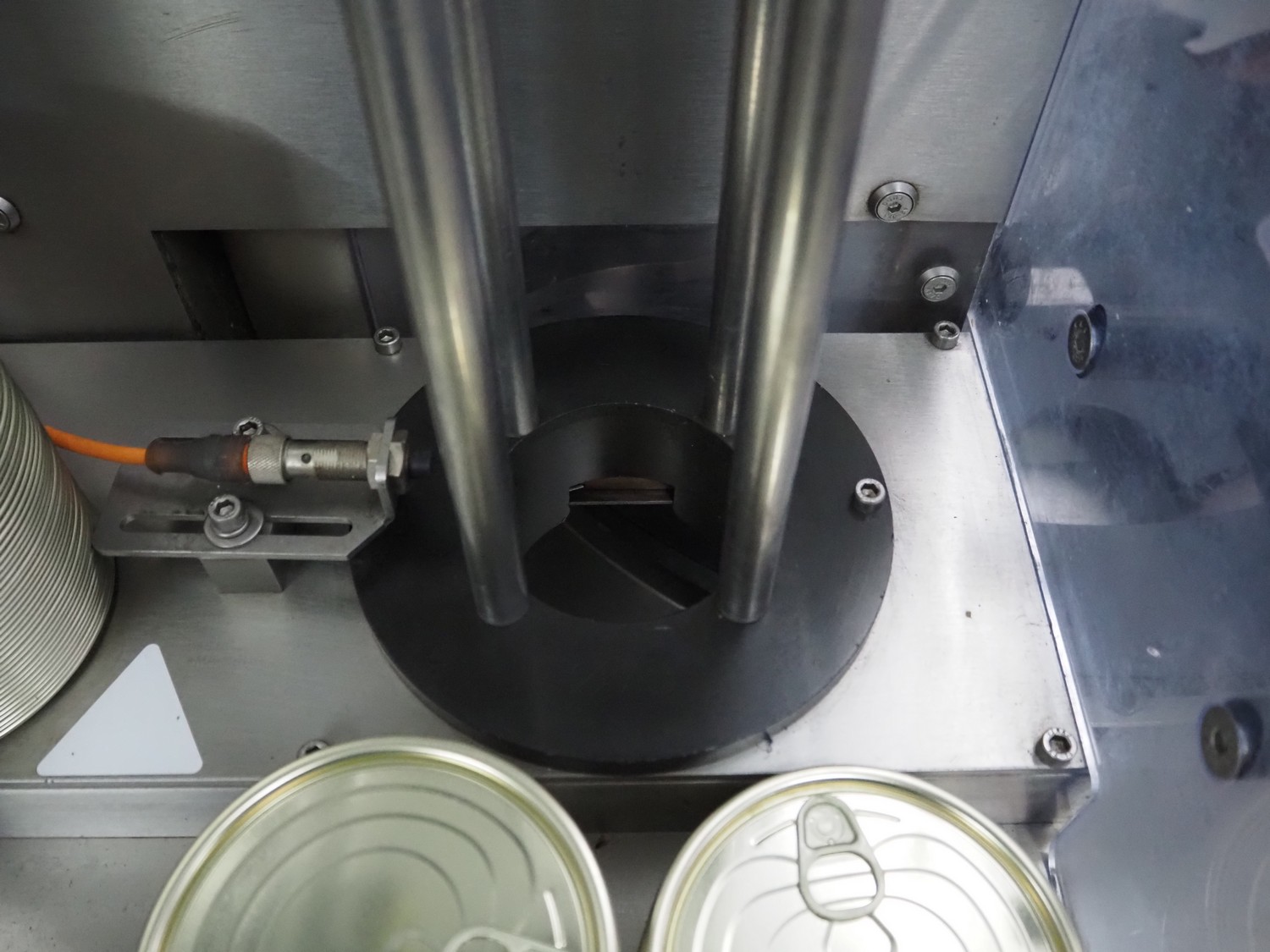 Stiller can sealer, type: STA 2000, serial number: 2012, year of construction: 2020, 400 V, 3 Ph, 50 Hz, 5.16/32 A, 3.56 kW, capacity: 2000/h plastic mesh belt, belt width: 150 mm, clearance: 310 mm x 105 mm, Ø cans: 52 - 99 mm, height cans: 30 - 300 mm, total dimensions: 2600 mm x 1050 mm x 2000 mm.