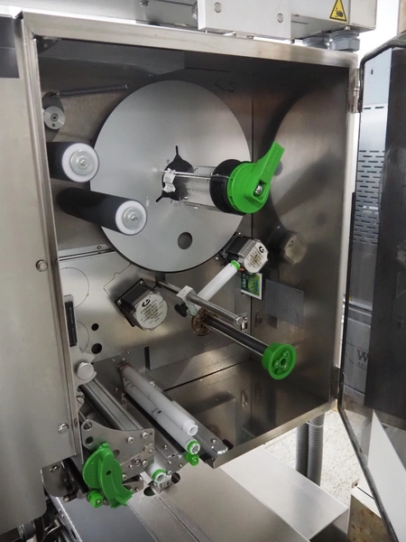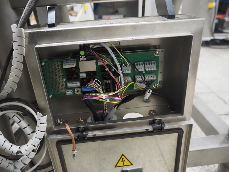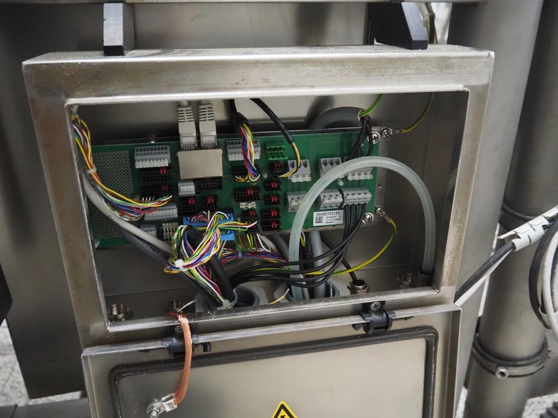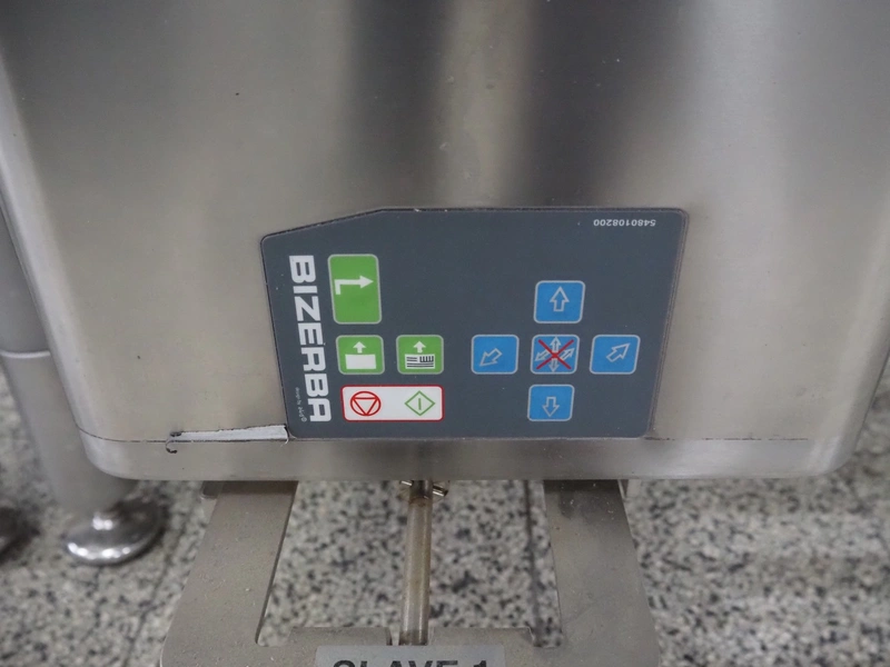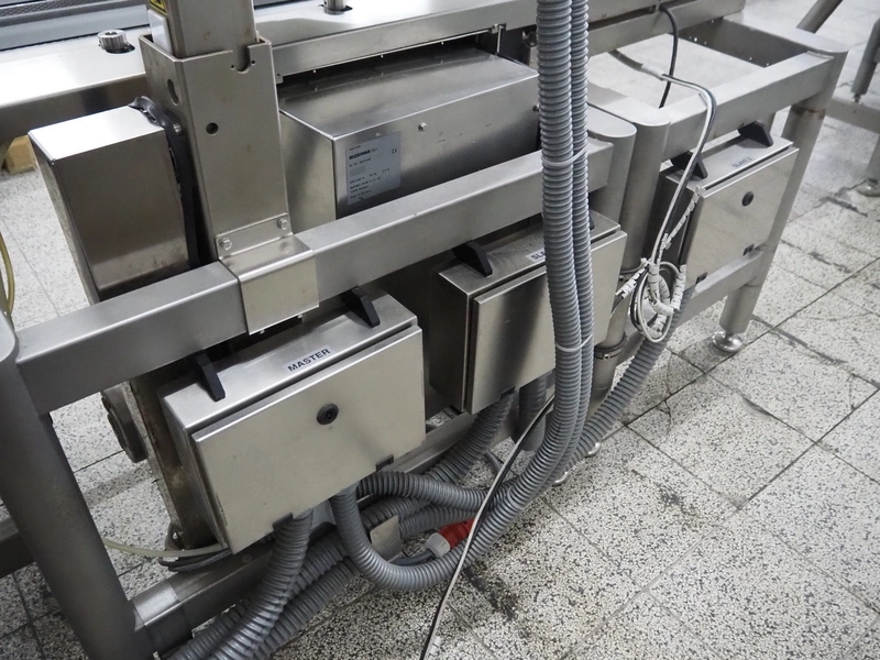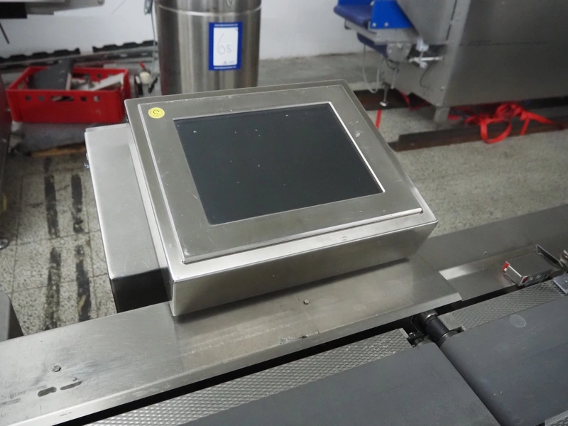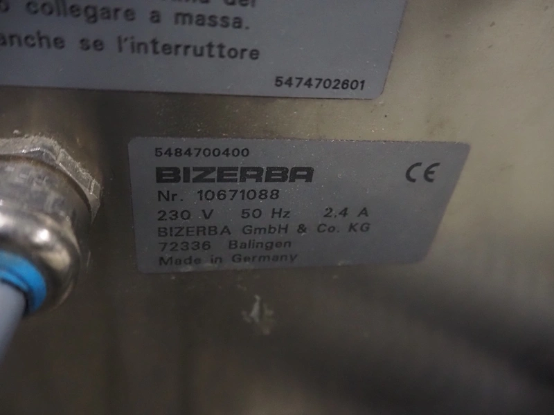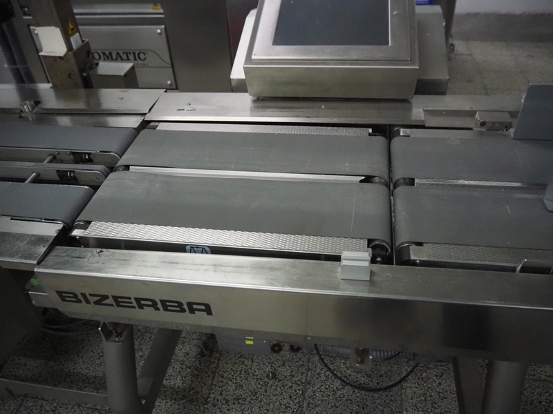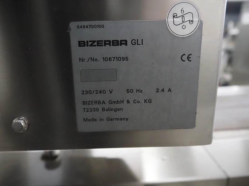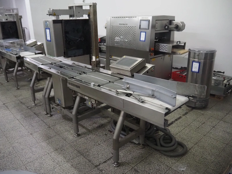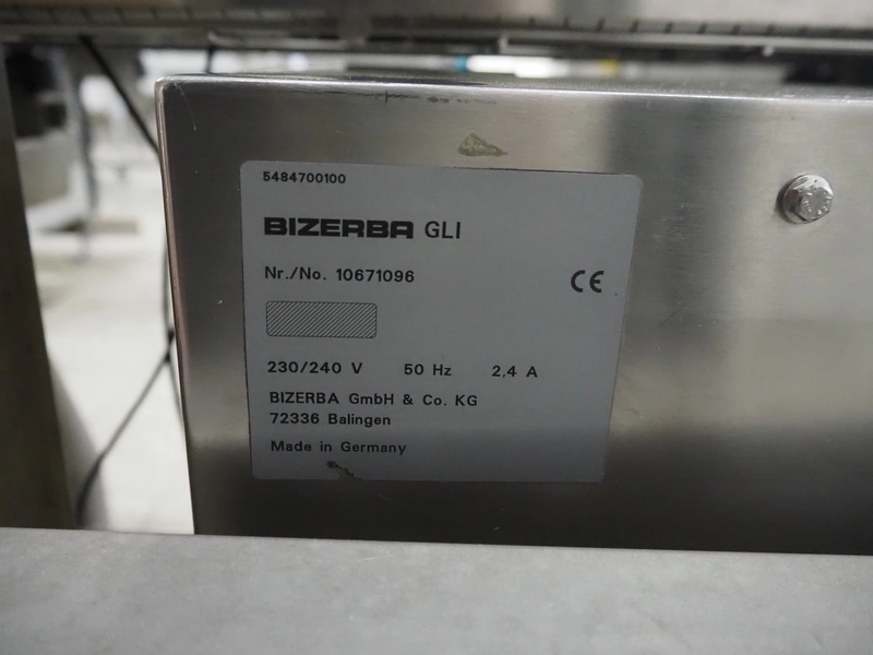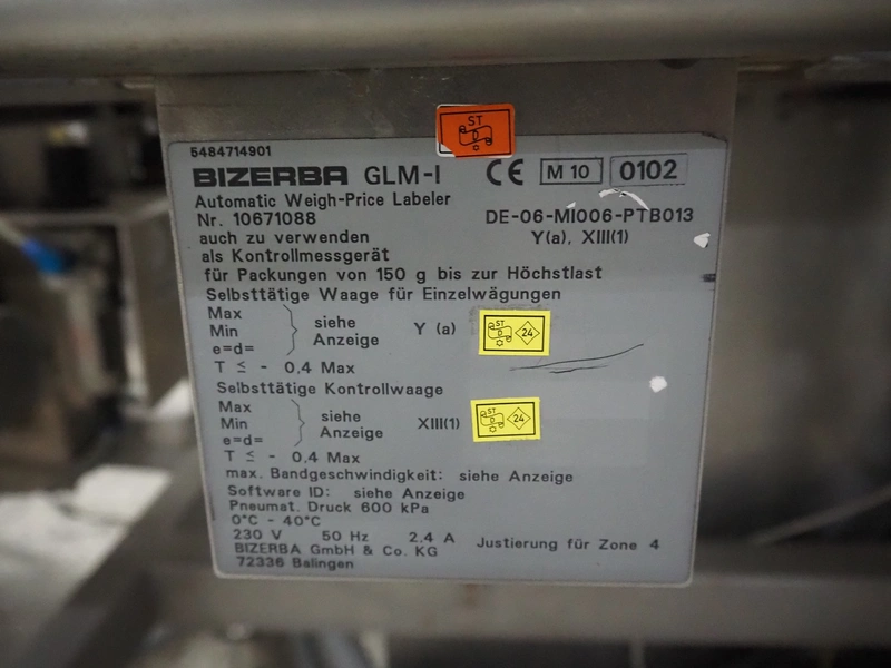 Bizerba weighing- and labelling machine, type: GLM-I, number: 10671088, 230 V, 50 Hz, 2.4 A, with 2 Bizerba labellers, number labeller: 10671095 and 10671096, 230/240 V, 50 Hz, 2.4 A, plastic belt, belt width: (1x) 300 mm, (1x) 95 mm, (3x) 140 mm, total dimensions: 4000 mm x 1000 mm x 1900 mm.