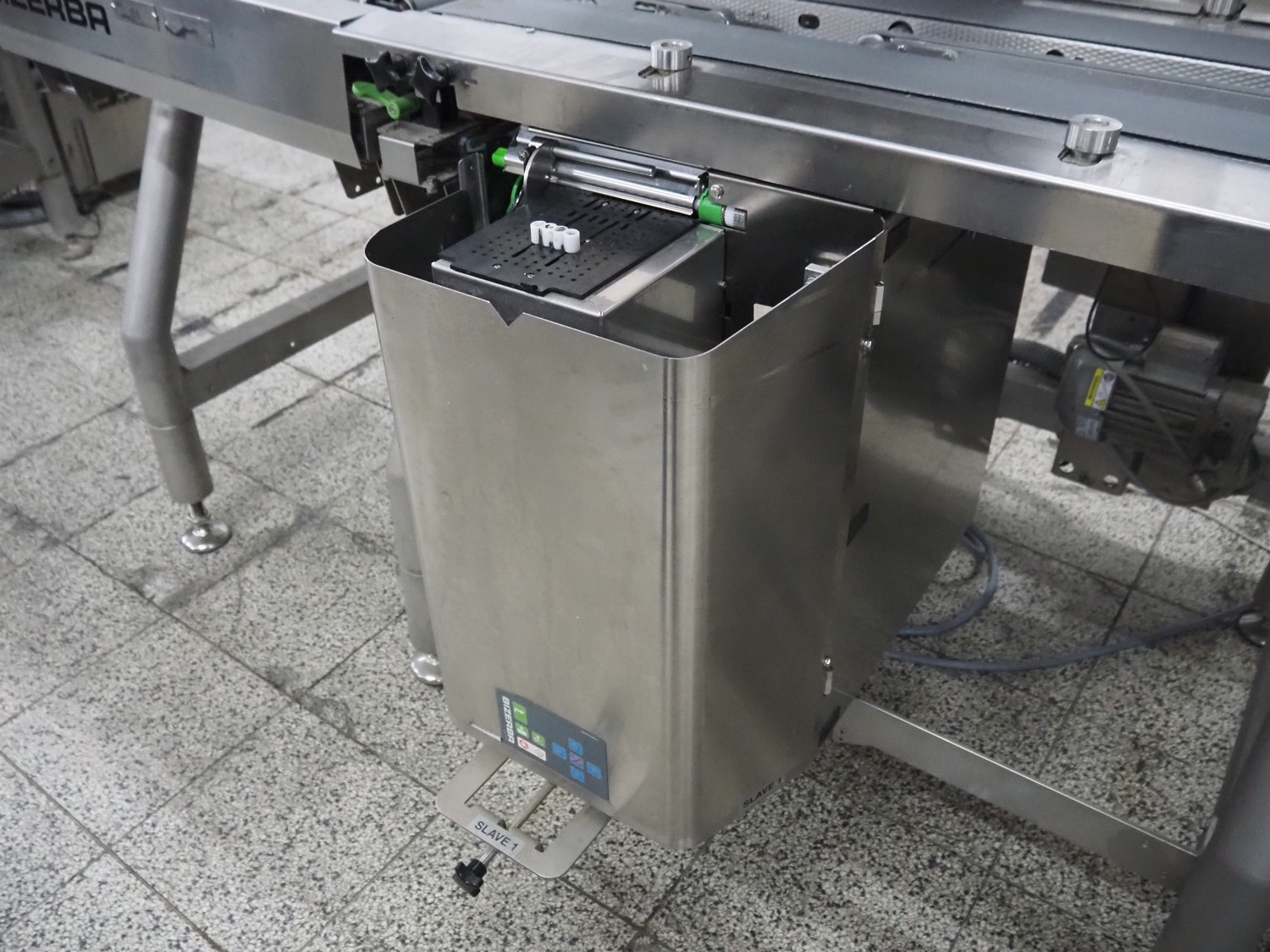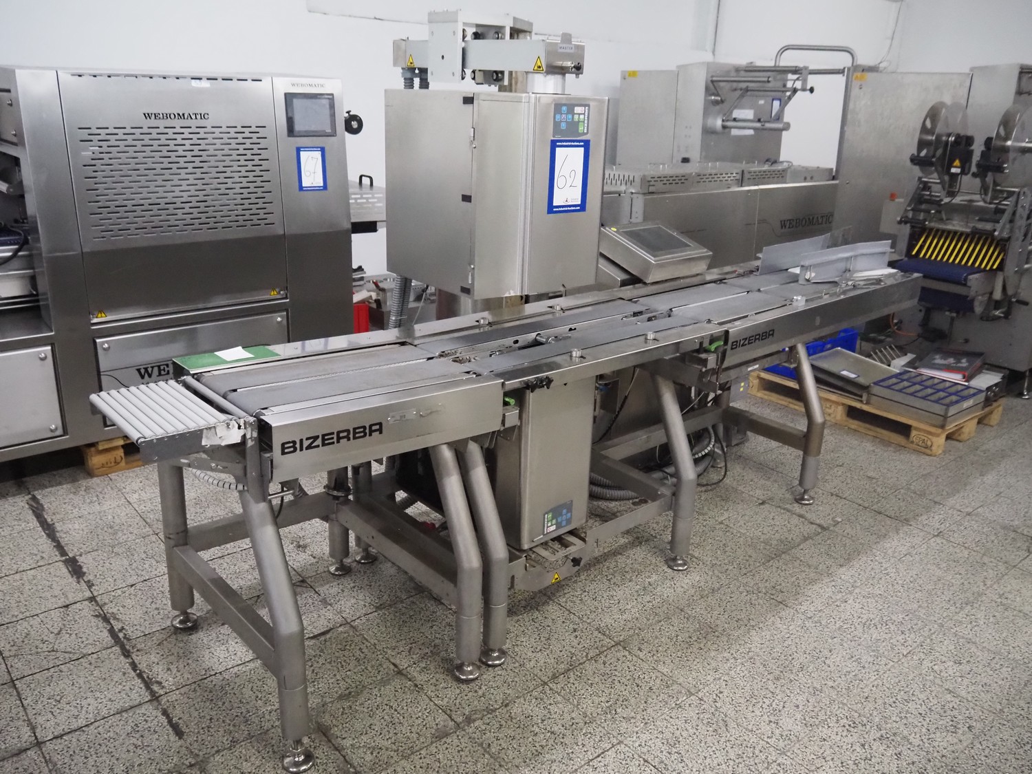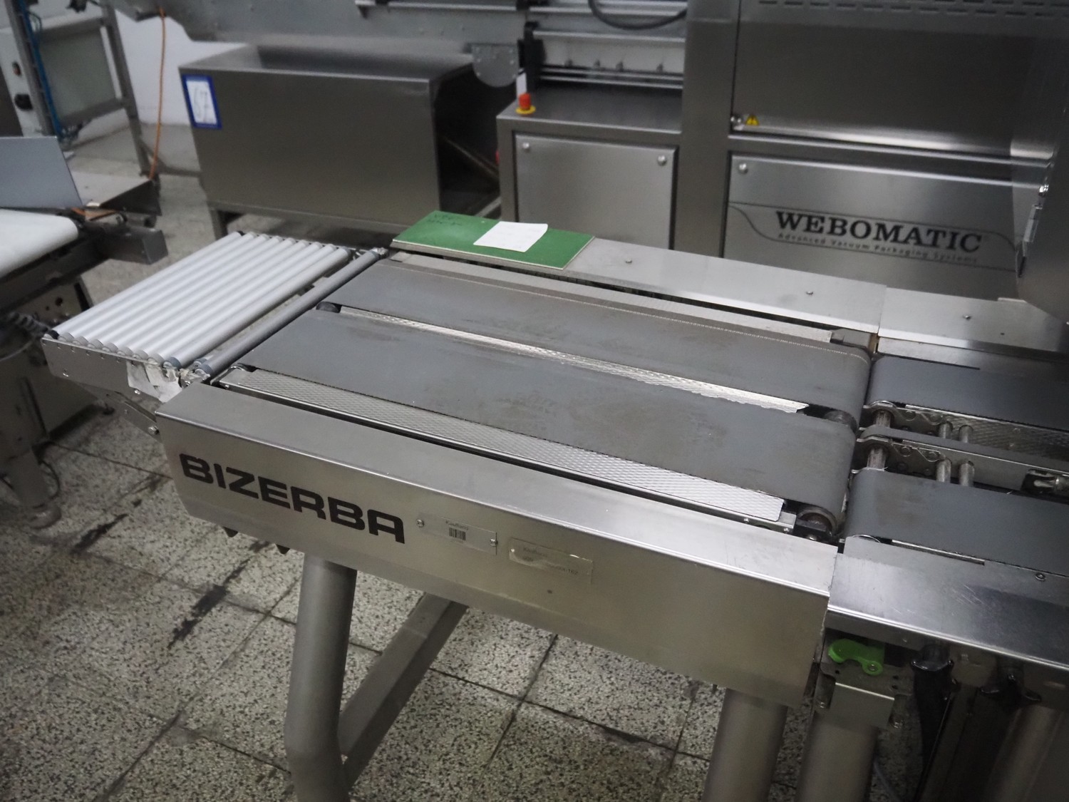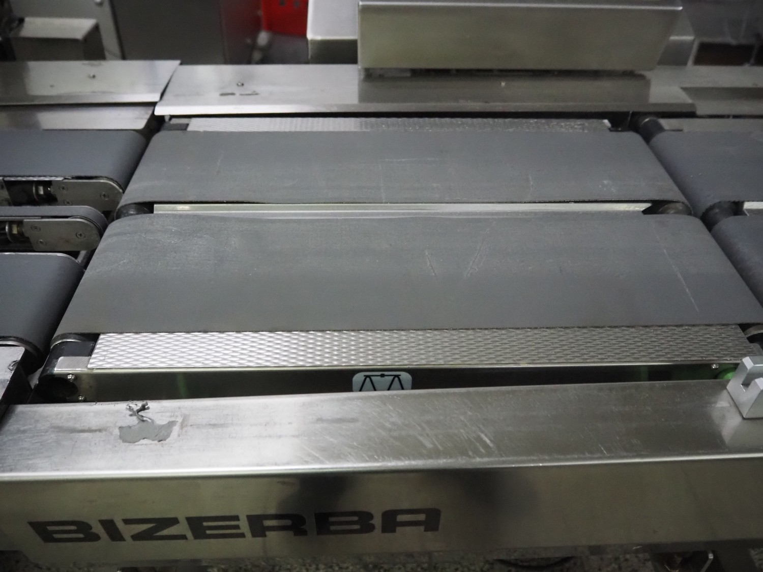 Bizerba weighing- and labelling machine, type: GLM-I, number: 10671088, 230 V, 50 Hz, 2.4 A, with 2 Bizerba labellers, number labeller: 10671095 and 10671096, 230/240 V, 50 Hz, 2.4 A, plastic belt, belt width: (1x) 300 mm, (1x) 95 mm, (3x) 140 mm, total dimensions: 4000 mm x 1000 mm x 1900 mm.