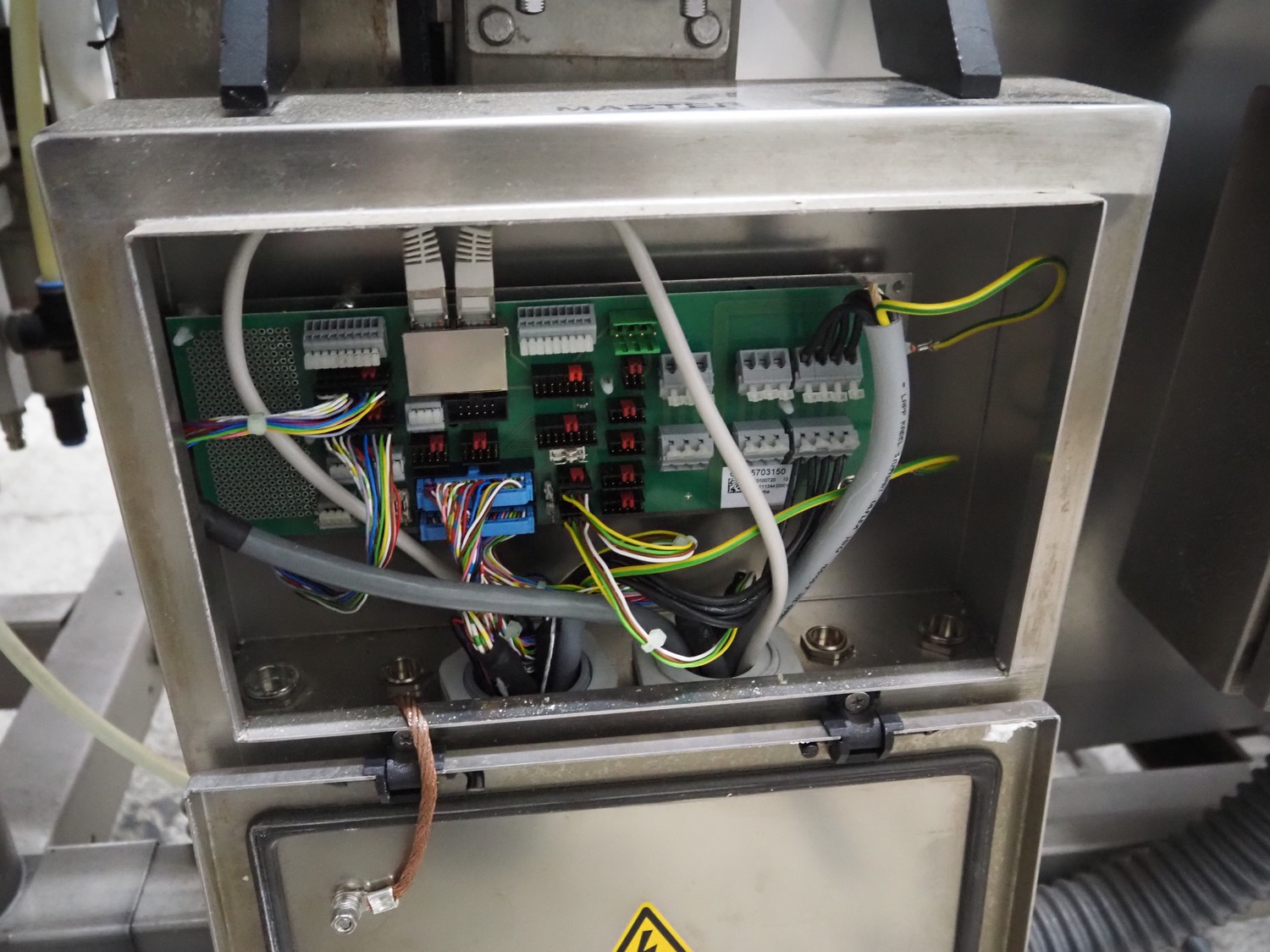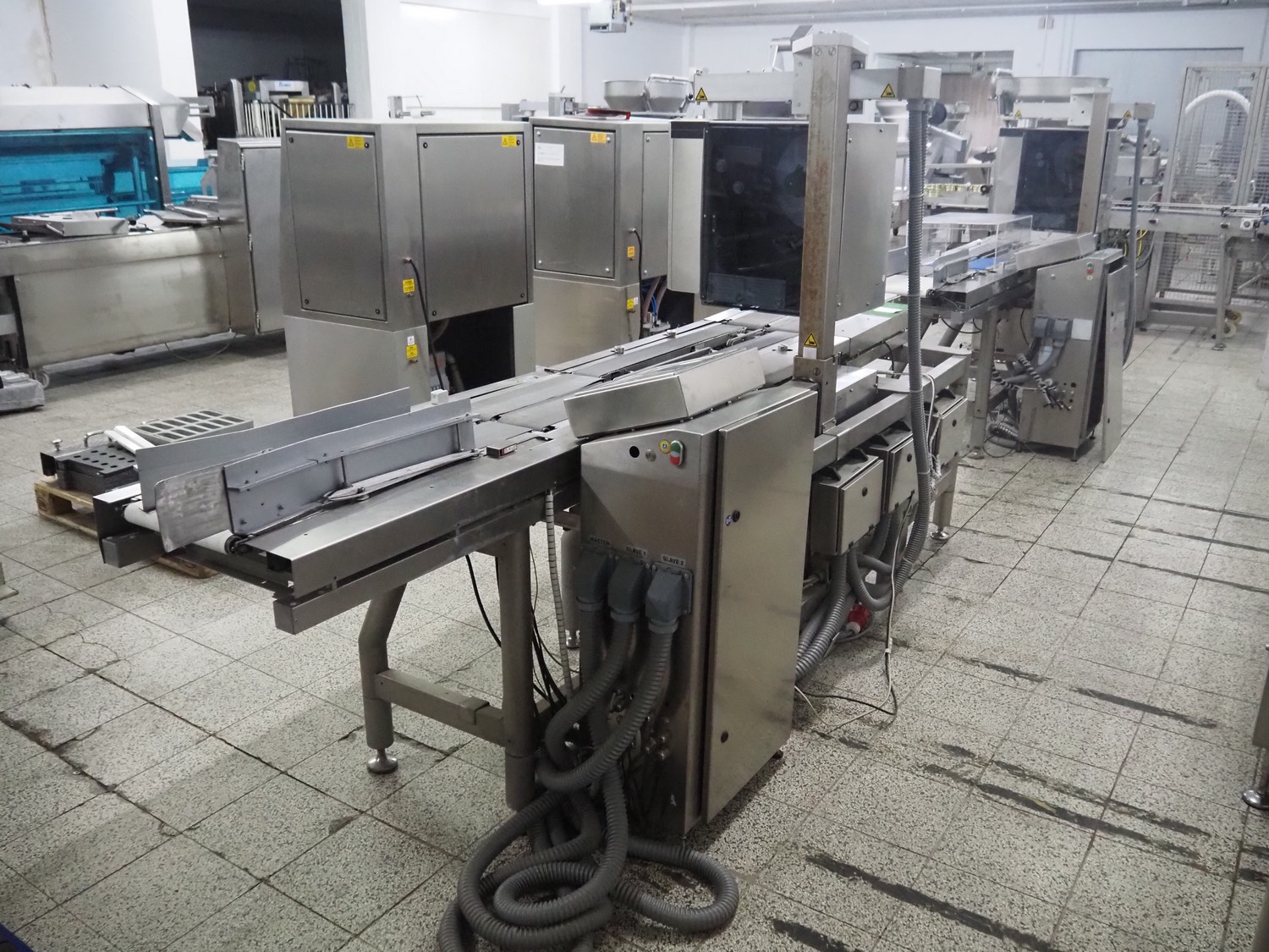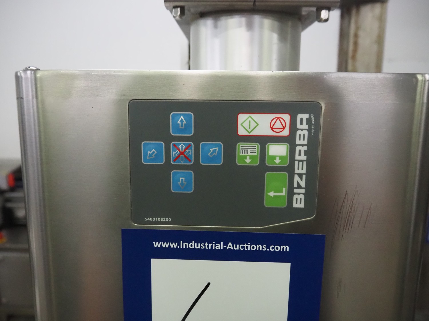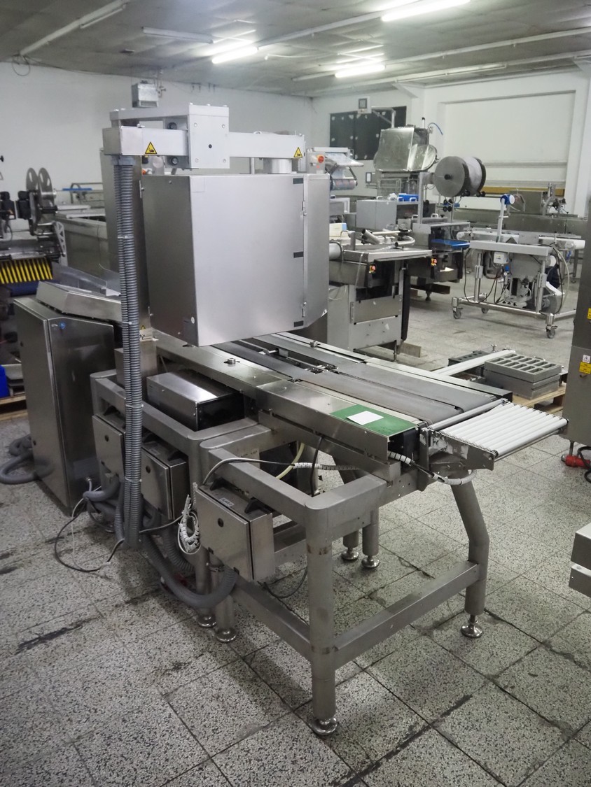 Bizerba weighing- and labelling machine, type: GLM-I, number: 10671088, 230 V, 50 Hz, 2.4 A, with 2 Bizerba labellers, number labeller: 10671095 and 10671096, 230/240 V, 50 Hz, 2.4 A, plastic belt, belt width: (1x) 300 mm, (1x) 95 mm, (3x) 140 mm, total dimensions: 4000 mm x 1000 mm x 1900 mm.