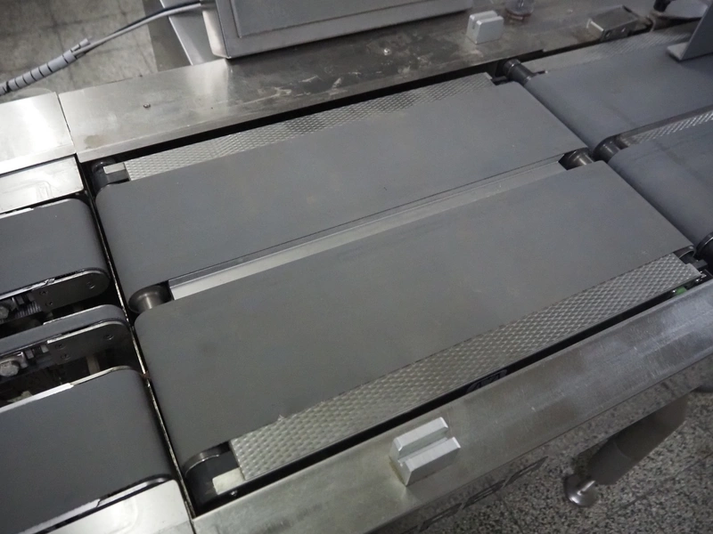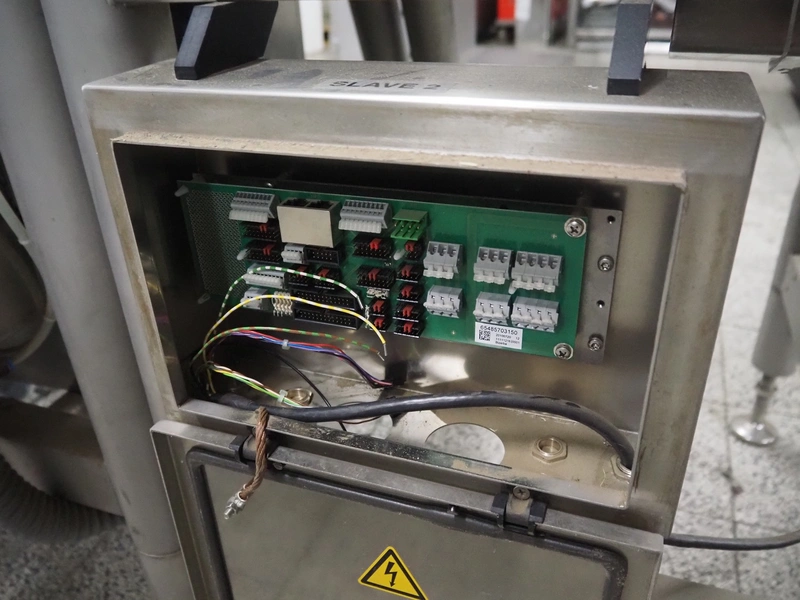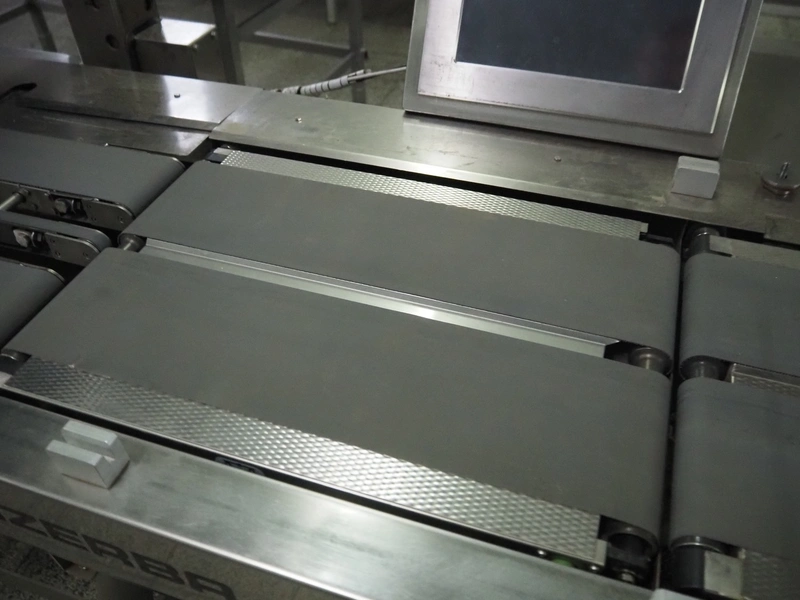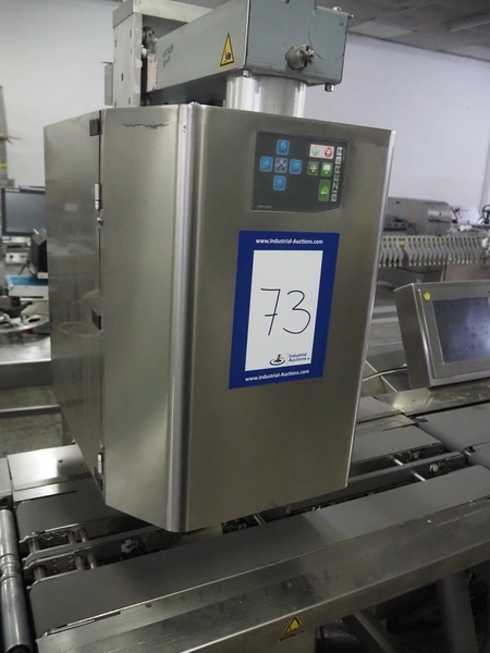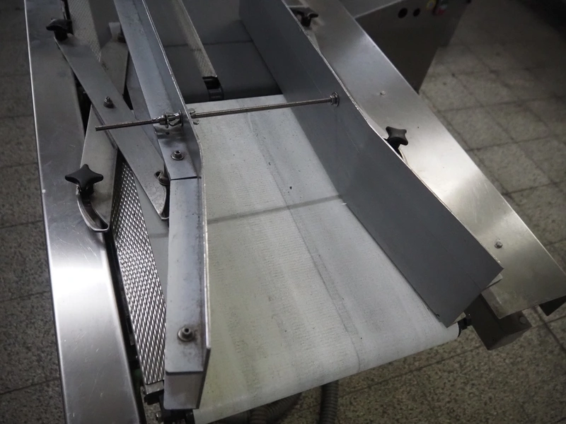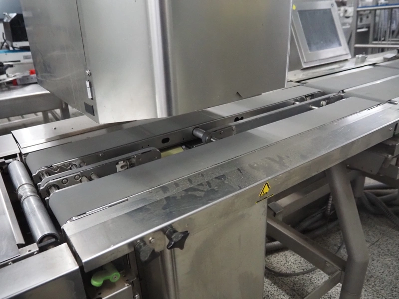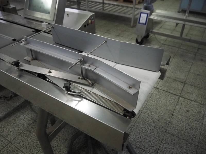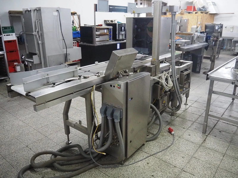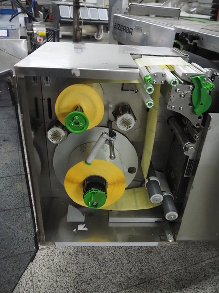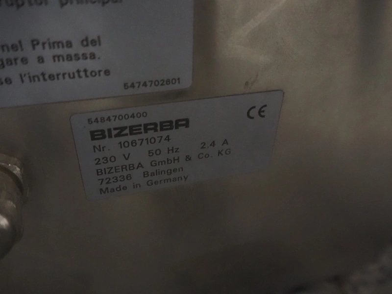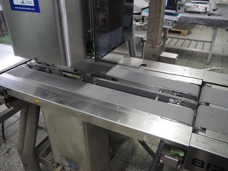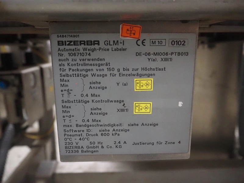 Bizerba weighing- and labelling machine type: GLM-I, number: 10671074, 230 V, 50 Hz, 2.4 A, with 2 labellers, number labeller: 10671086 / 10671082, 230/240 V, 50 Hz, 2.4 A, plastic belt, belt width: (1x) 300 mm, (1x) 90 mm, (2x) 140 mm, total dimensions: 4000 mm x 1000 mm x 1900 mm.