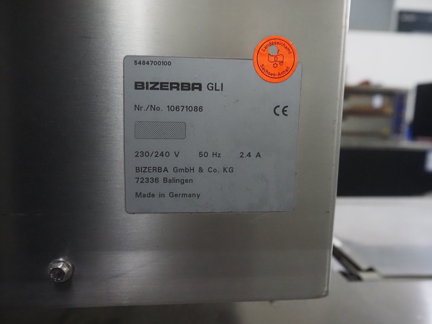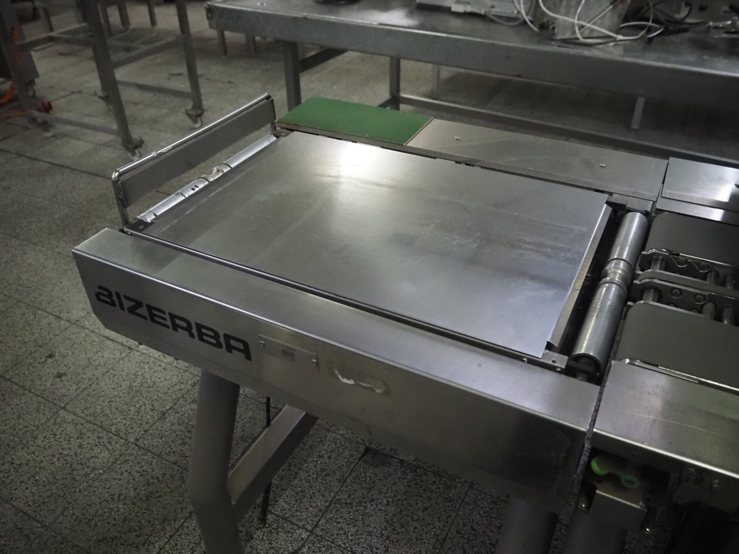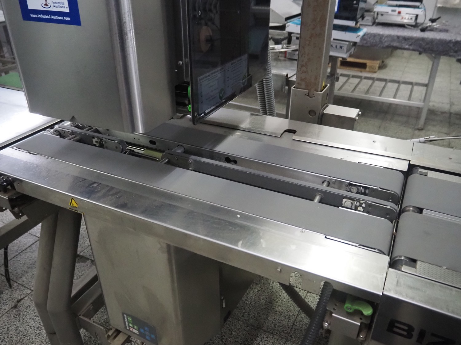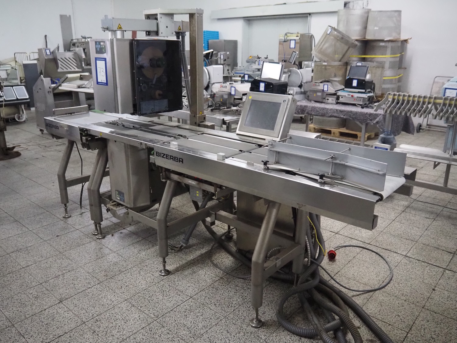 Bizerba weighing- and labelling machine type: GLM-I, number: 10671074, 230 V, 50 Hz, 2.4 A, with 2 labellers, number labeller: 10671086 / 10671082, 230/240 V, 50 Hz, 2.4 A, plastic belt, belt width: (1x) 300 mm, (1x) 90 mm, (2x) 140 mm, total dimensions: 4000 mm x 1000 mm x 1900 mm.