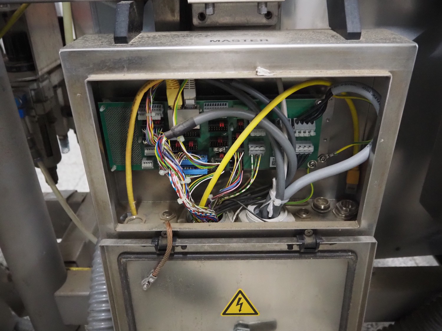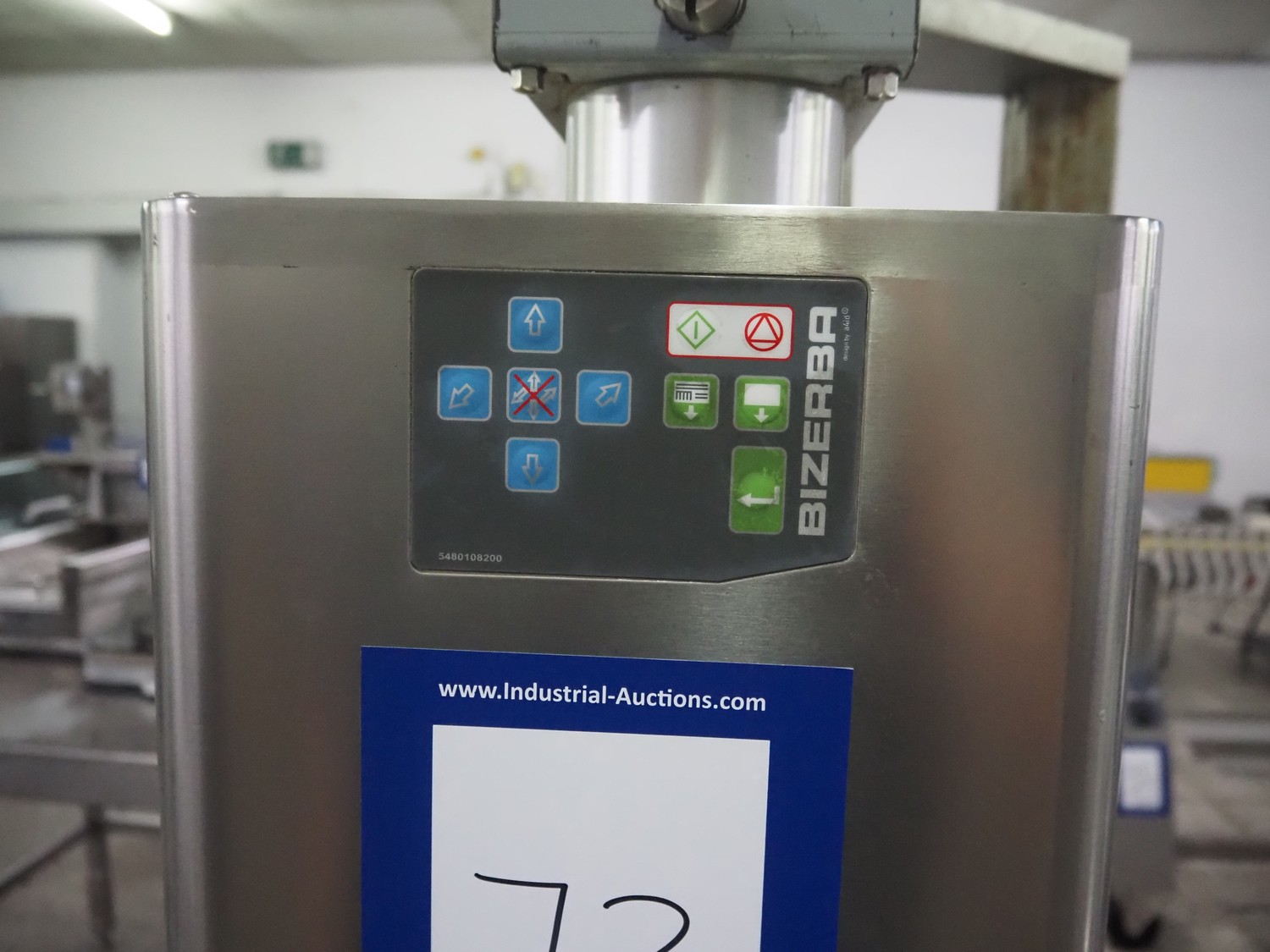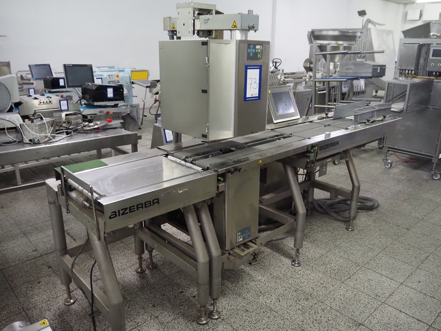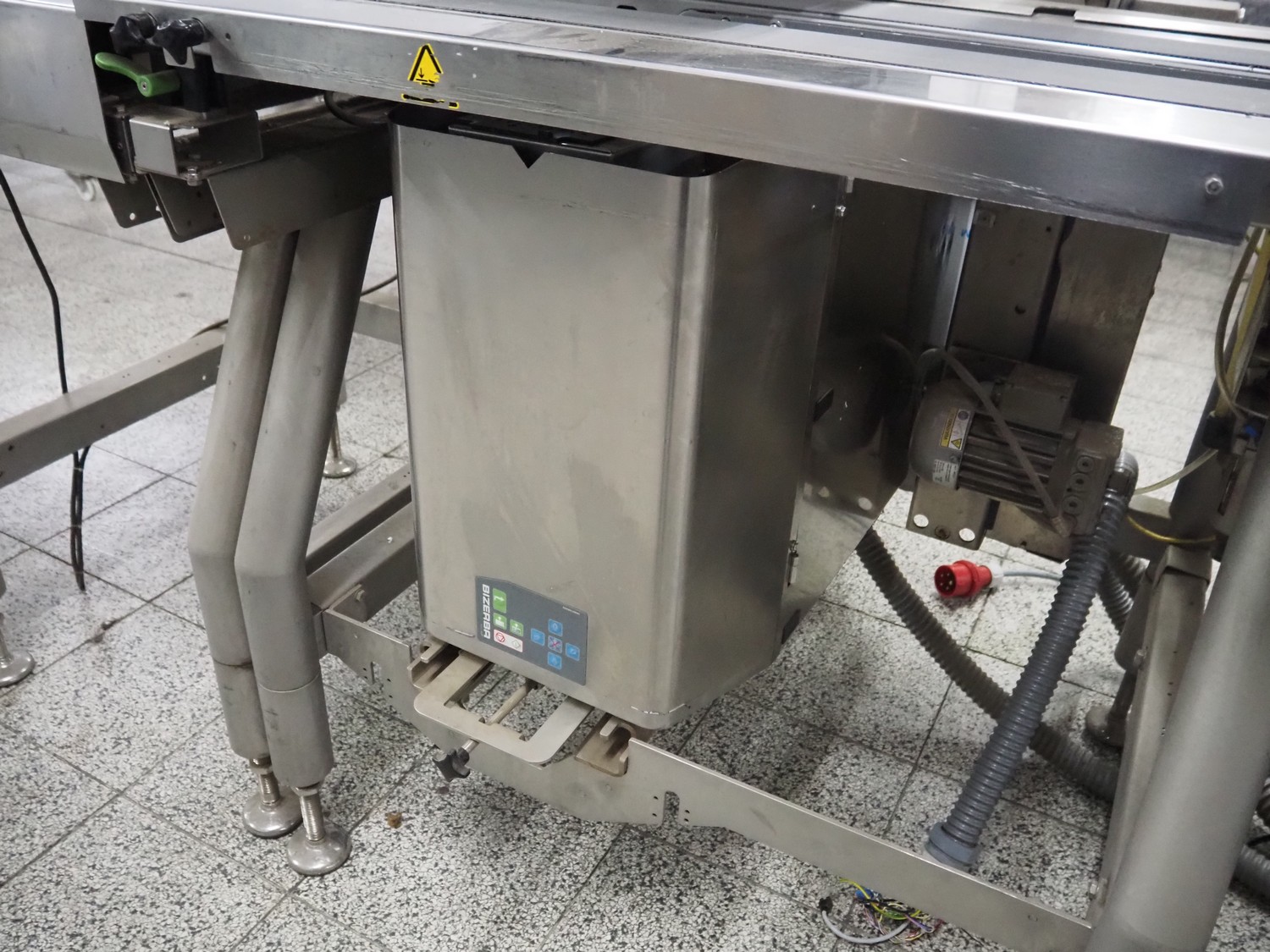 Bizerba weighing- and labelling machine type: GLM-I, number: 10671074, 230 V, 50 Hz, 2.4 A, with 2 labellers, number labeller: 10671086 / 10671082, 230/240 V, 50 Hz, 2.4 A, plastic belt, belt width: (1x) 300 mm, (1x) 90 mm, (2x) 140 mm, total dimensions: 4000 mm x 1000 mm x 1900 mm.