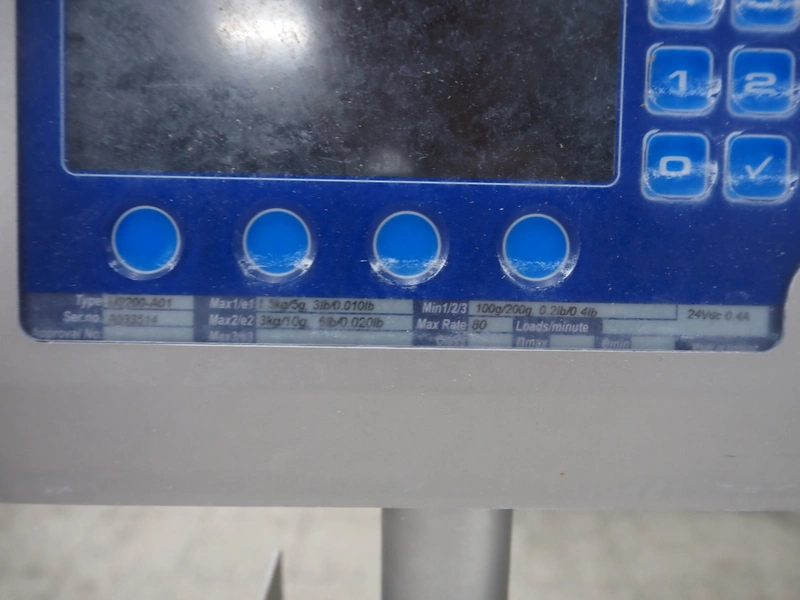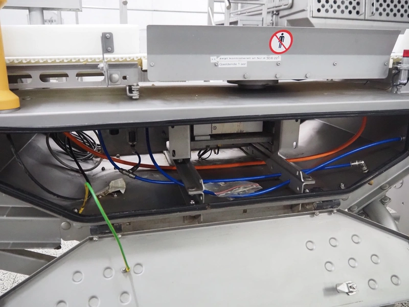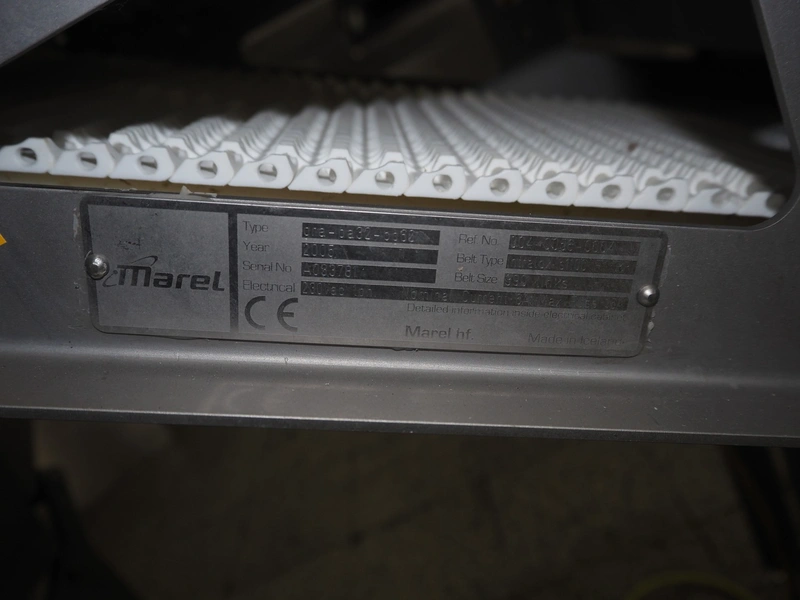 Marel grader and sorting belt with 6 stations, type: gra-pa32-cq60, serial number: A033781, year of construction: 2005, 230 V, 1 Ph, 50 Hz, 6 A, max weight: 3/5 kg, min weight: 100/200 g, max rate: 80/min, plastic belt, belt width: 300 mm, total dimensions: 2900 mm x 560 mm x 1300 mm.