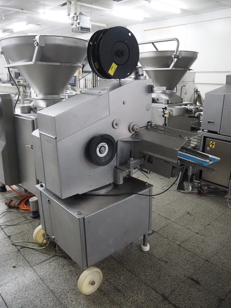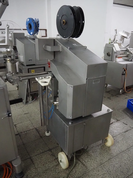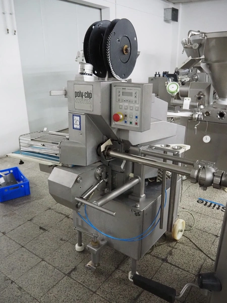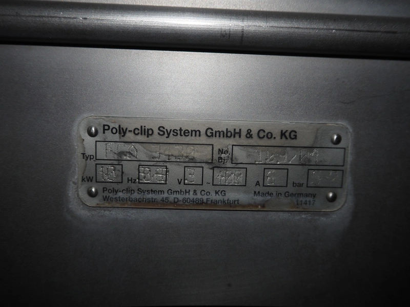 Poly-clip System GmbH & Co. KG mobile double clipper, type: FCA 3430, number: 109, year of construction: 2004, 400 V, 3 Ph, 50/60 Hz, 6 A, 40 kW, plastic belt, belt width: (2x) 75, total dimensions: 1750 mm x 1200 mm x 2000 mm. Including crate with parts.