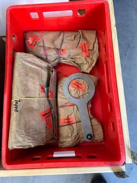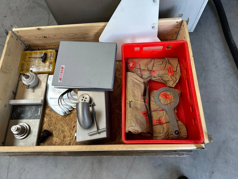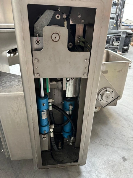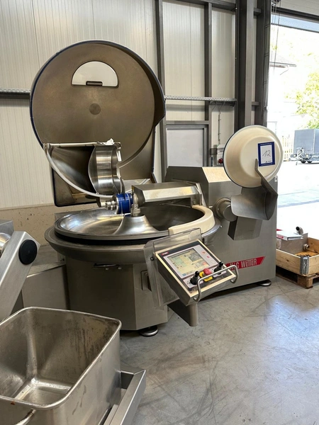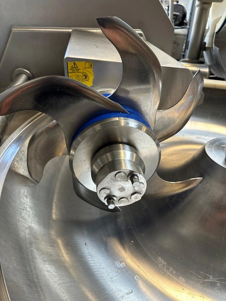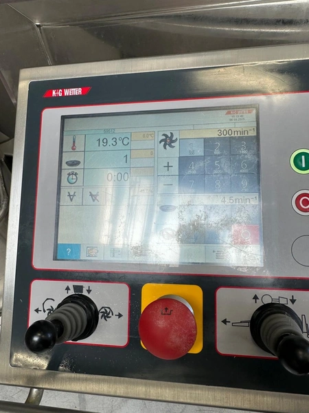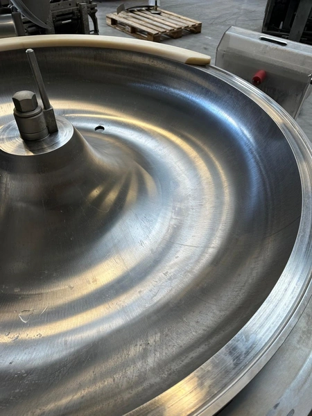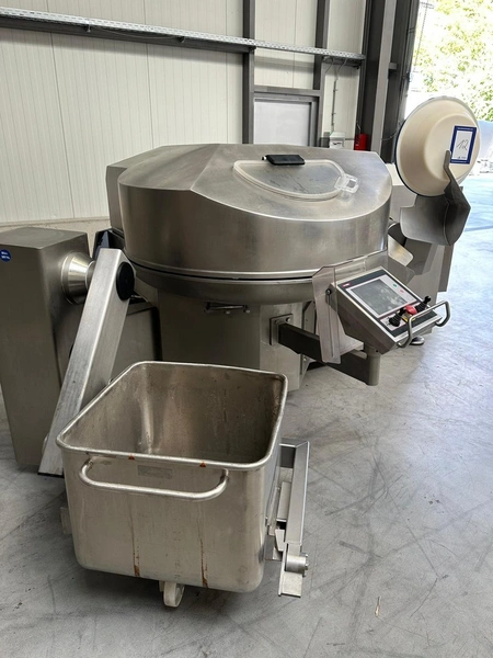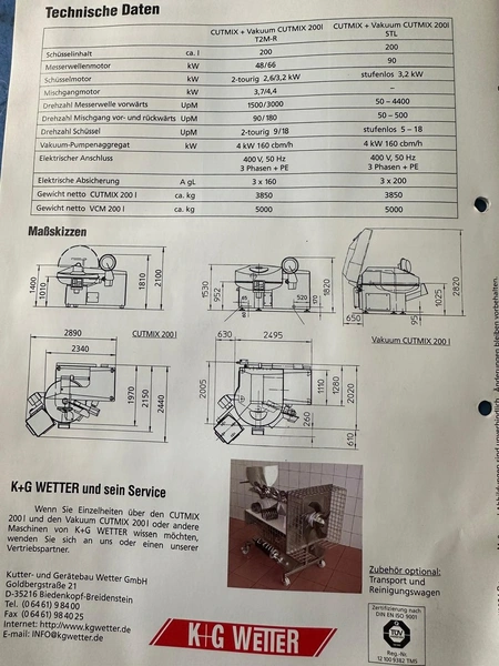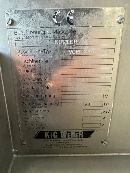 K+G Wetter vacuum cutter with lifter for 200 liter meat bins, type: VCM 200 STL, machine number: 510/1073, year of construction: 2015, 230/400 V, 3 Ph, 50 Hz, 97 kW, weight: 5000 kg, volume: 200 liter, dimensions: 3000 mm x 2100 mm x 1900 mm. Including palletbox with parts.