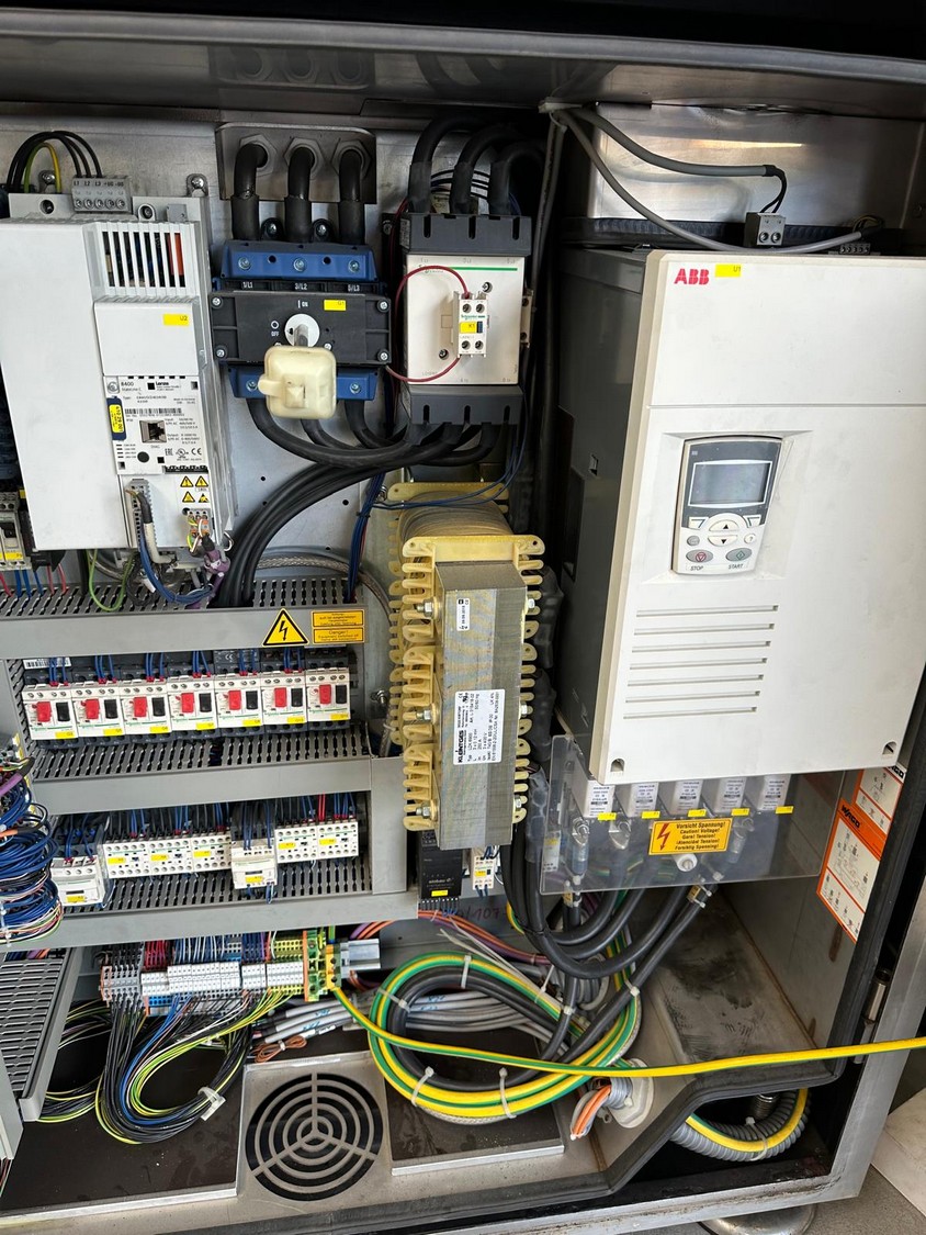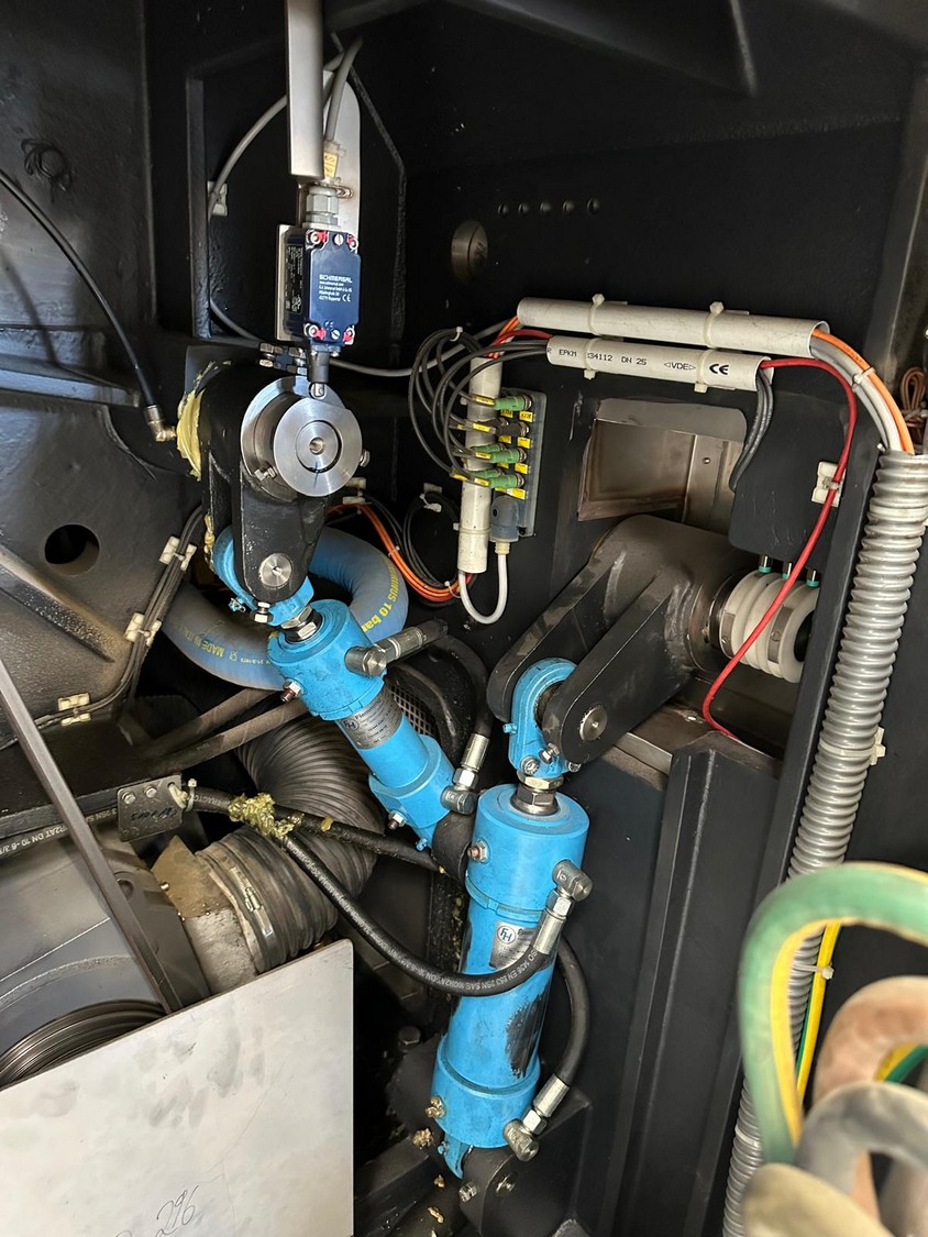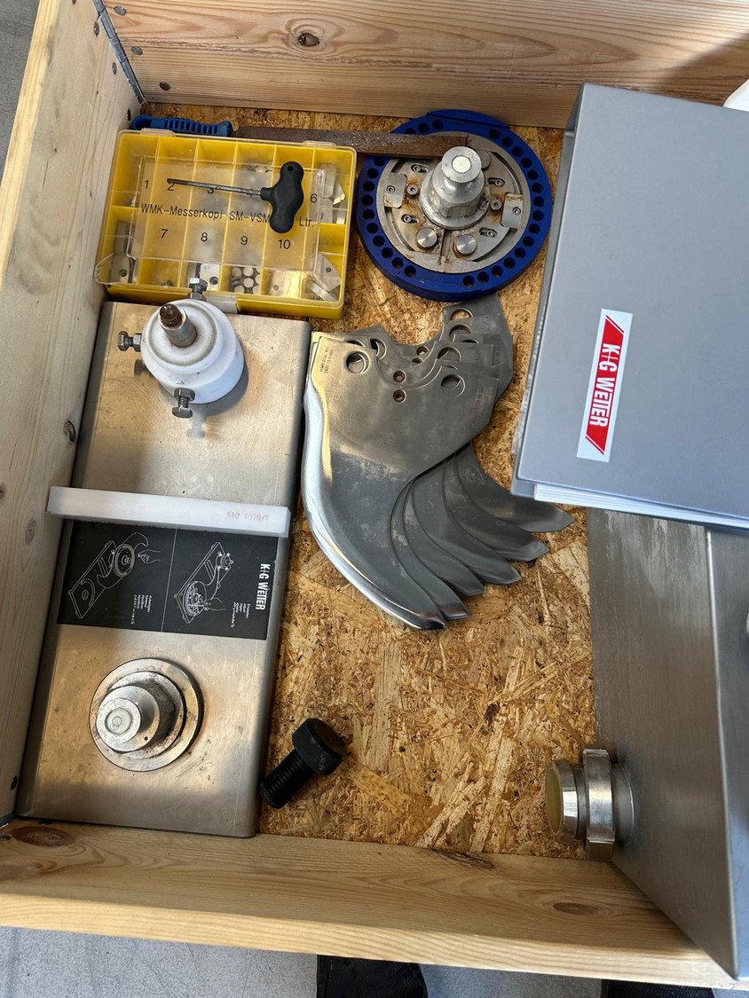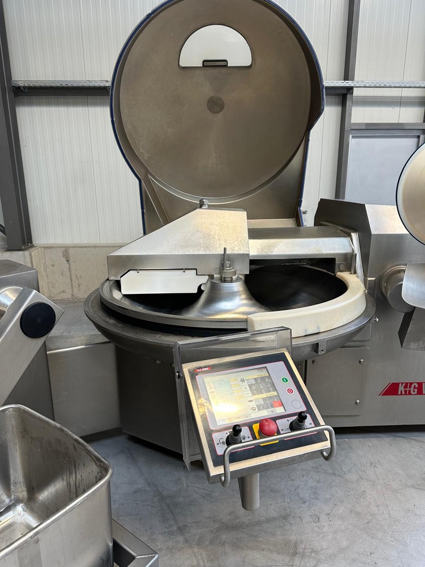 K+G Wetter vacuum cutter with lifter for 200 liter meat bins, type: VCM 200 STL, machine number: 510/1073, year of construction: 2015, 230/400 V, 3 Ph, 50 Hz, 97 kW, weight: 5000 kg, volume: 200 liter, dimensions: 3000 mm x 2100 mm x 1900 mm. Including palletbox with parts.