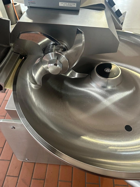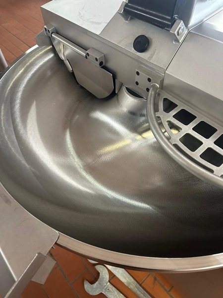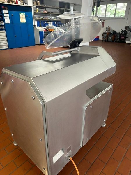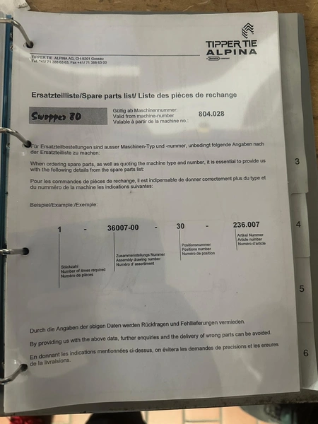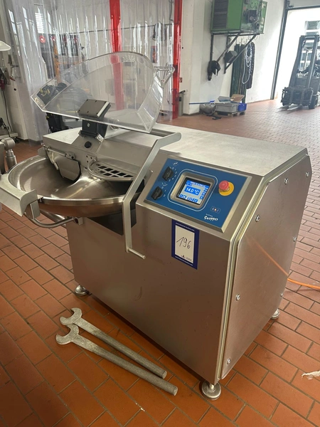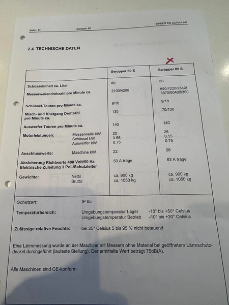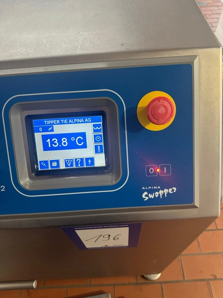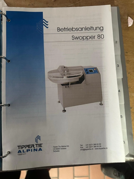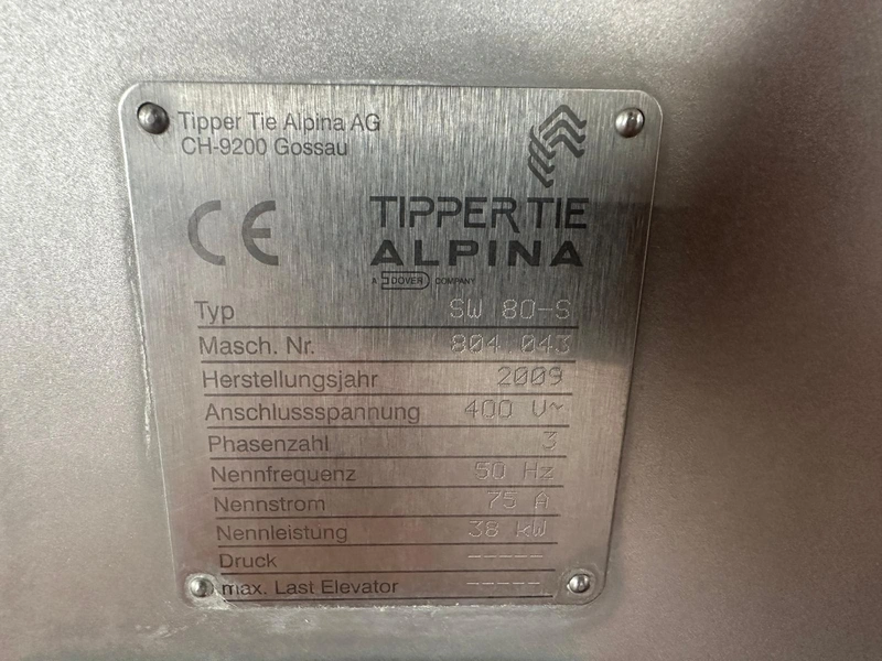 Tipper Tie Alpina cutter with ejecter, type: SW 80-S, machine number: 804.043, year of construction: 2009, 400 V, 3 Ph, 50 Hz, 75 A, 38 kW, capacity: 80 liter, weight: 1050 kg, dimensions: 2150 mm x 1210 mm x 1745 mm.