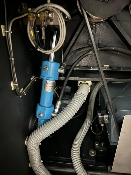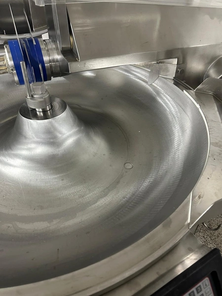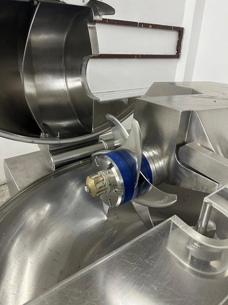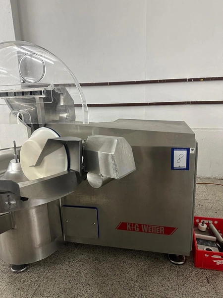 K+G Wetter cutter with lifter for 200 liter meat bins and ejector, type: CM 200 STL, machine number: 410/1120, year of construction: 2014, 400 V, 3 Ph 50 Hz, 90 kW, volume: 200 liter, dimensions: 3500 mm x 3100 mm x 1900 mm. Including crate with parts.