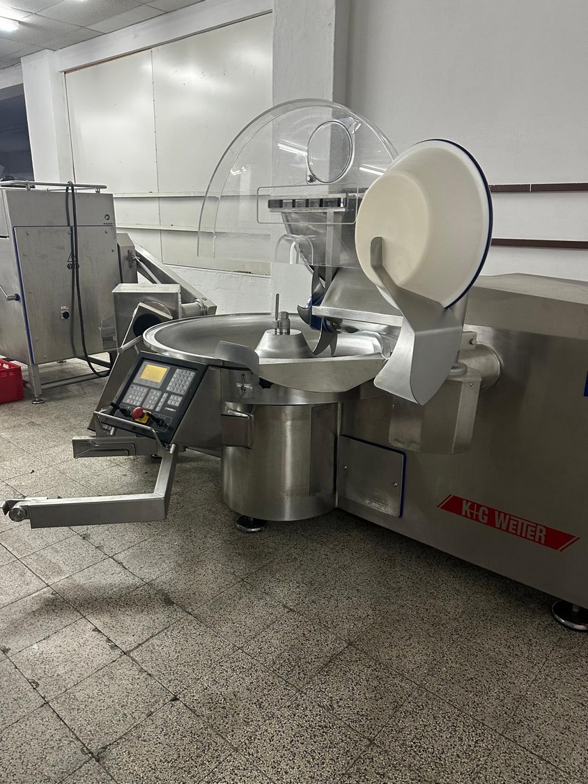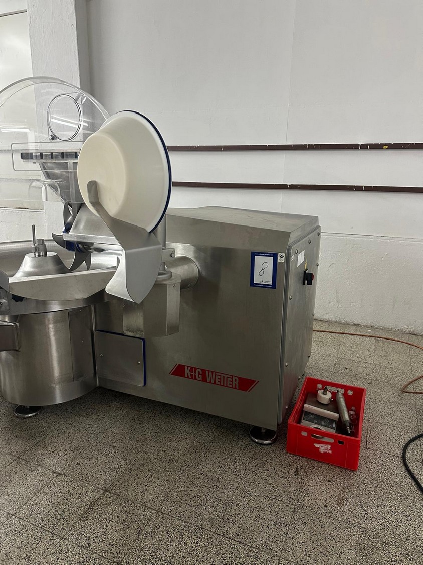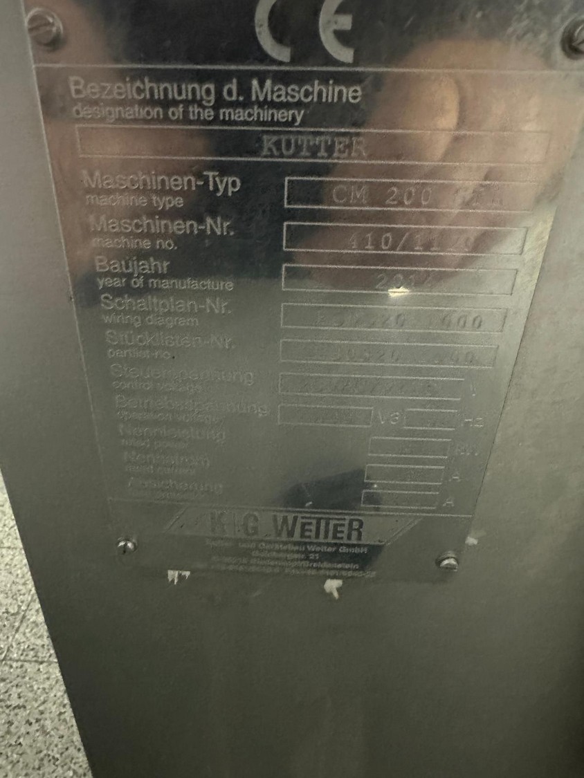K+G Wetter cutter with lifter for 200 liter meat bins and ejector, type: CM 200 STL, machine number: 410/1120, year of construction: 2014, 400 V, 3 Ph 50 Hz, 90 kW, volume: 200 liter, dimensions: 3500 mm x 3100 mm x 1900 mm. Including crate with parts.