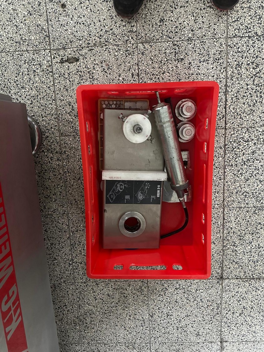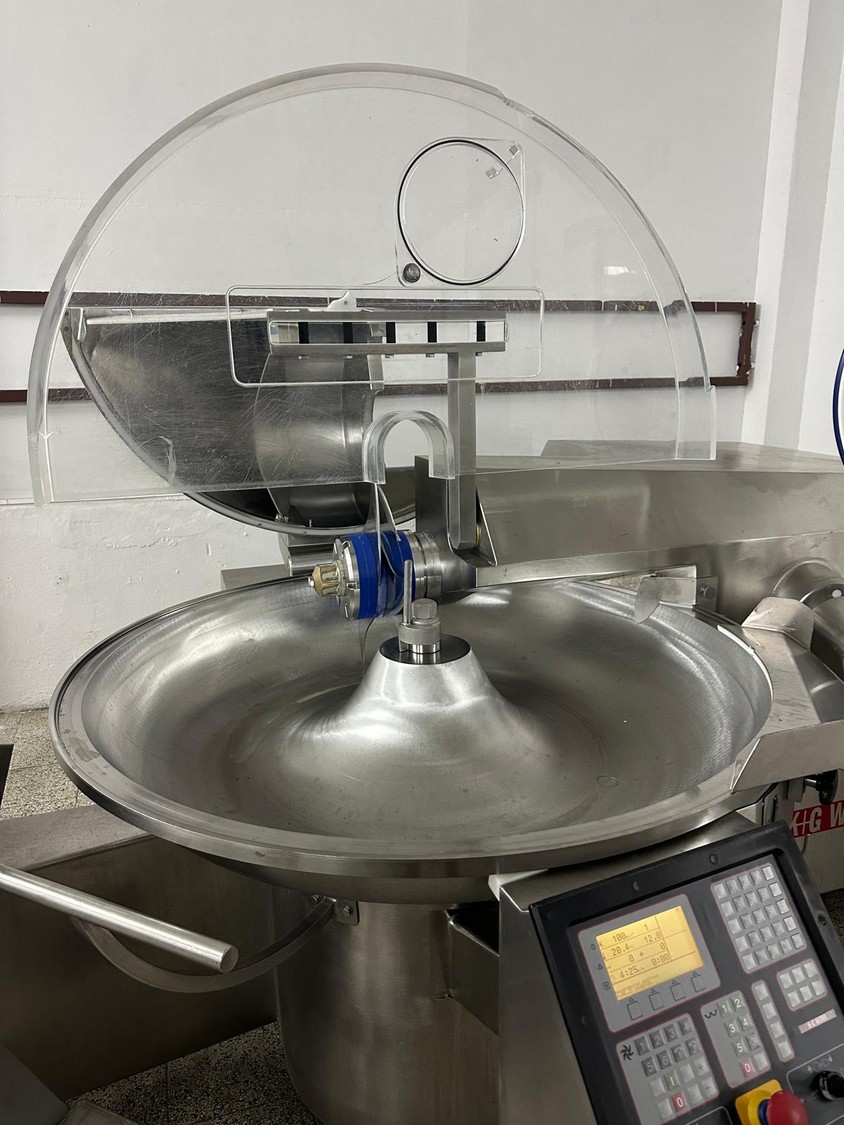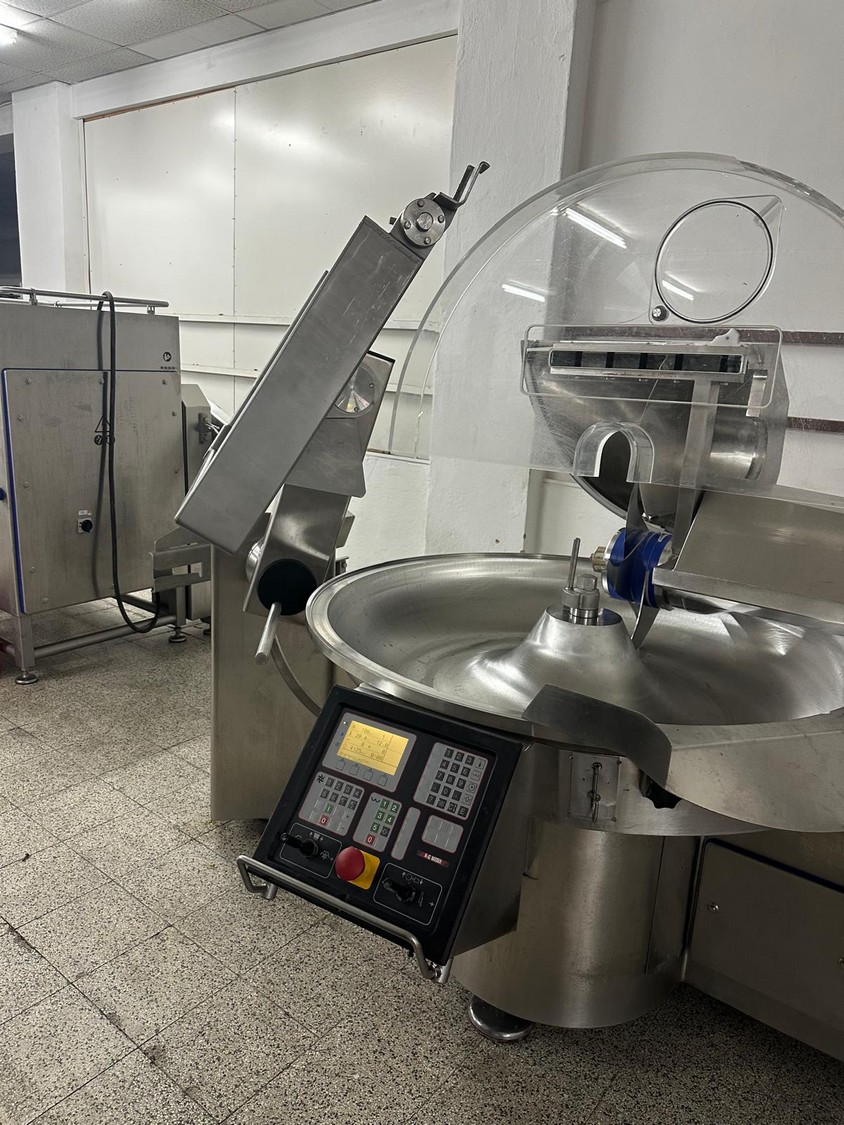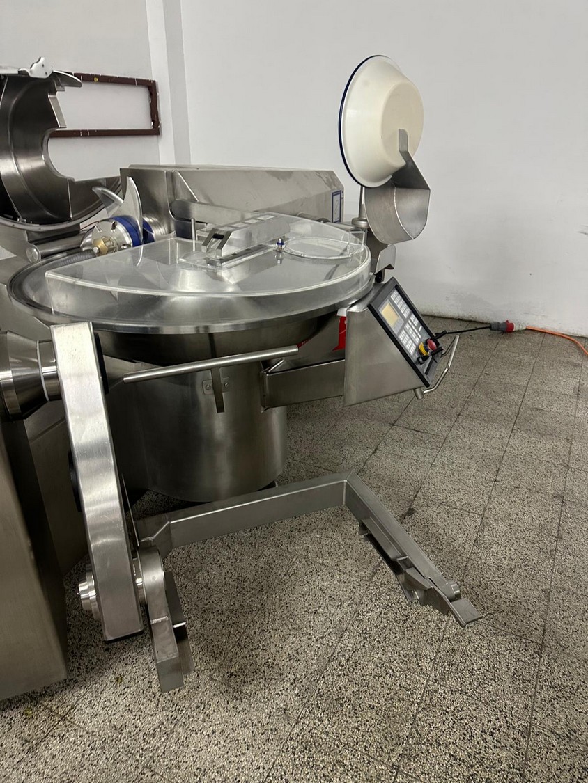 K+G Wetter cutter with lifter for 200 liter meat bins and ejector, type: CM 200 STL, machine number: 410/1120, year of construction: 2014, 400 V, 3 Ph 50 Hz, 90 kW, volume: 200 liter, dimensions: 3500 mm x 3100 mm x 1900 mm. Including crate with parts.