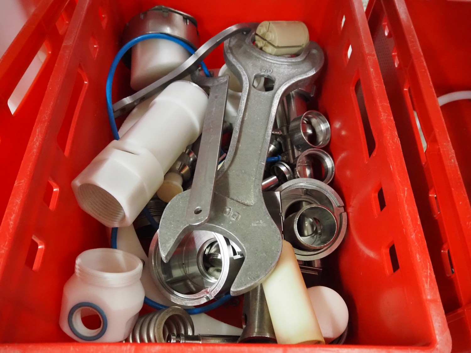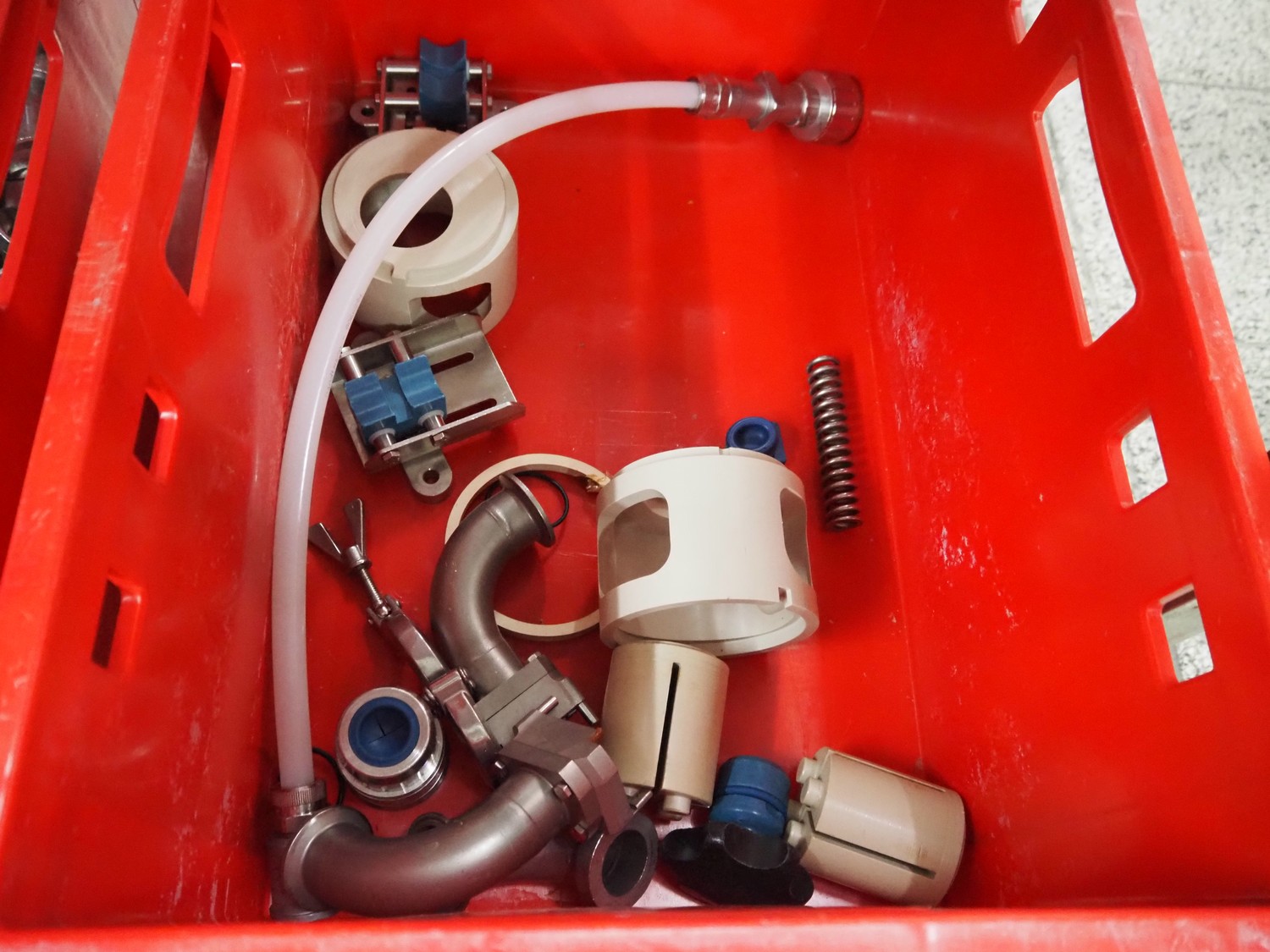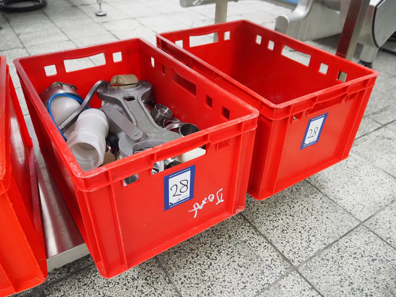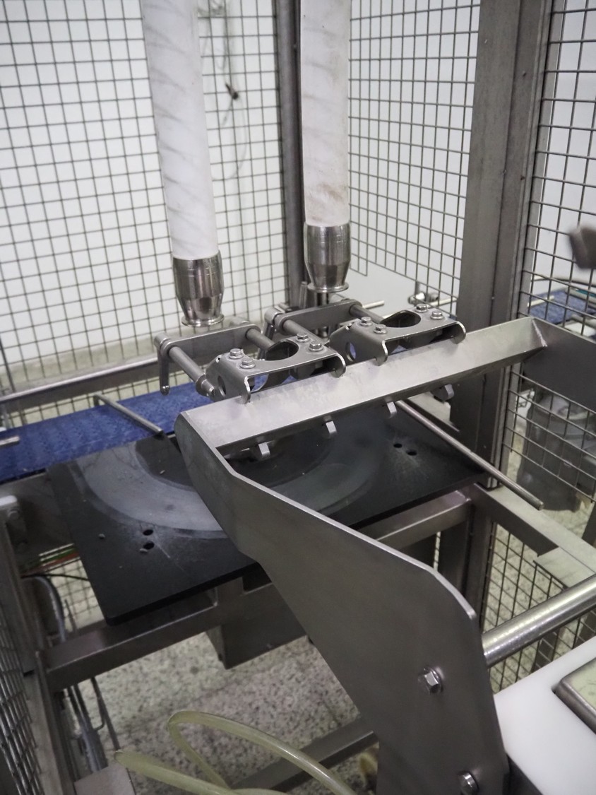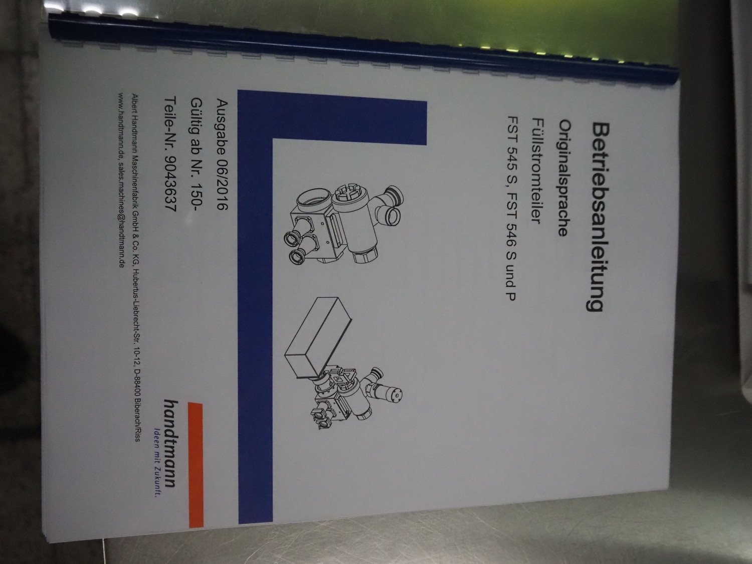 Verbufa mobile dosing / filling machine for cans / pots, type: 52088-A-0084, serial number: 261960, year of construction: 2020, 230 V, 50 Hz, 10 A, 1.6 kW, weight: 400 kg, 2 heads, head dimensions: (2x) Ø 35 mm, total dimensions: 1200 mm x 950 mm x 1900 mm. With Handtmann flow divider, type: FST546, number: 1820494, year of construction: 05-2020, and 2 crates with parts.