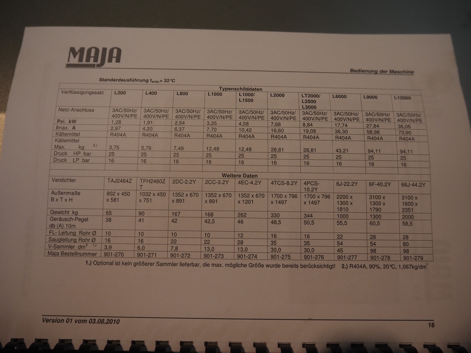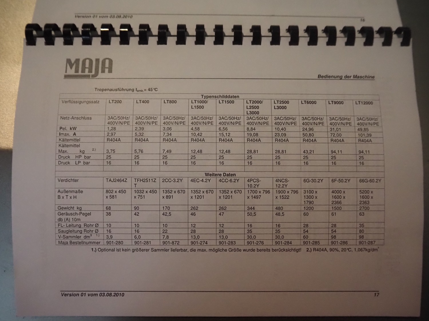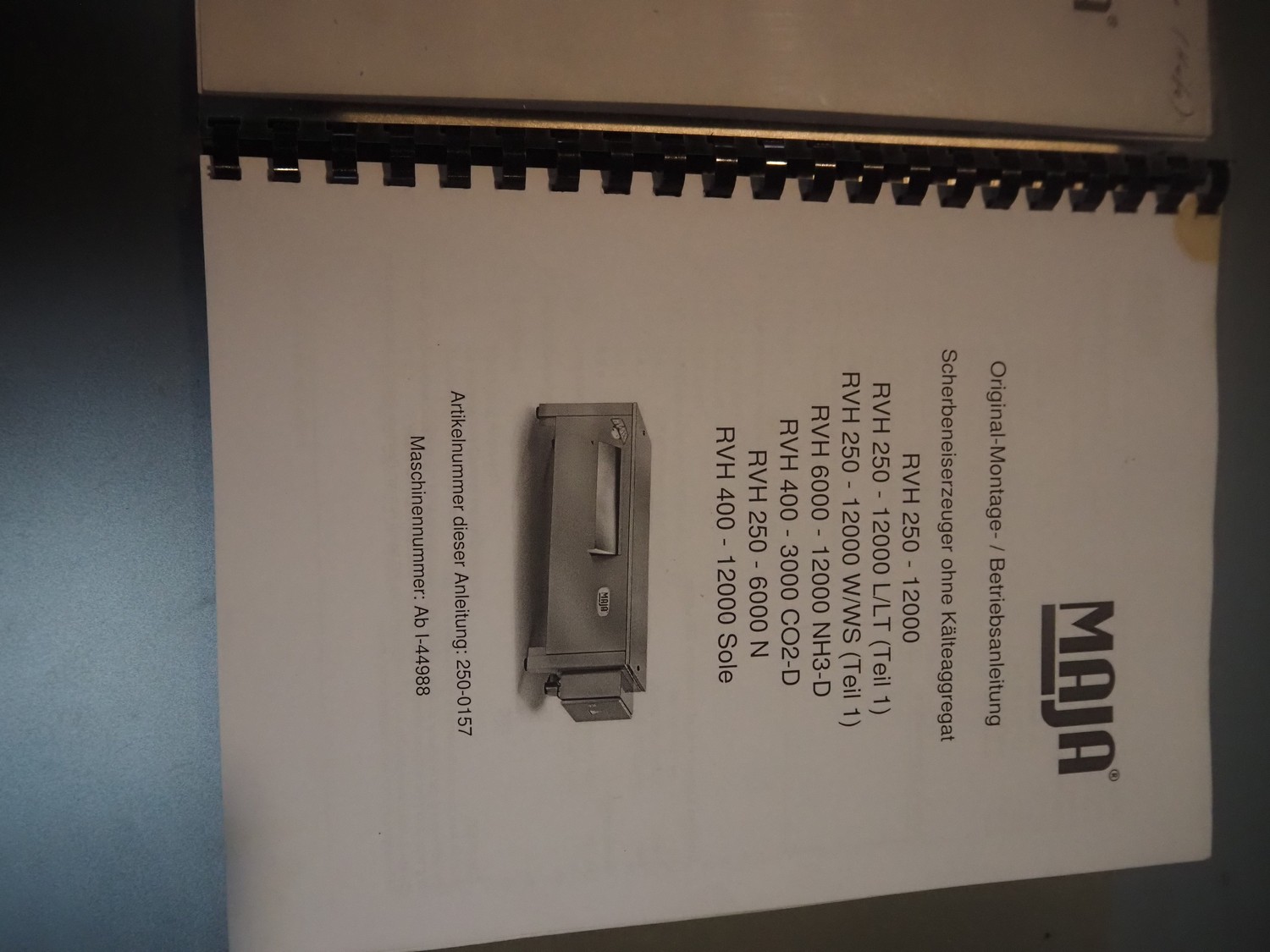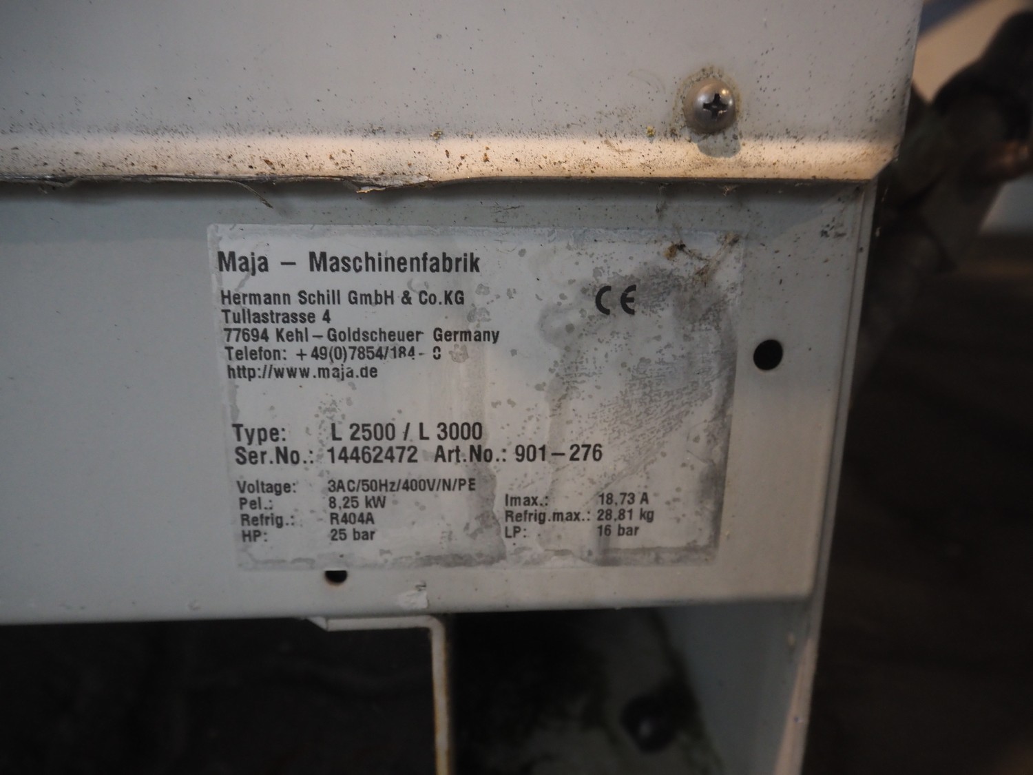 Maja-Maschinenfabrik GmbH flake ice machine with bunker, type: RVH 3000 L, machine number: 1-45147, year of construction: 2014, 400 V, 3 Ph, 50 Hz, 1.16 A, 0.34 kW, refrigerant: R 404A, dimensions ice machine: 1800 mm x 950 mm x 550 mm, dimensions bunker: 1700 mm x 1250 mm x 2500 mm. Including Maja-Maschinenfabrik cooling unit, dimensions unit: 1800 mm x 1000 mm x 1500 mm.