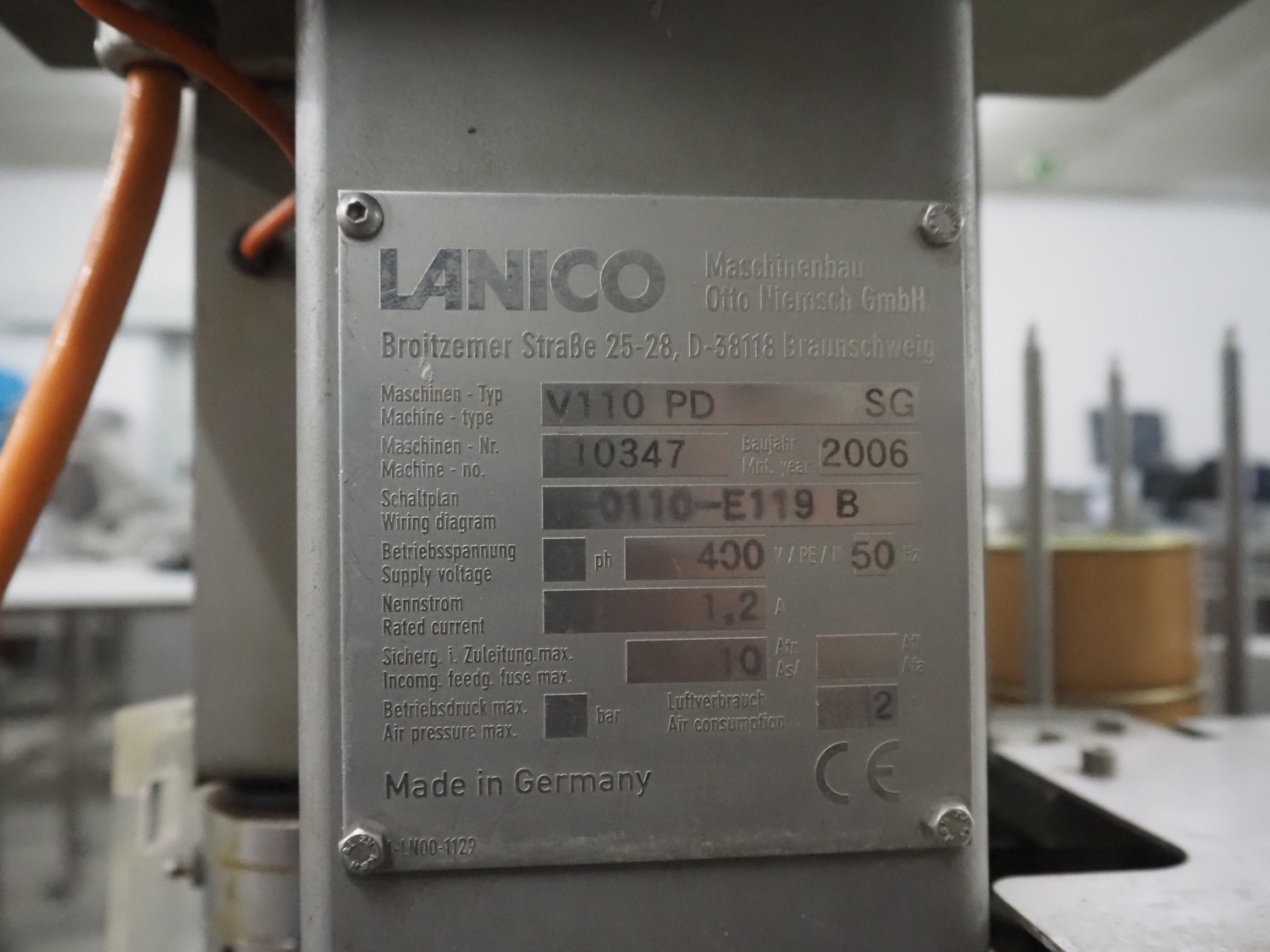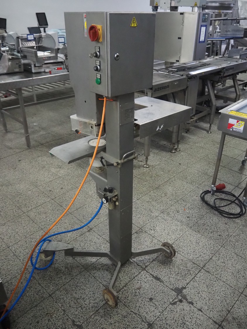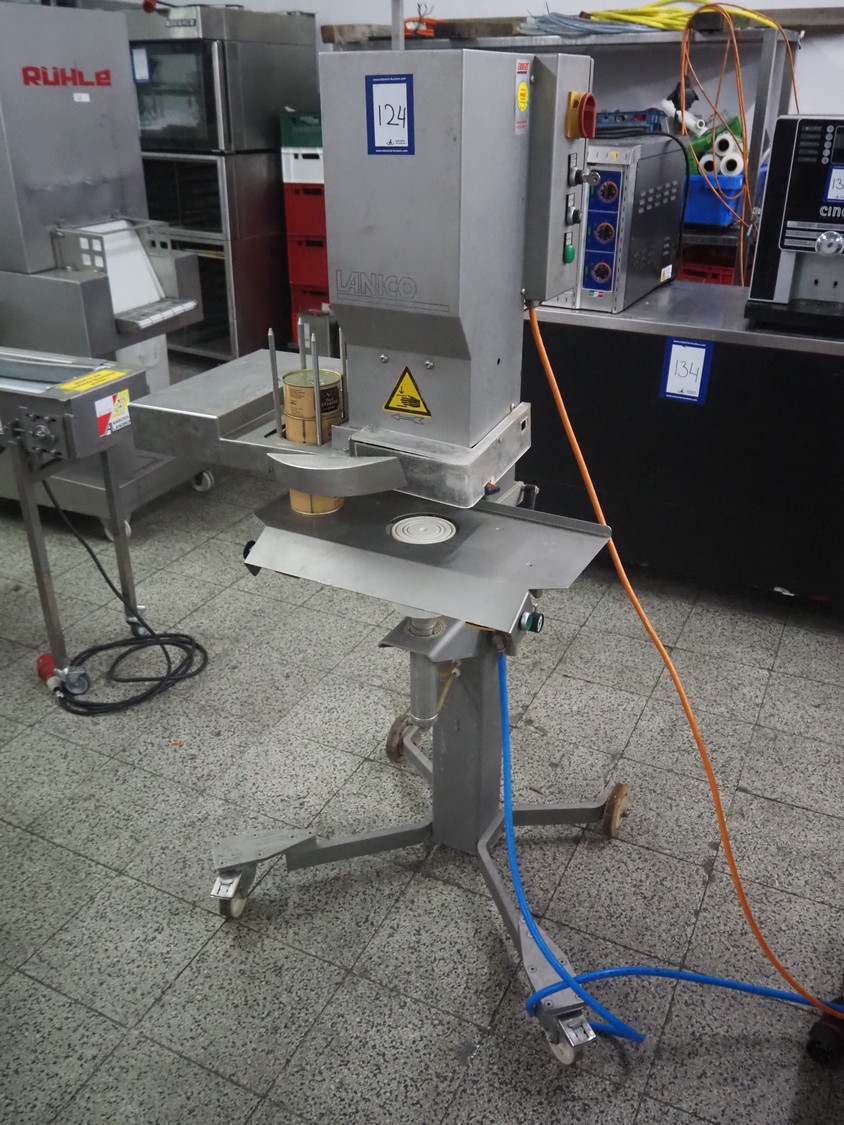 Lanico mobile can seamer, type: V110 PD, serial number: 110441, year of construction: 2012, 400 V, 3 Ph, 50 Hz, 1.8 A, air pressure: 6 bar, can diameter: 118 mm, total dimensions: 900 mm x 700 mm x 660 mm.