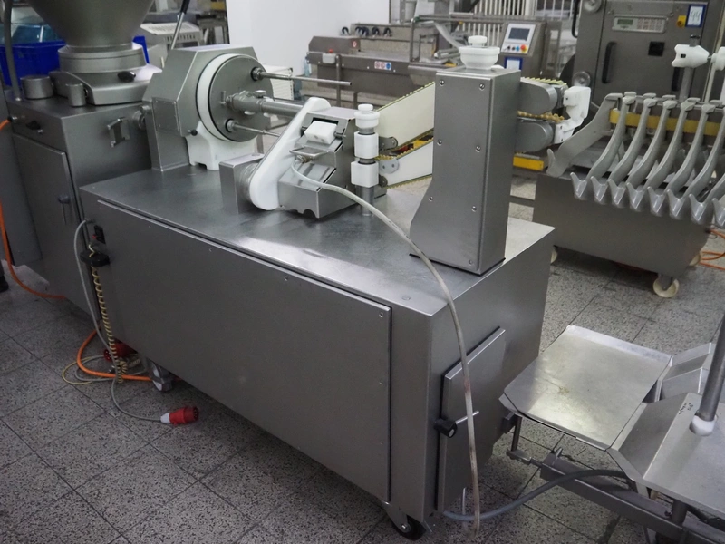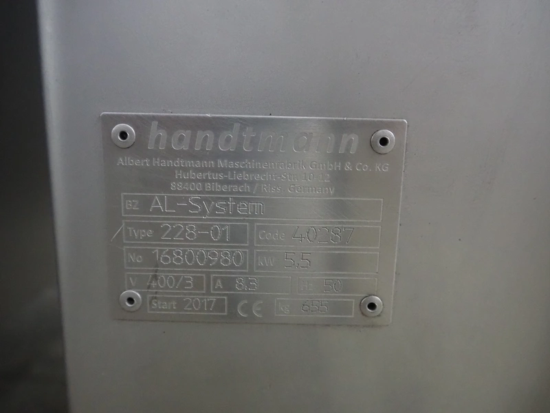 Handtmann mobile linking machine, type: 228-01, number: 16800980, year of construction: 2017, 400 V, 3 Ph, 50 Hz, 8.3 A, 5.5 kW, weight: 655 kg, dimensions: 1800 mm x 900 mm x 1500 mm.