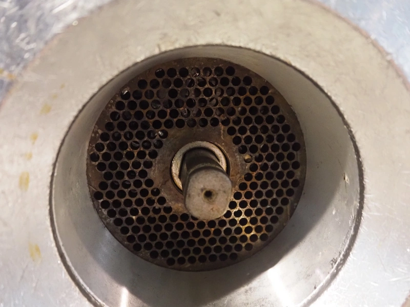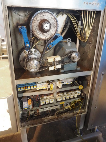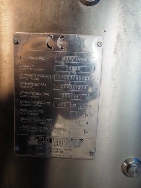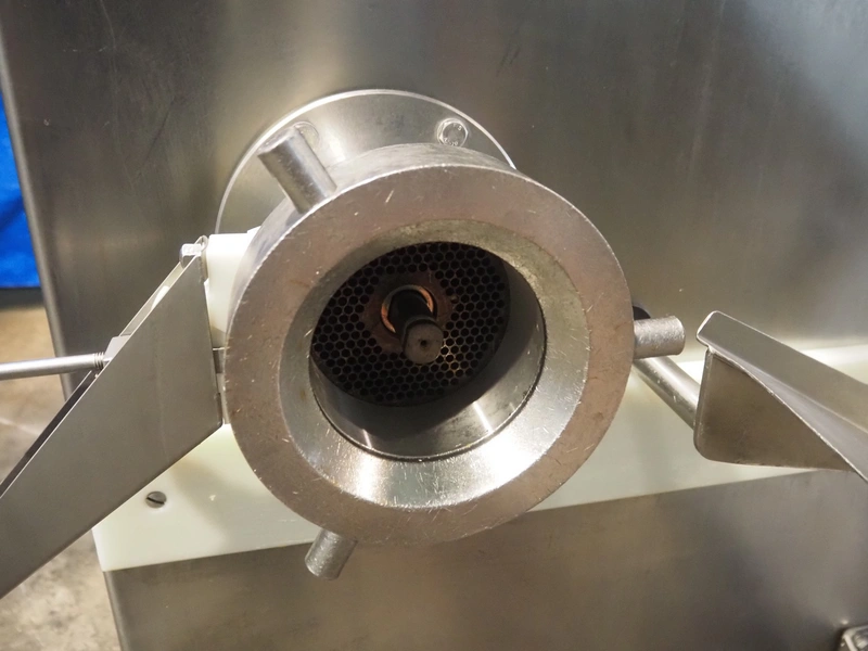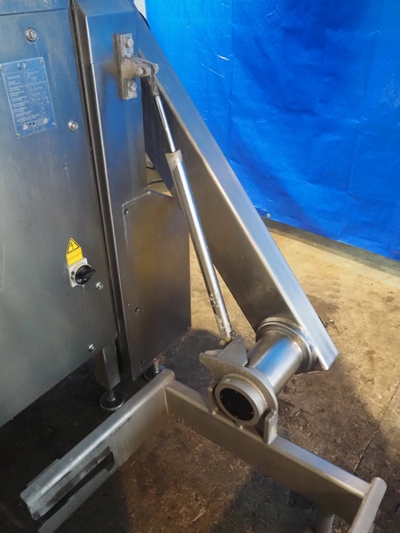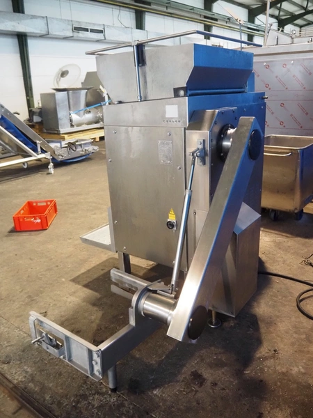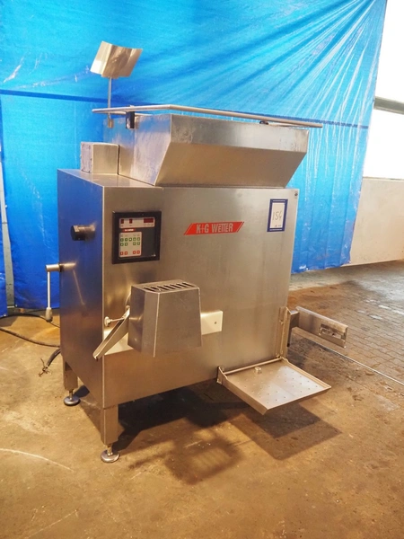 K+G Wetter paddle mixer-grinder with lifter for 200 liter meat bins, machine number: 419/1084, year of construction: 2006, 230/400 V, 3 Ph, 50 Hz, 45/50 A, 21 kW, plate diameter: 130 mm, total dimensions: 2350 mm x 1500 mm x 2200 mm. Including crate with plates.