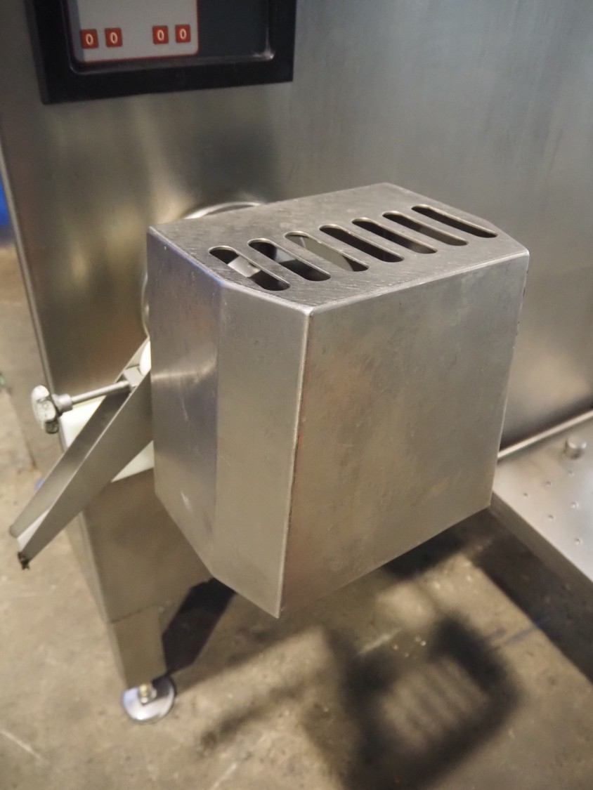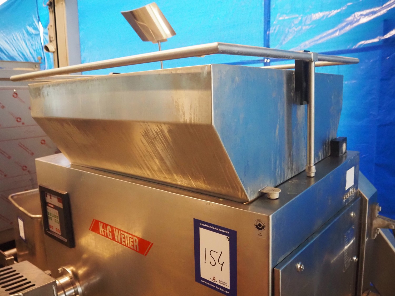 K+G Wetter paddle mixer-grinder with lifter for 200 liter meat bins, machine number: 419/1084, year of construction: 2006, 230/400 V, 3 Ph, 50 Hz, 45/50 A, 21 kW, plate diameter: 130 mm, total dimensions: 2350 mm x 1500 mm x 2200 mm. Including crate with plates.