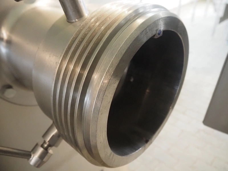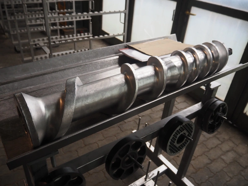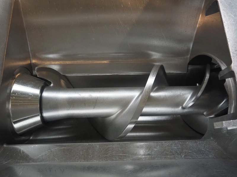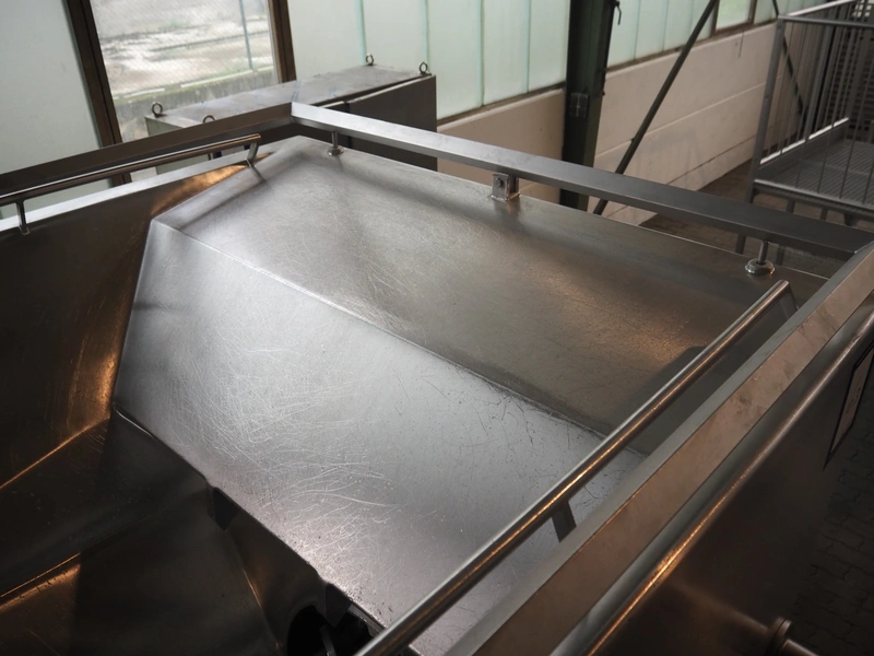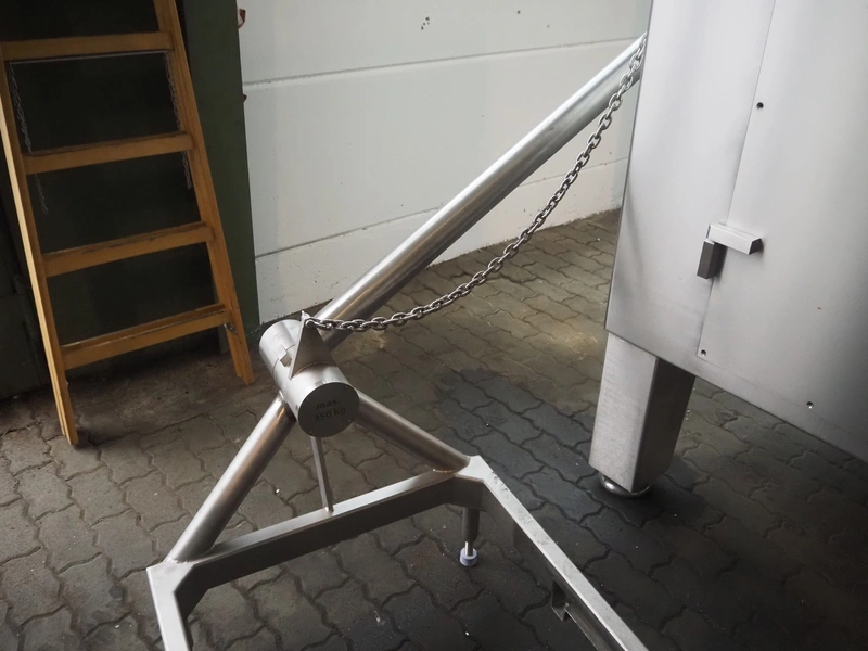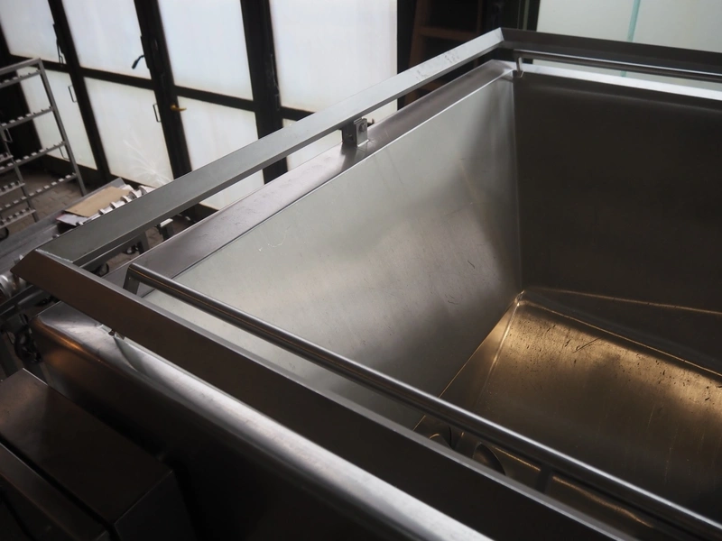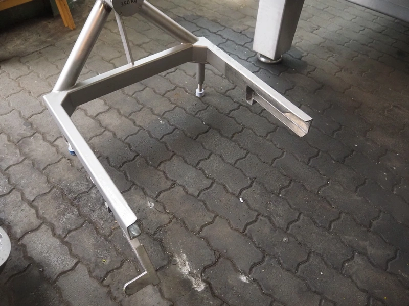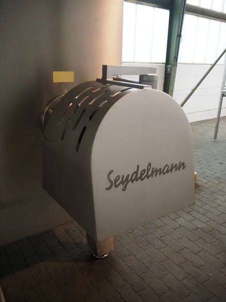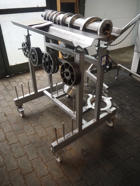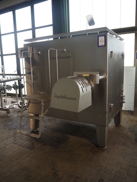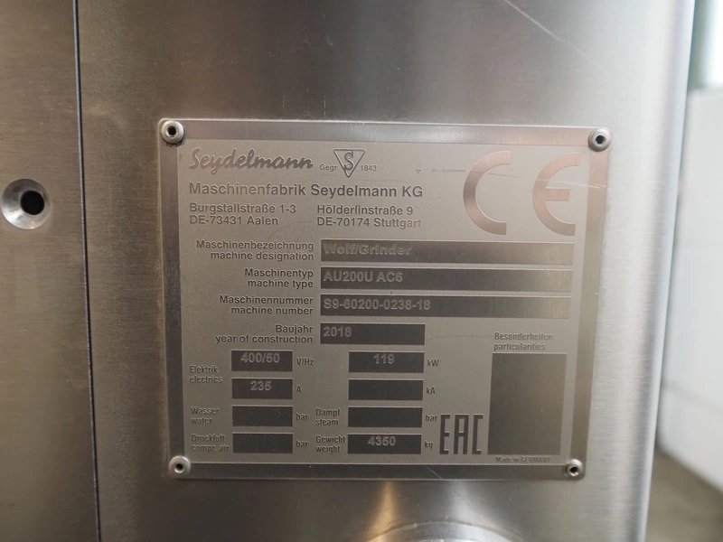 Seydelmann grinder with lifter for 200 liter meat bins, type: AU 200U AC6, serial number: S9-60200-0238-18, year of construction: 2018, 400 V, 50 Hz, 235 A, 119 kW, weight: 4350 kg, plate diameter: 200 mm, dimensions: 3500 mm x 2600 mm x 2900 mm. With s/s switch cabinet dimensions: 1450 mm x 500 mm x 2100 mm, pallet with power cable, dimensions: 1200 mm x 800 mm and s/s tool trolley with auger, knifes and plates, dimensions: 1200 mm x 950 mm x 1200 mm.