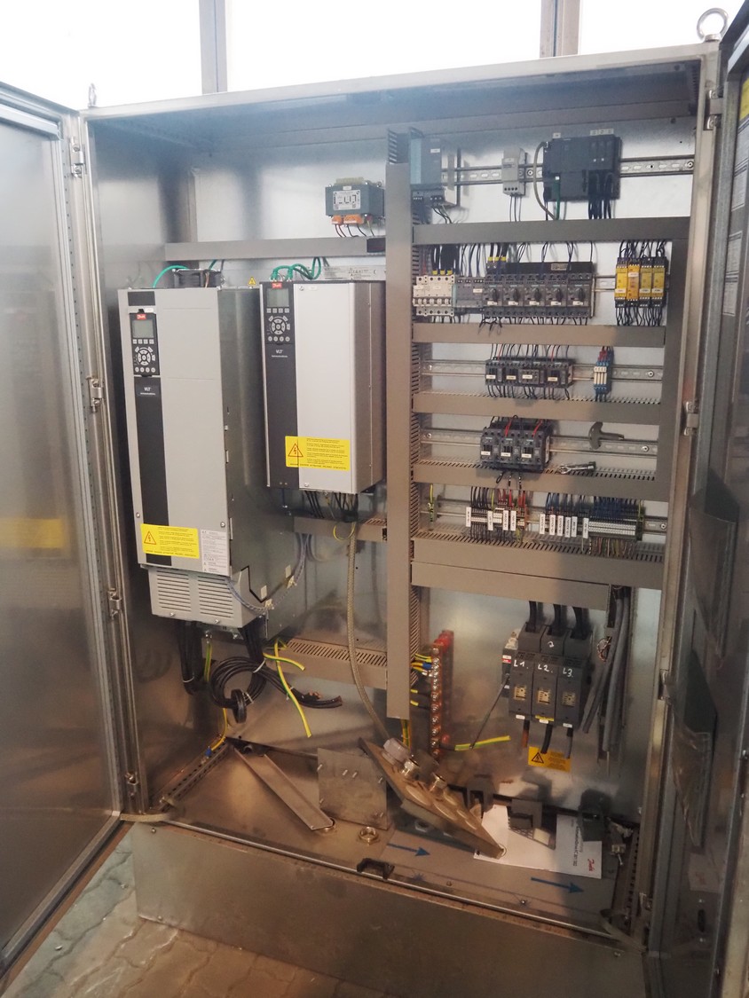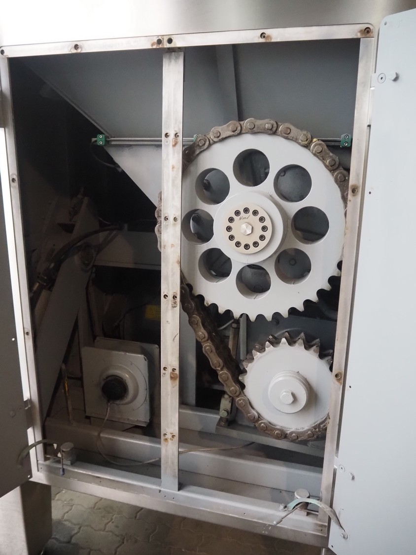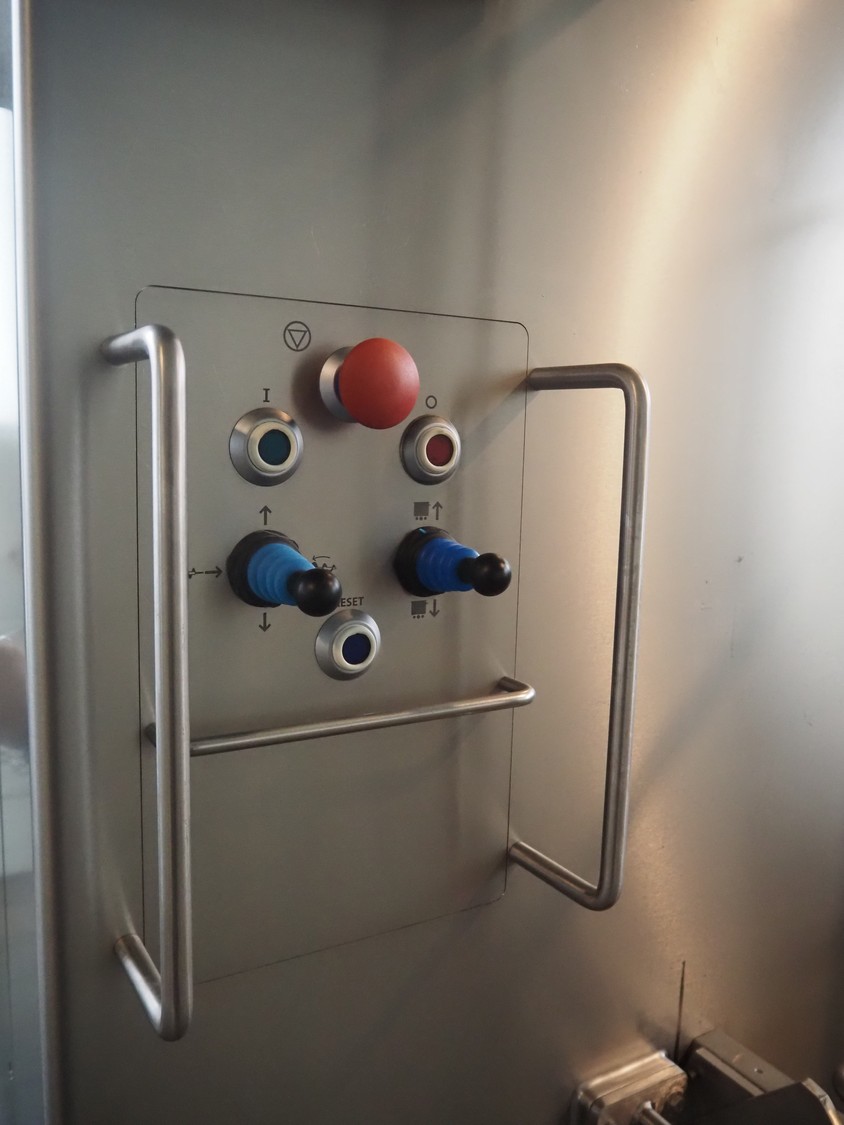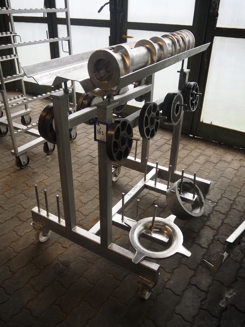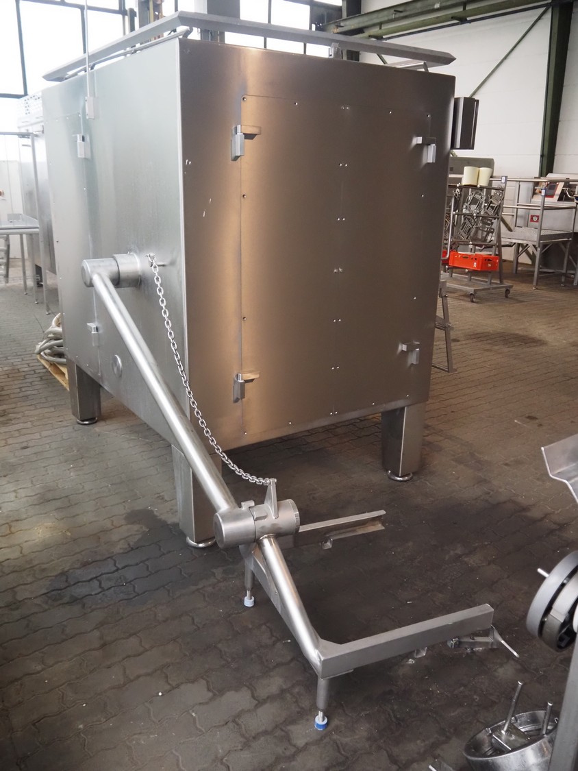 Seydelmann grinder with lifter for 200 liter meat bins, type: AU 200U AC6, serial number: S9-60200-0238-18, year of construction: 2018, 400 V, 50 Hz, 235 A, 119 kW, weight: 4350 kg, plate diameter: 200 mm, dimensions: 3500 mm x 2600 mm x 2900 mm. With s/s switch cabinet dimensions: 1450 mm x 500 mm x 2100 mm, pallet with power cable, dimensions: 1200 mm x 800 mm and s/s tool trolley with auger, knifes and plates, dimensions: 1200 mm x 950 mm x 1200 mm.
