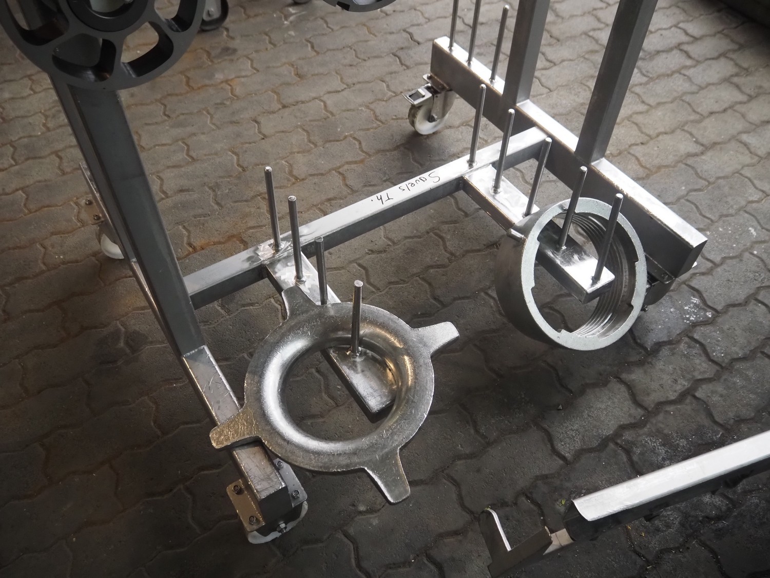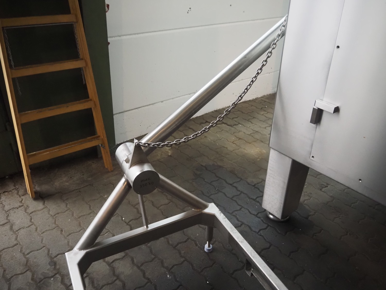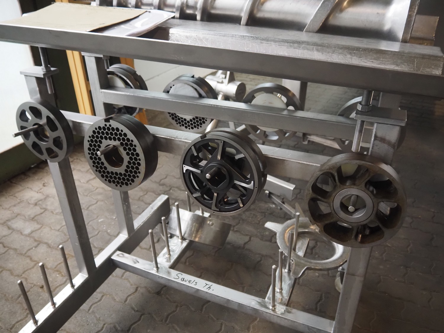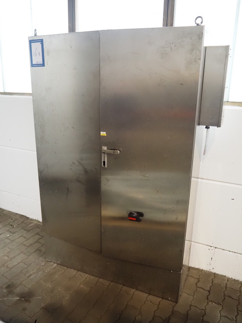 Seydelmann grinder with lifter for 200 liter meat bins, type: AU 200U AC6, serial number: S9-60200-0238-18, year of construction: 2018, 400 V, 50 Hz, 235 A, 119 kW, weight: 4350 kg, plate diameter: 200 mm, dimensions: 3500 mm x 2600 mm x 2900 mm. With s/s switch cabinet dimensions: 1450 mm x 500 mm x 2100 mm, pallet with power cable, dimensions: 1200 mm x 800 mm and s/s tool trolley with auger, knifes and plates, dimensions: 1200 mm x 950 mm x 1200 mm.