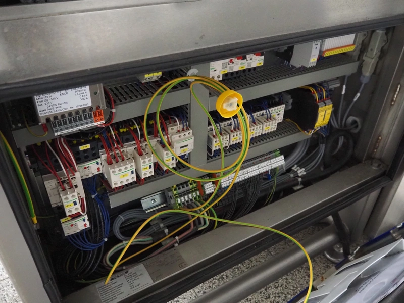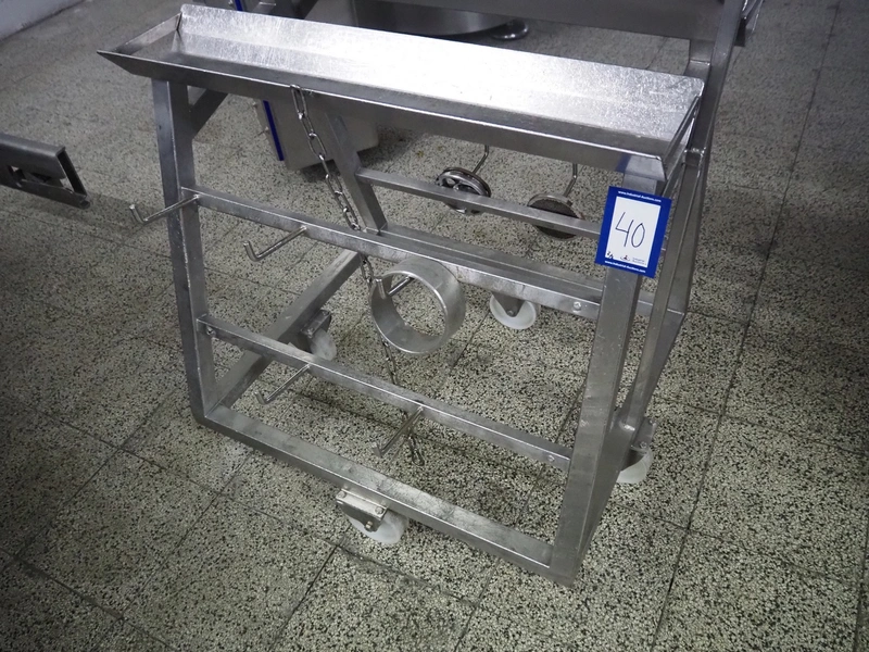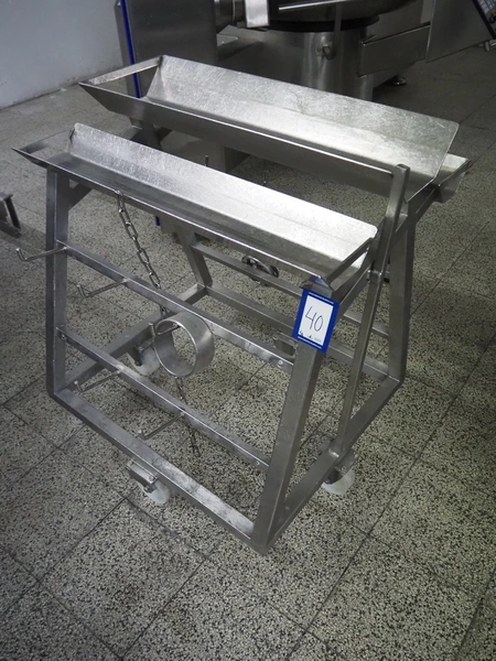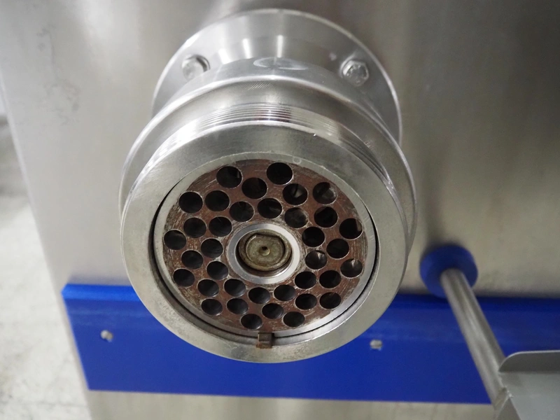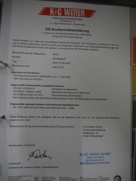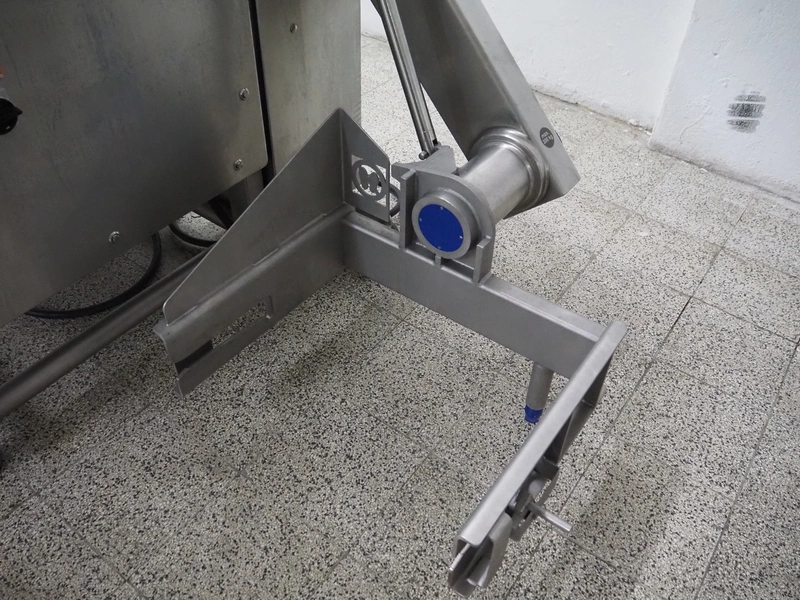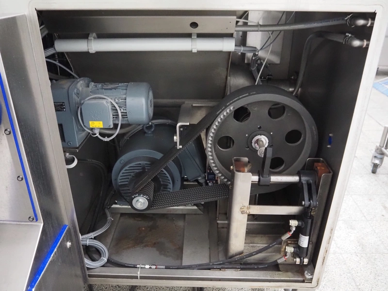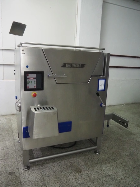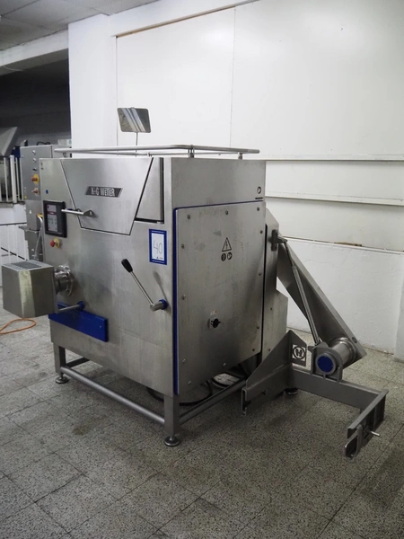 K+G Wetter grinder with lifter for 200 liter meat bins, type: WW E130-442, machine number: 442/1035, year of construction: 2020, 400 V, 3 Ph, 50 Hz, 40/50 A, 19 kW, plate diameter: 130 mm, total dimensions: 2600 mm x 1750 mm x 2200 mm. Including s/s tool trolley, dimensions: 850 mm x 800 mm x 1000 mm.