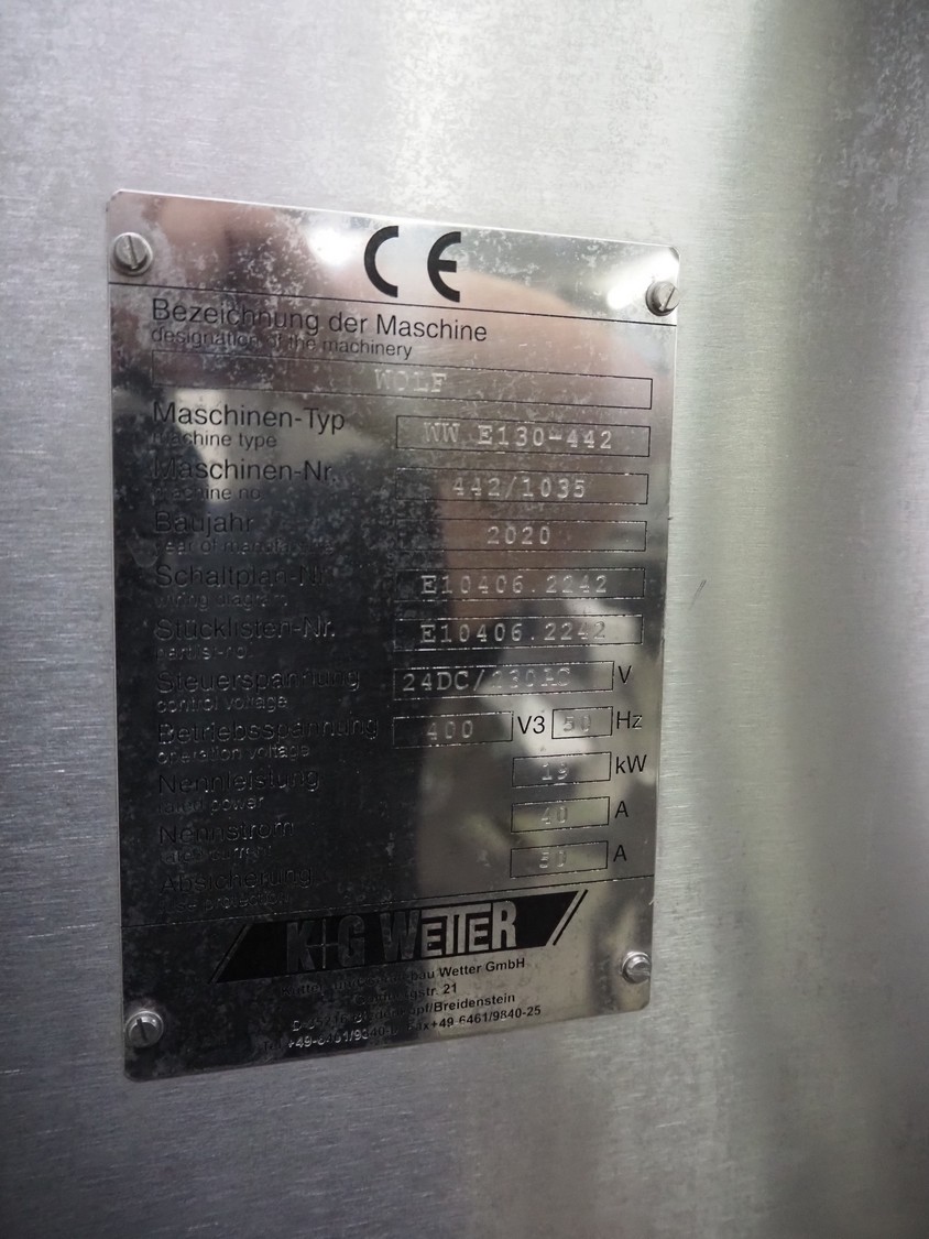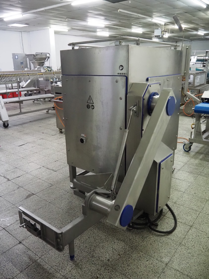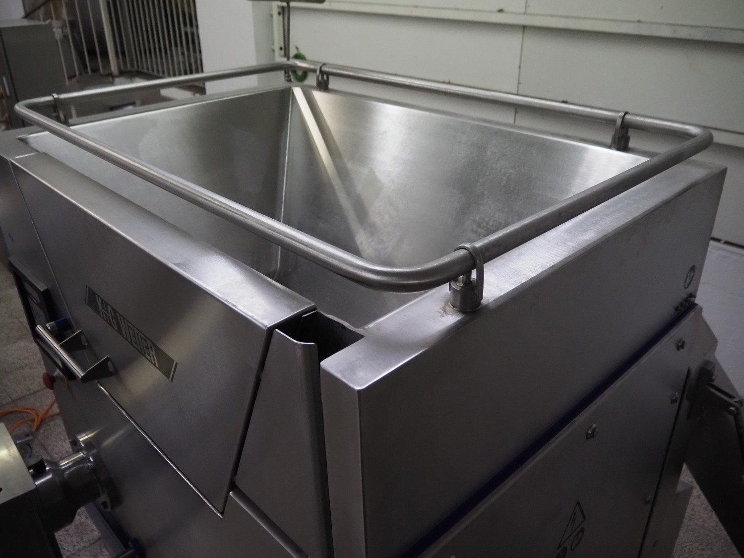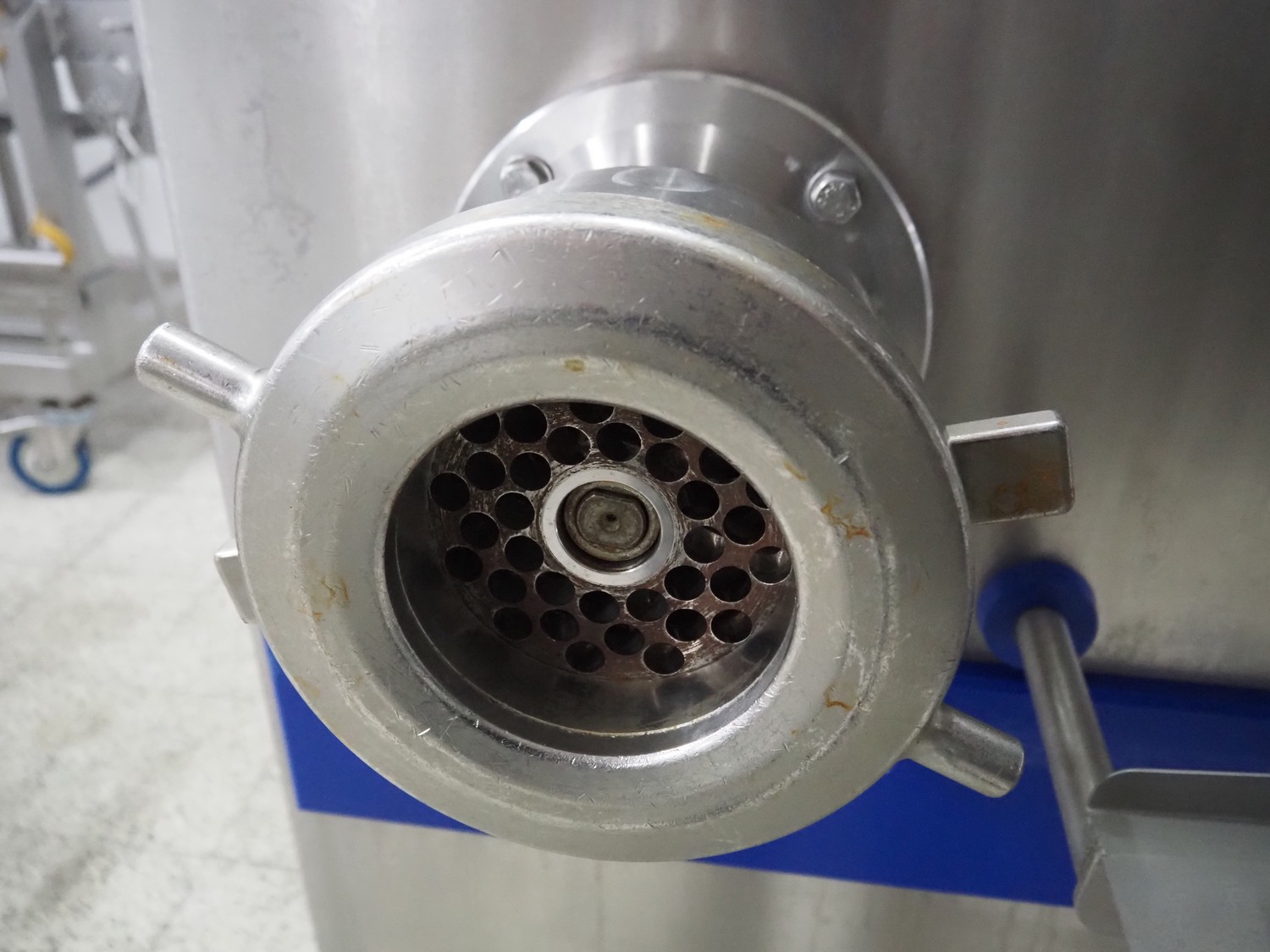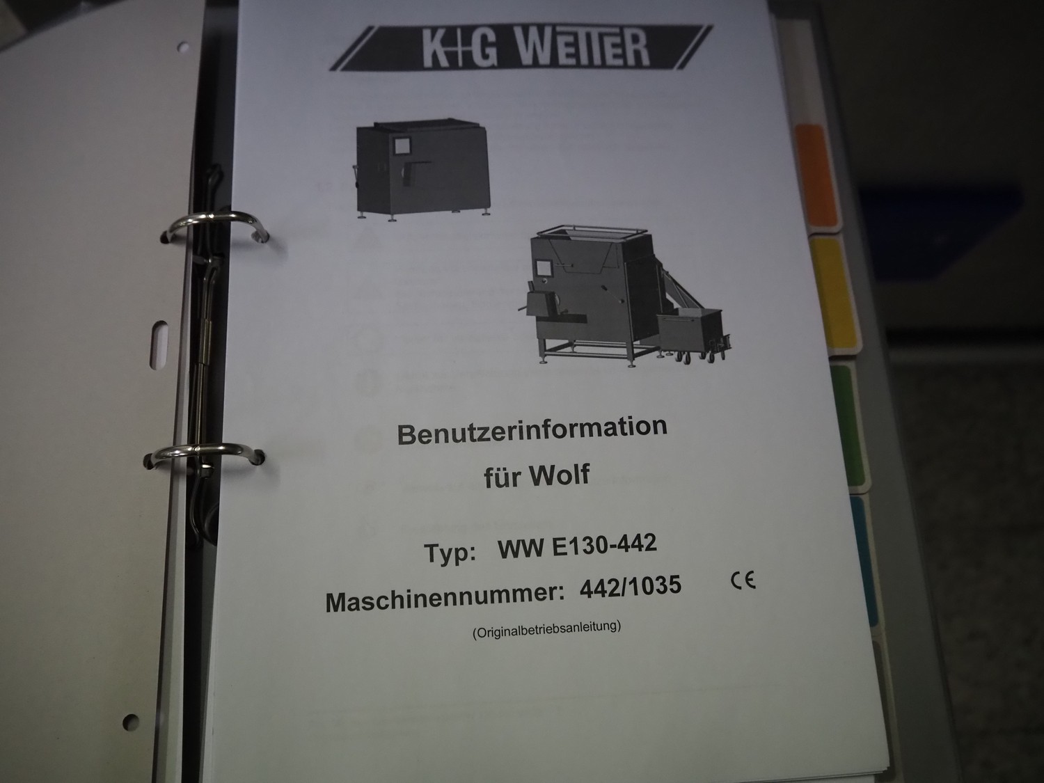 K+G Wetter grinder with lifter for 200 liter meat bins, type: WW E130-442, machine number: 442/1035, year of construction: 2020, 400 V, 3 Ph, 50 Hz, 40/50 A, 19 kW, plate diameter: 130 mm, total dimensions: 2600 mm x 1750 mm x 2200 mm. Including s/s tool trolley, dimensions: 850 mm x 800 mm x 1000 mm.