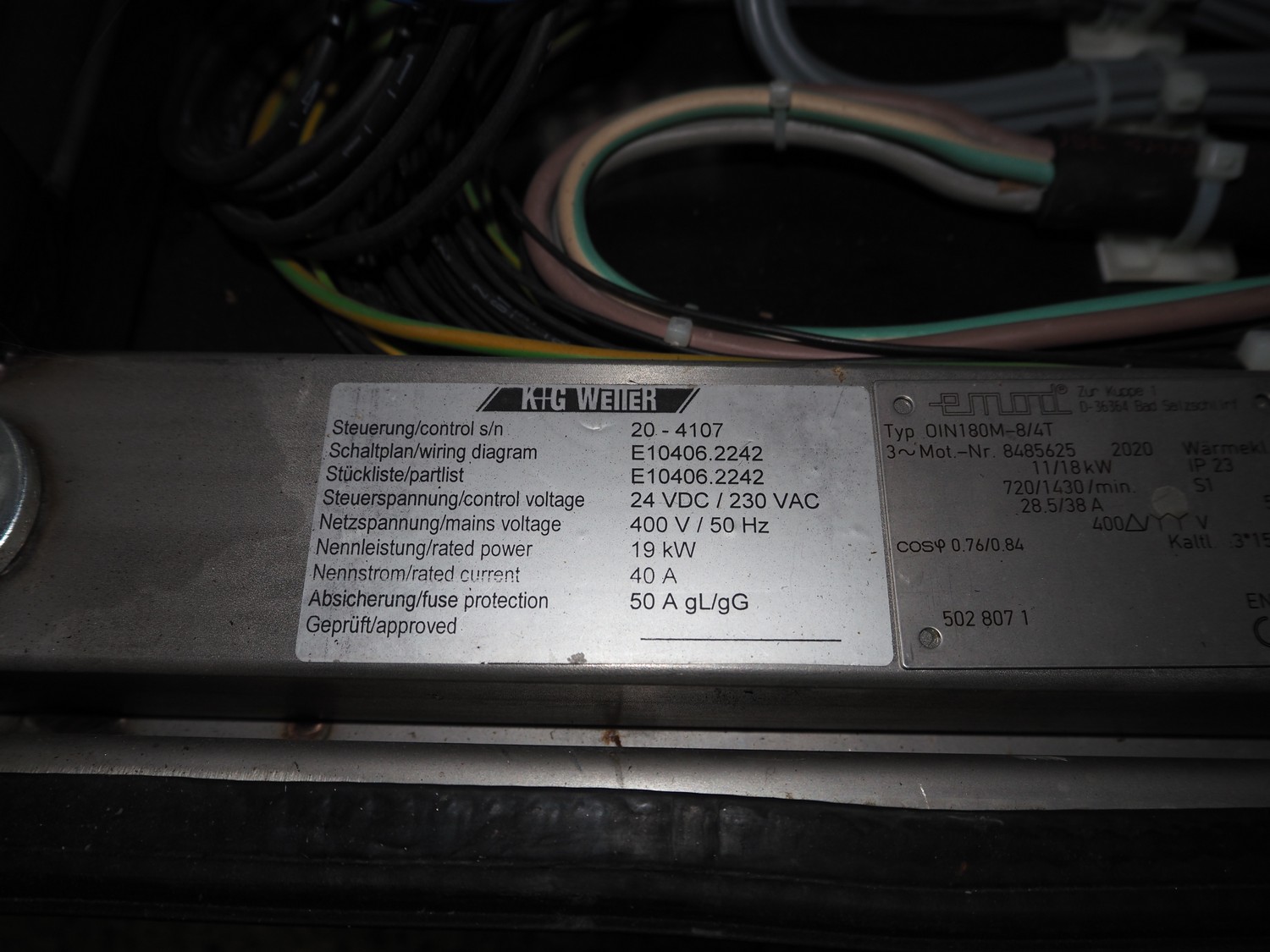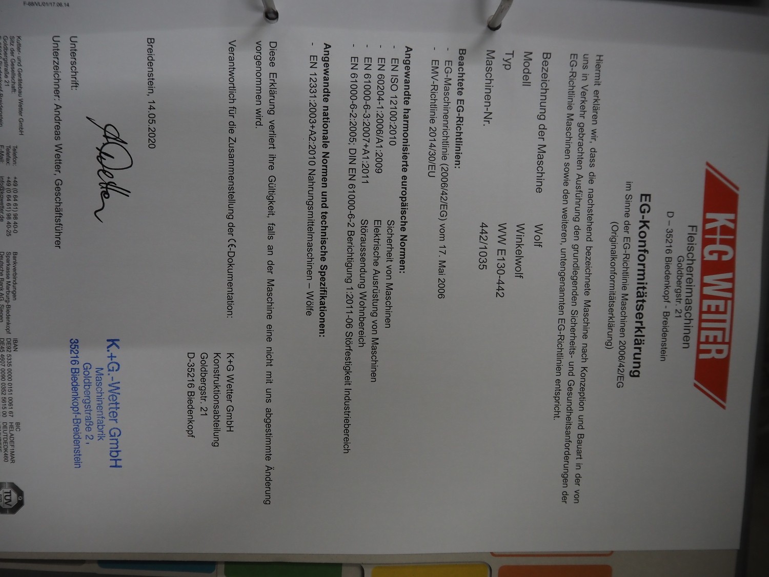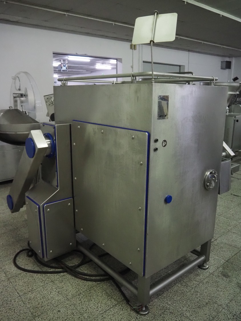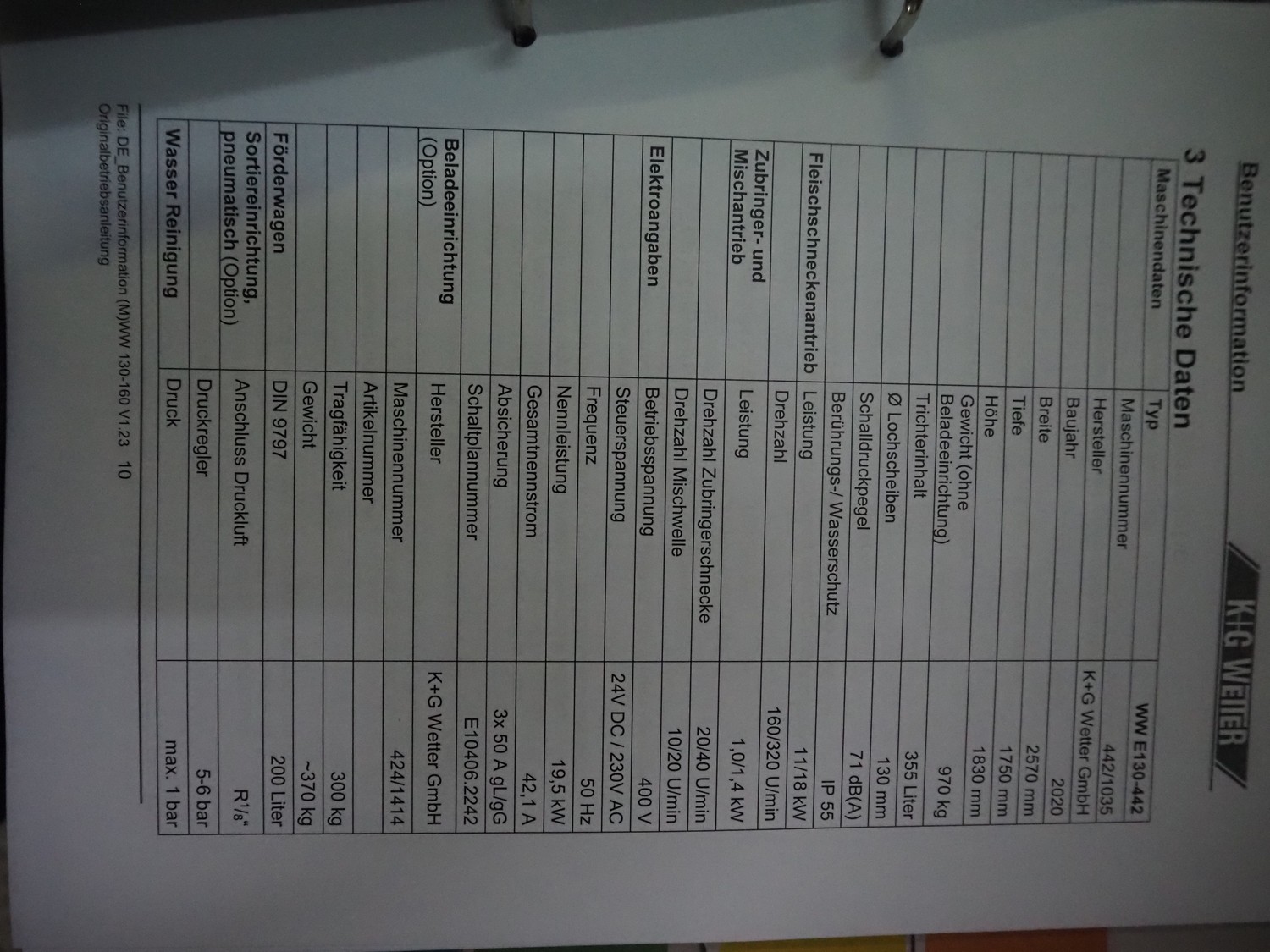 K+G Wetter grinder with lifter for 200 liter meat bins, type: WW E130-442, machine number: 442/1035, year of construction: 2020, 400 V, 3 Ph, 50 Hz, 40/50 A, 19 kW, plate diameter: 130 mm, total dimensions: 2600 mm x 1750 mm x 2200 mm. Including s/s tool trolley, dimensions: 850 mm x 800 mm x 1000 mm.