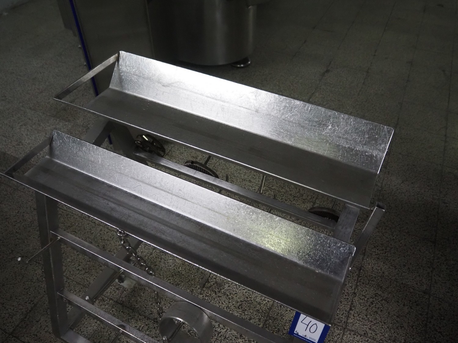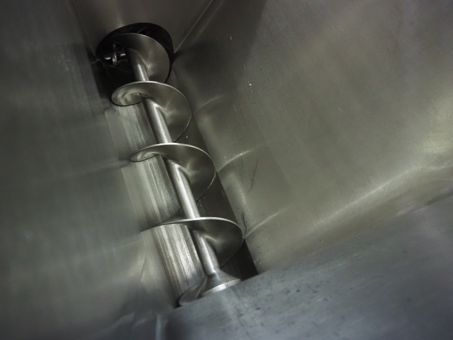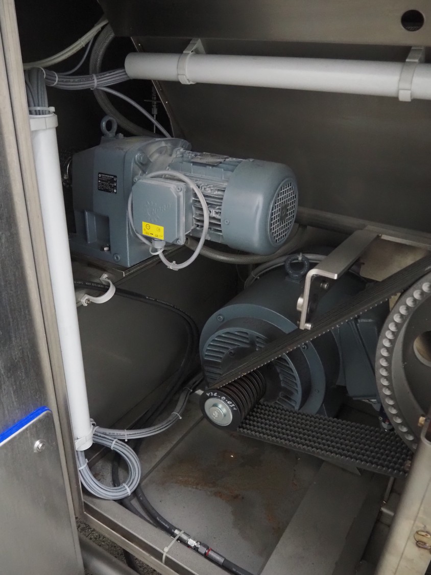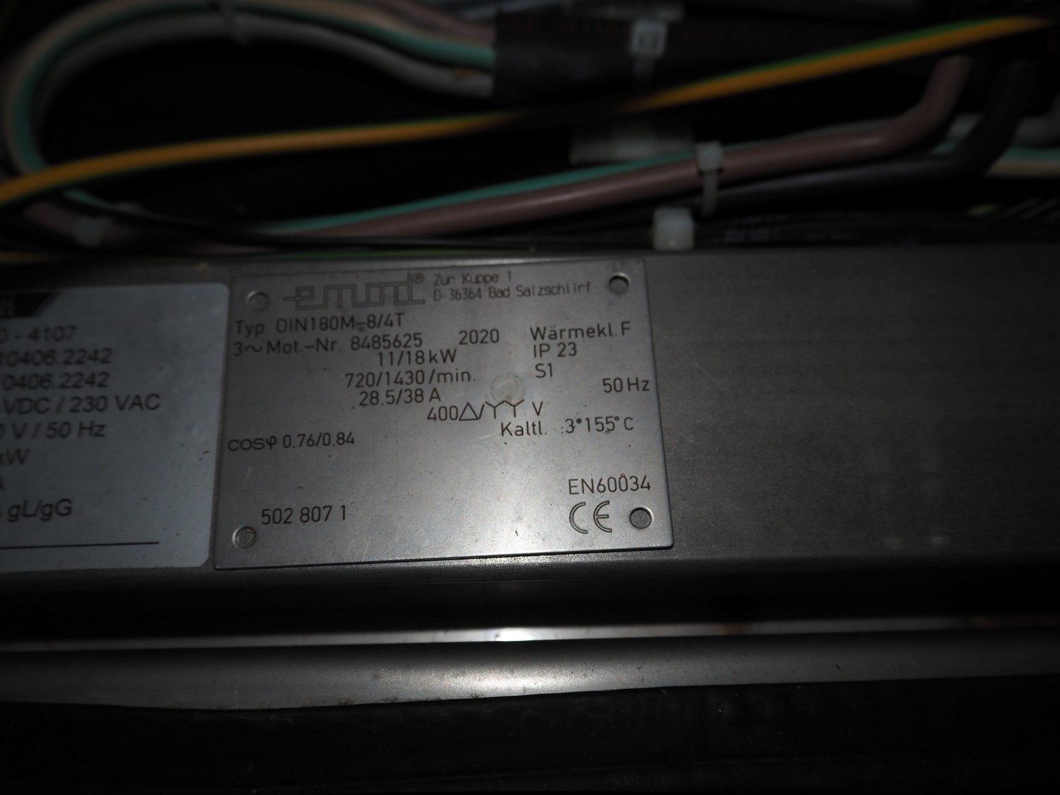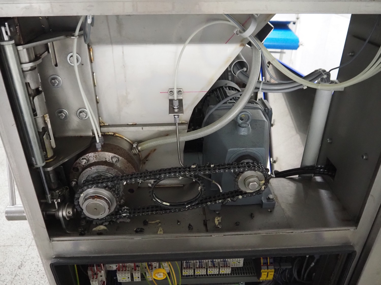 K+G Wetter grinder with lifter for 200 liter meat bins, type: WW E130-442, machine number: 442/1035, year of construction: 2020, 400 V, 3 Ph, 50 Hz, 40/50 A, 19 kW, plate diameter: 130 mm, total dimensions: 2600 mm x 1750 mm x 2200 mm. Including s/s tool trolley, dimensions: 850 mm x 800 mm x 1000 mm.