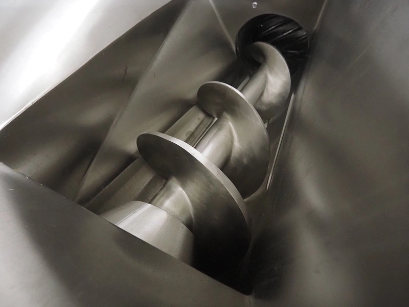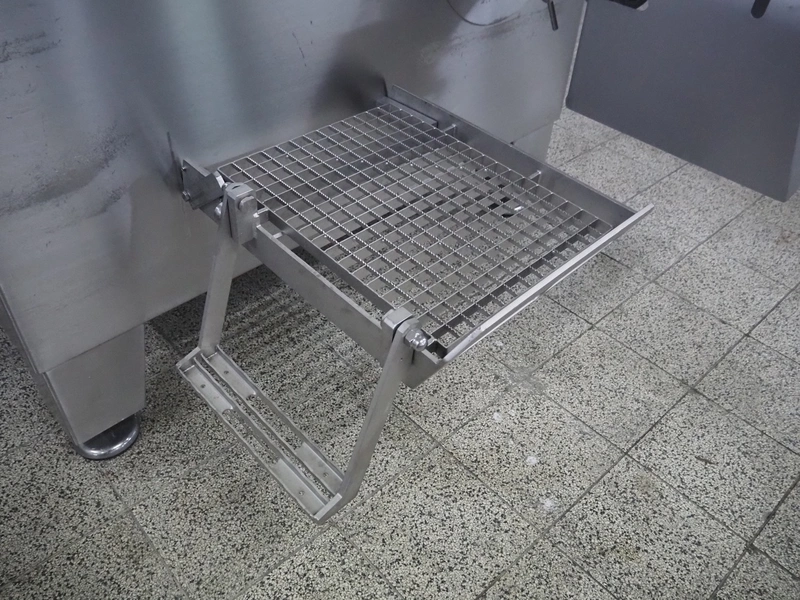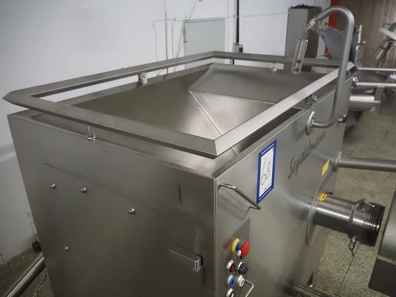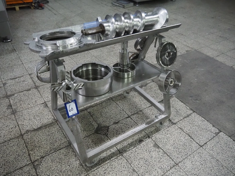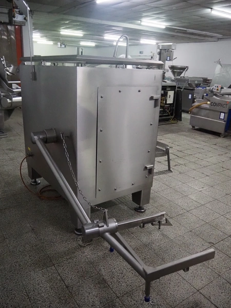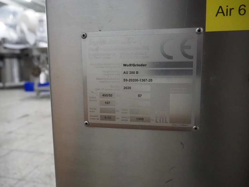 Seydelmann grinder with lifter for 200 liter meat bins, type: AU 200 B, serial number: S9-20200-1367-20, year of construction: 2020, 400 V, 50 Hz, 107 A, 57 kW, weight: 1900 kg, plate diameter: 200 mm, total dimensions: 2900 mm x 2100 mm x 2600 mm. Including s/s tool trolley with auger, knifes and plates, dimensions trolley: 950 mm x 600 mm x 900 mm.
