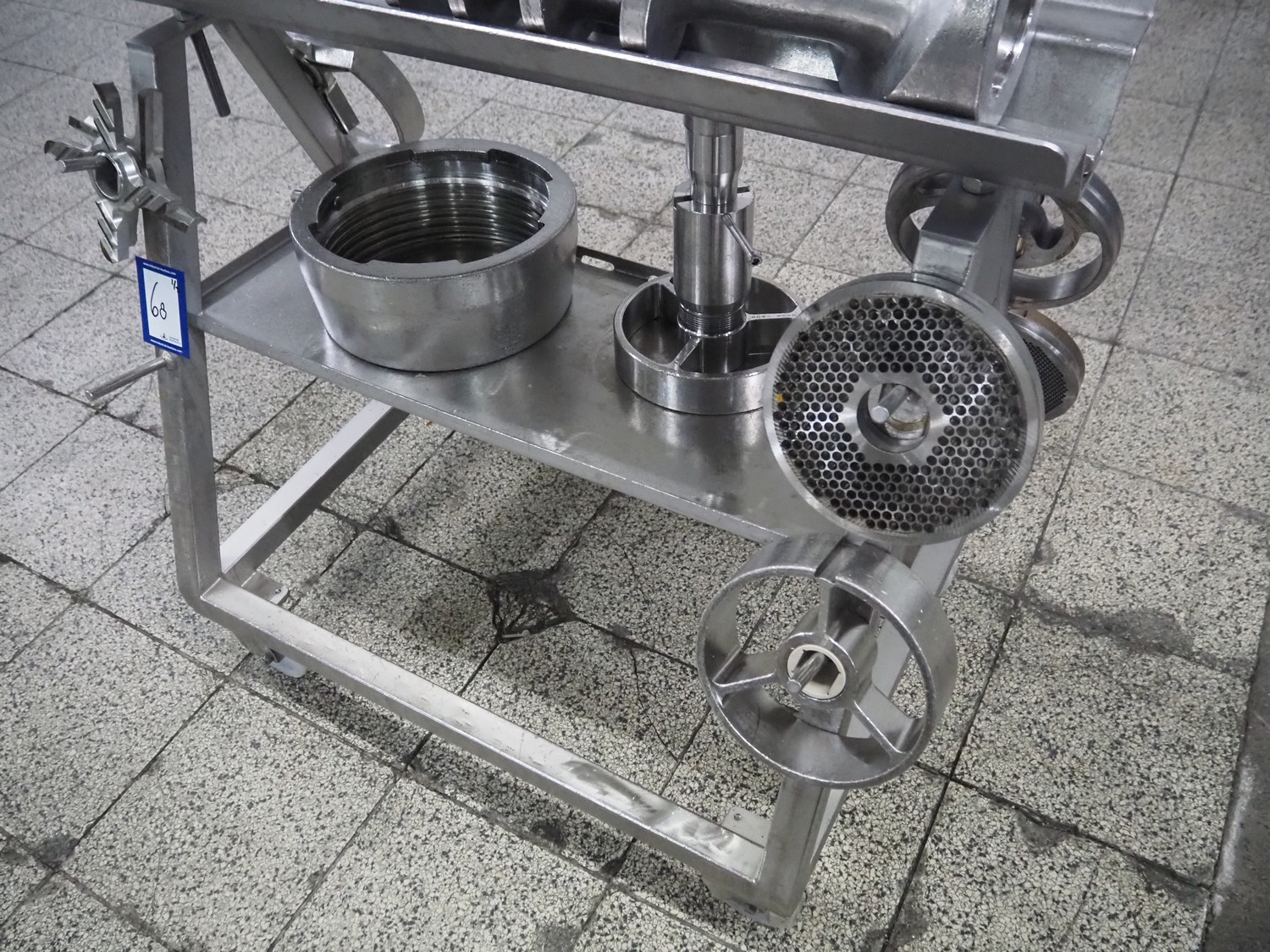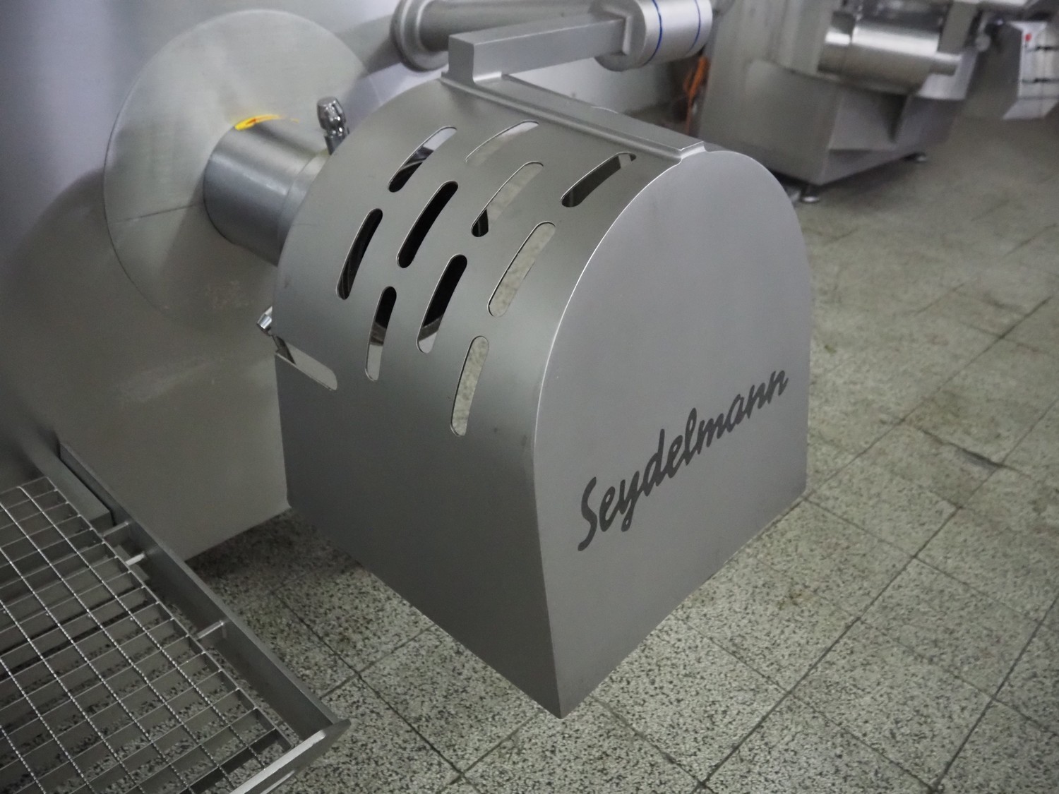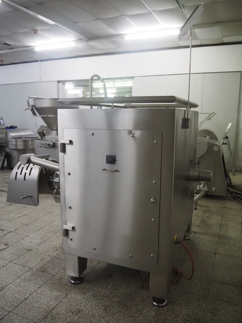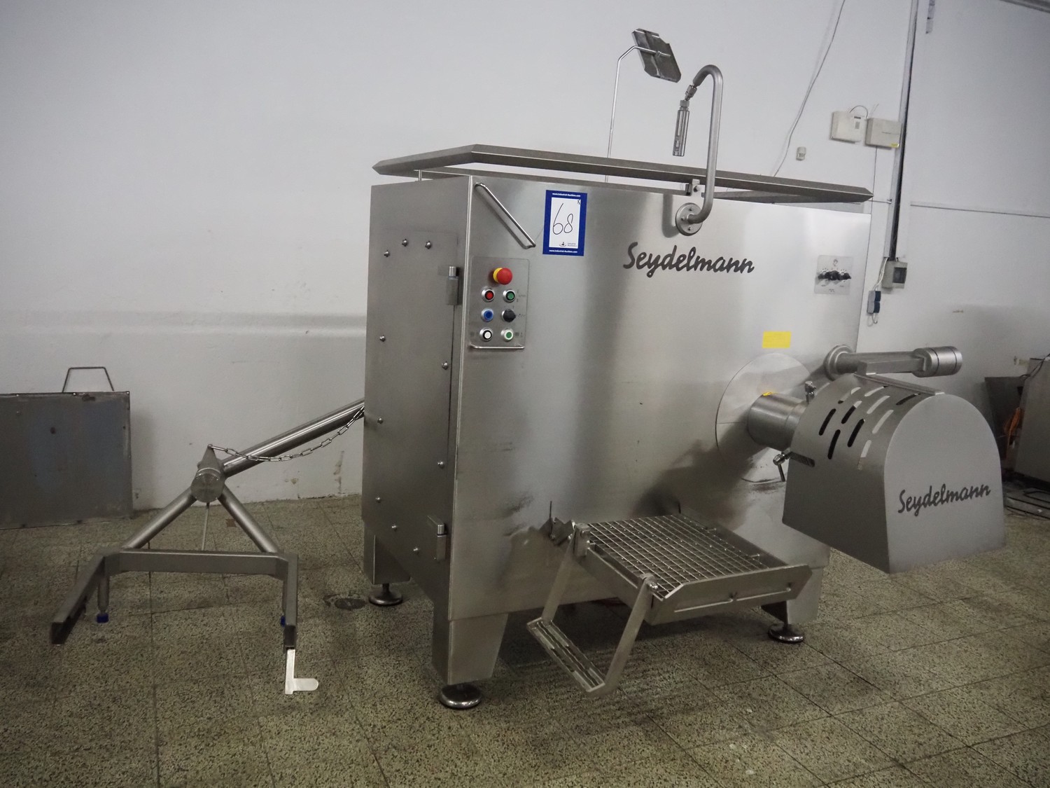 Seydelmann grinder with lifter for 200 liter meat bins, type: AU 200 B, serial number: S9-20200-1367-20, year of construction: 2020, 400 V, 50 Hz, 107 A, 57 kW, weight: 1900 kg, plate diameter: 200 mm, total dimensions: 2900 mm x 2100 mm x 2600 mm. Including s/s tool trolley with auger, knifes and plates, dimensions trolley: 950 mm x 600 mm x 900 mm.