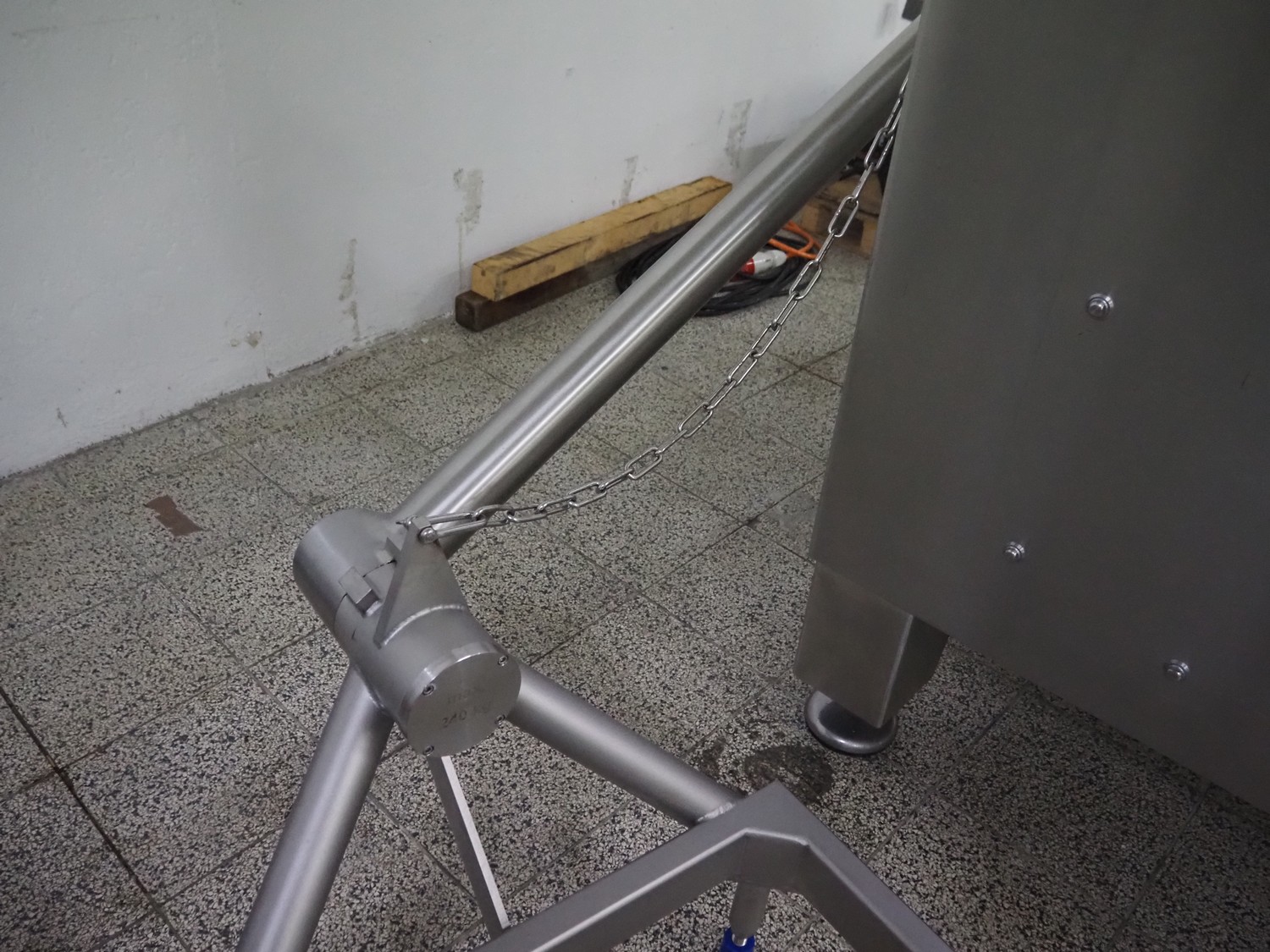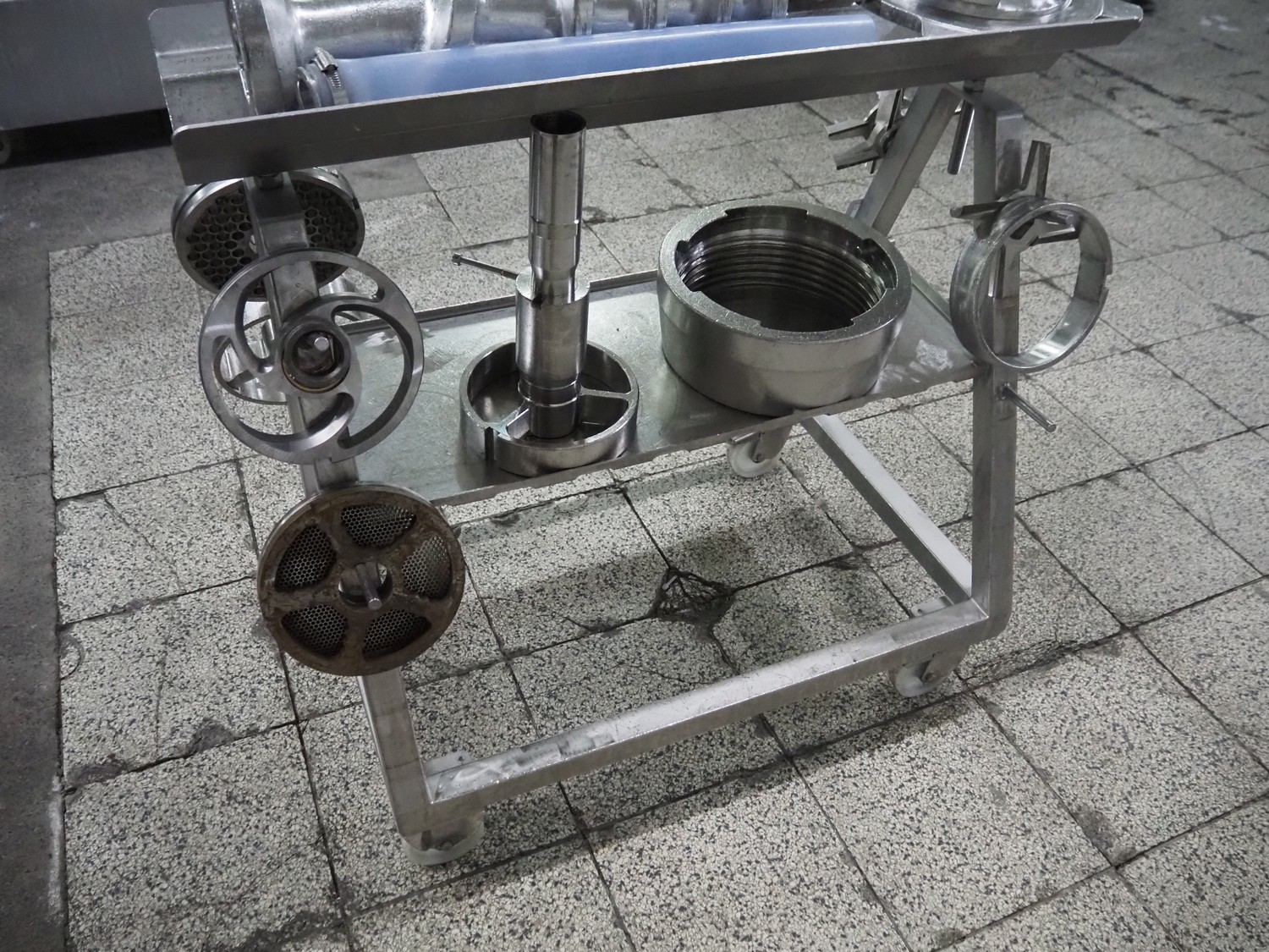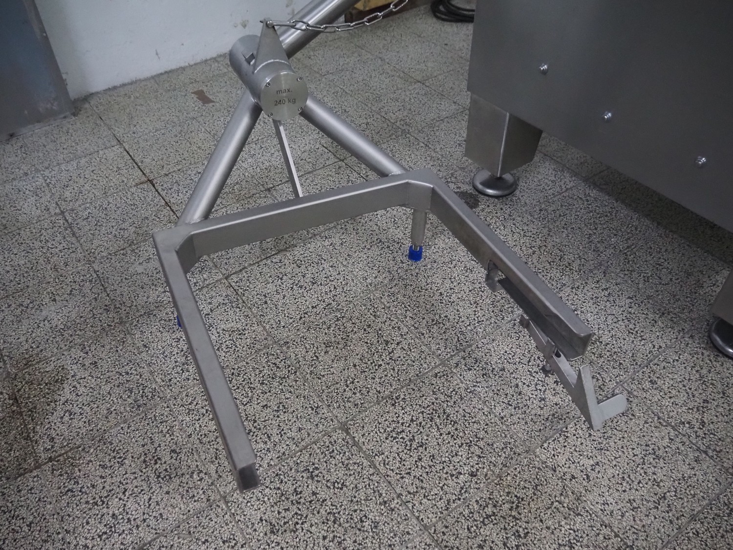 Seydelmann grinder with lifter for 200 liter meat bins, type: AU 200 B, serial number: S9-20200-1367-20, year of construction: 2020, 400 V, 50 Hz, 107 A, 57 kW, weight: 1900 kg, plate diameter: 200 mm, total dimensions: 2900 mm x 2100 mm x 2600 mm. Including s/s tool trolley with auger, knifes and plates, dimensions trolley: 950 mm x 600 mm x 900 mm.