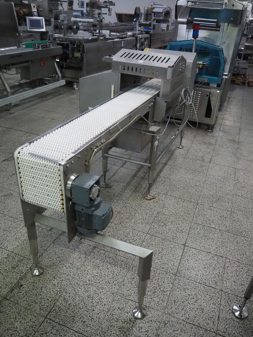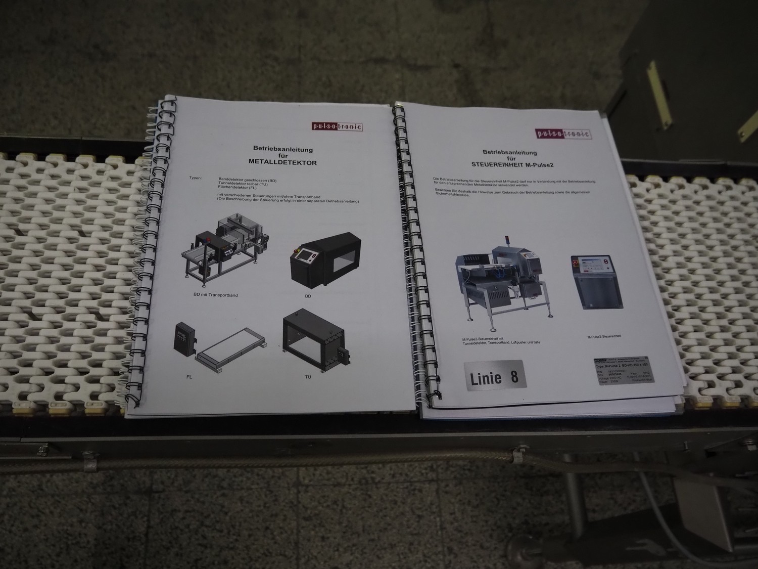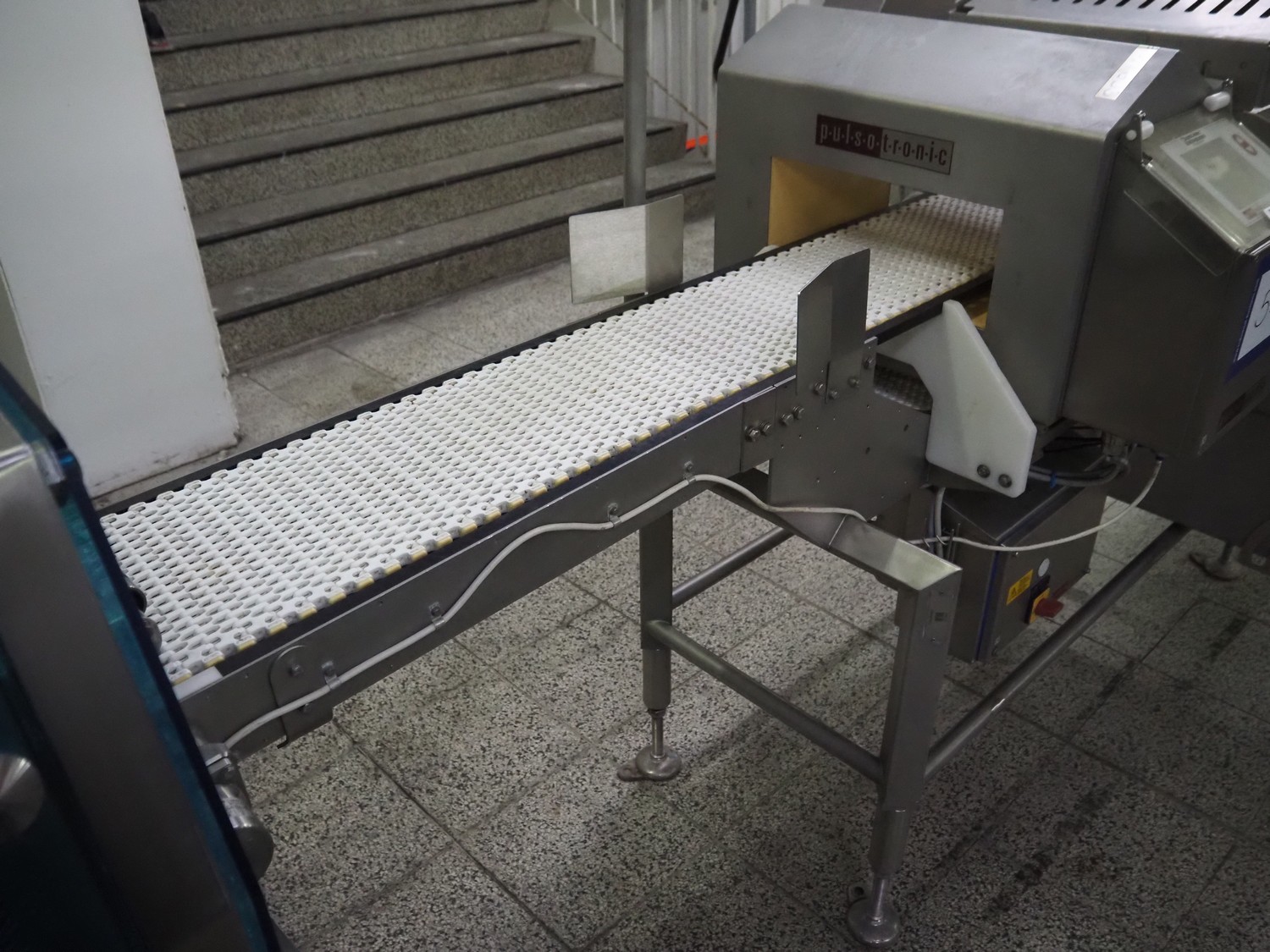 Pulsotronic metal detector with rejector, type: M-Pulse 2 BD-HD 350x150 LPW MFT, serial number: 90007273, year of construction: 2018, 115/230 VAC, 50-60 Hz, plastic mesh belt, belt width: 240 mm, clearance: 350 mm x 115 mm, total dimensions: 3500 mm x 1000 mm x 1440 mm.