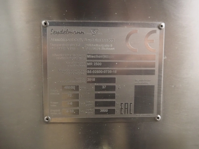 Seydelmann double shaft ribbon mixer, type: MR 2500, serial number: S6-02500-0739-18, year of construction: 2018, 400 V, 50 Hz, 72 A, 37 kW, weight: 3500 kg, volume: 2500 liter, dimensions: 3400 mm x 2100 mm x 2600 mm.