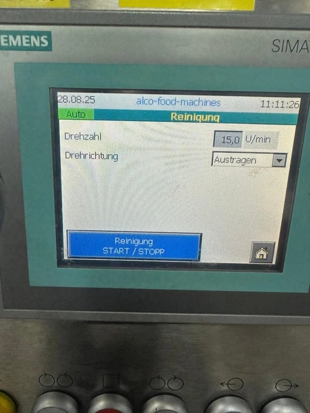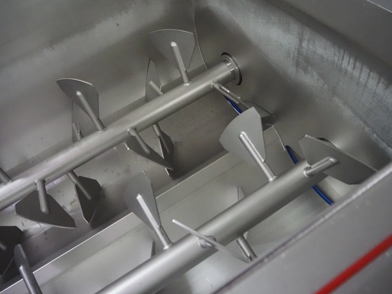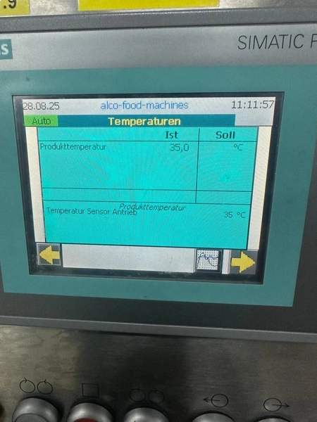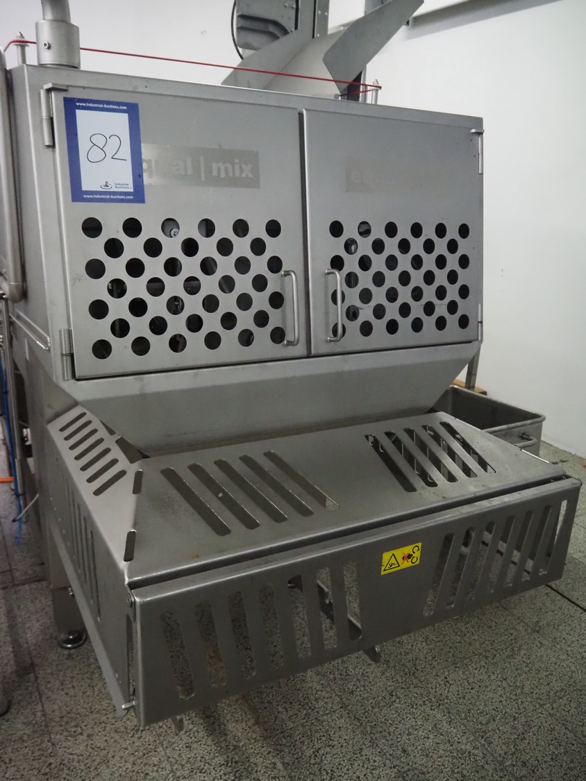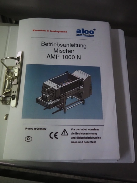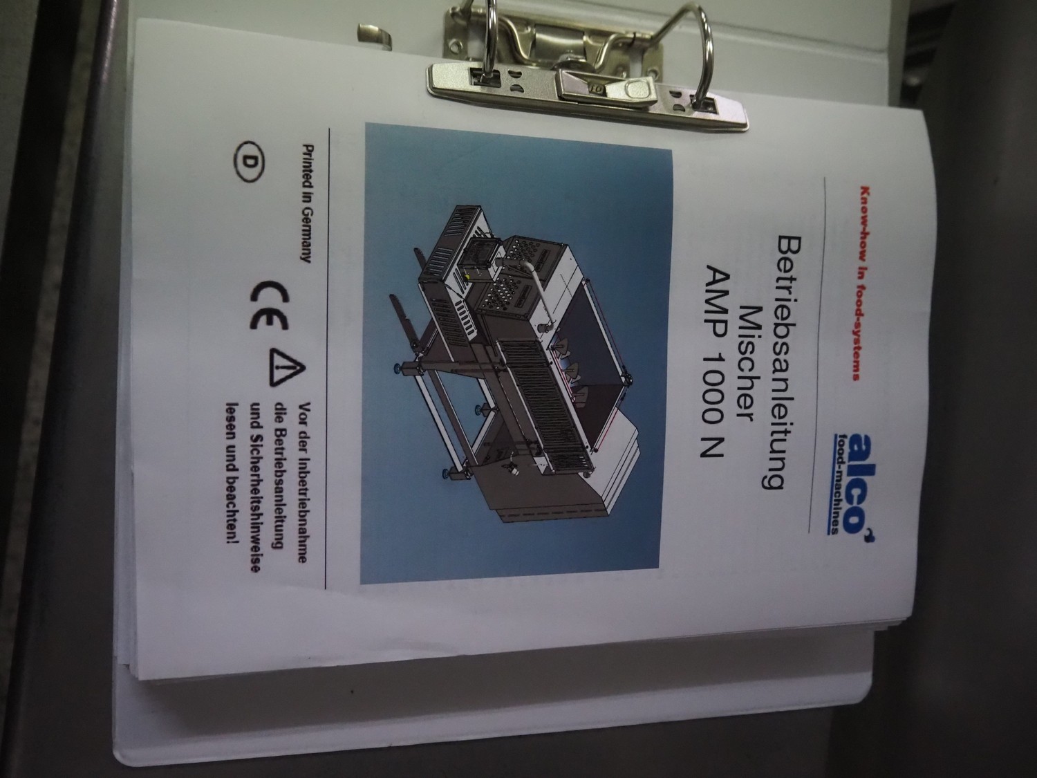 Alco food machines GmbH double shaft paddle mixer on weighing cells, type: AMP 1000N, 01602224, year of construction: 2013, 400 V, 3 Ph, 50 Hz, 50 A, 11 kW, volume: 1000 liter, weight: 1600 kg, total dimensions: 3500 mm x 1200 mm x 2400 mm.
