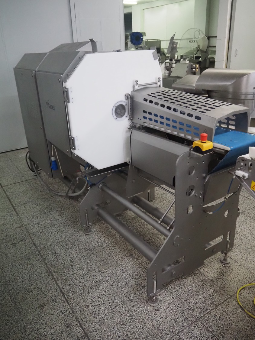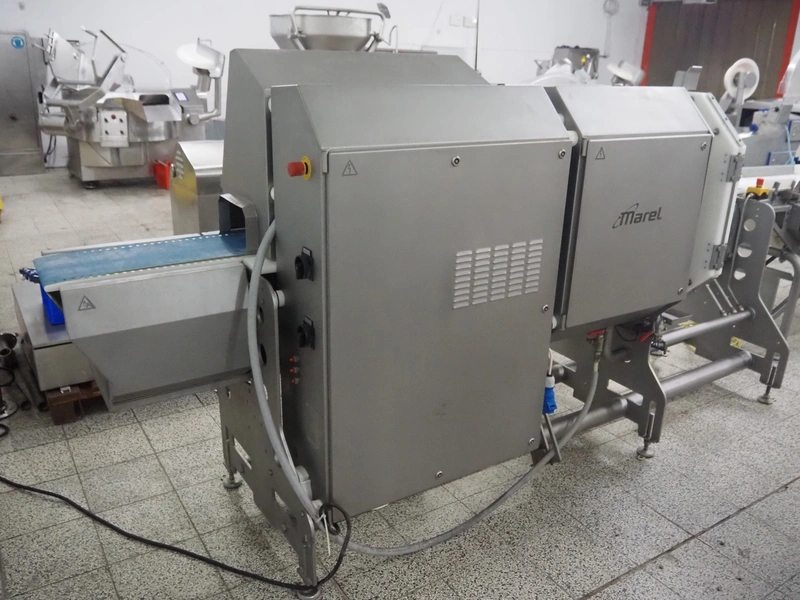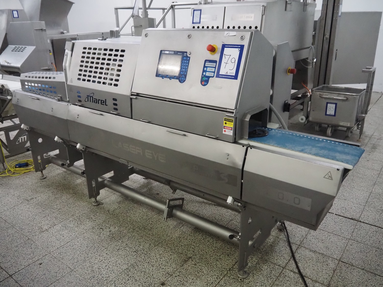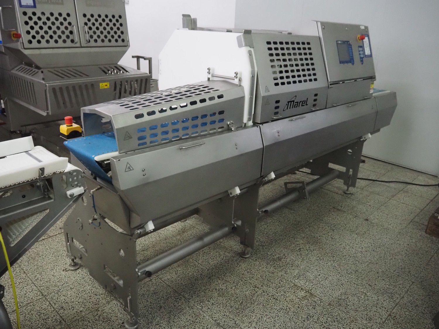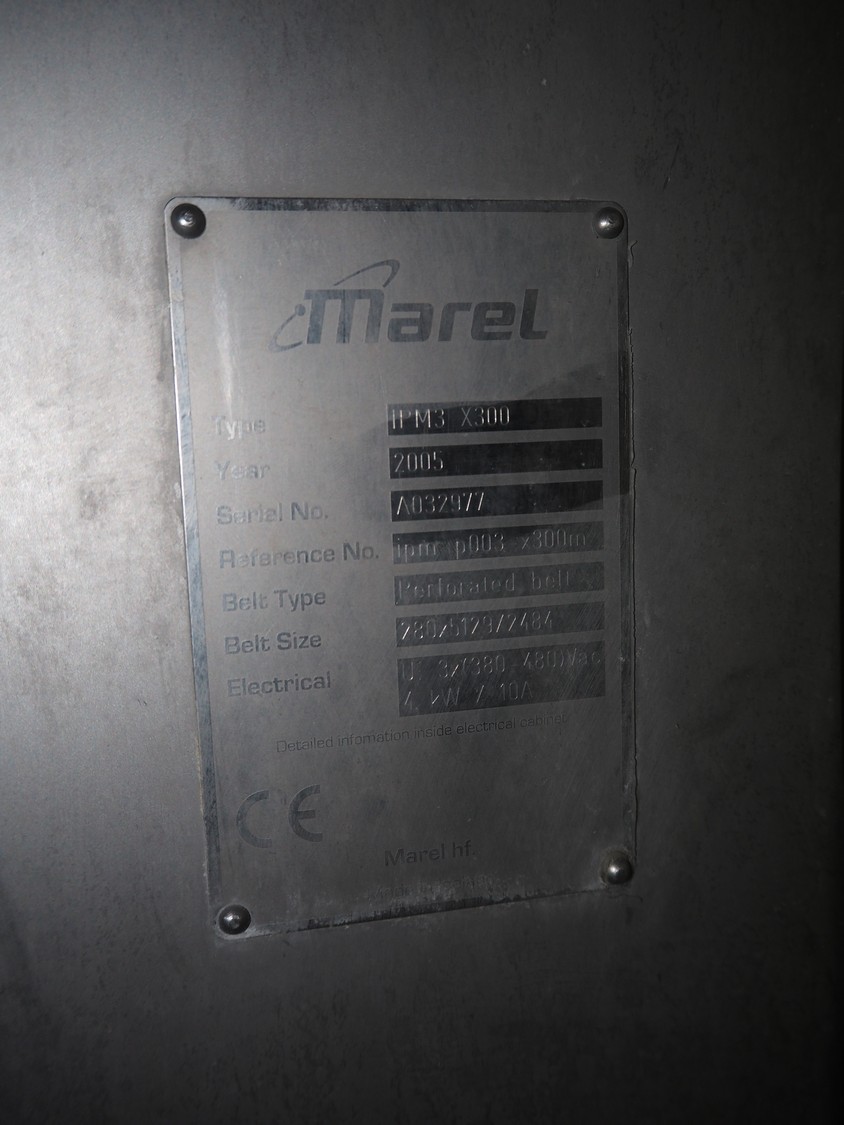 Marel optical portion cutter, type: IPM3 X300, serial number: A032977, year of construction: 2005, 380–480 V, 3 Ph, 50 Hz, 4 kW, 10 A, plastic belt, belt width: 280 mm, clearance: 255 mm x 140 mm, total dimensions: 3300 mm x 950 mm x 1600 mm. Including crate with parts.